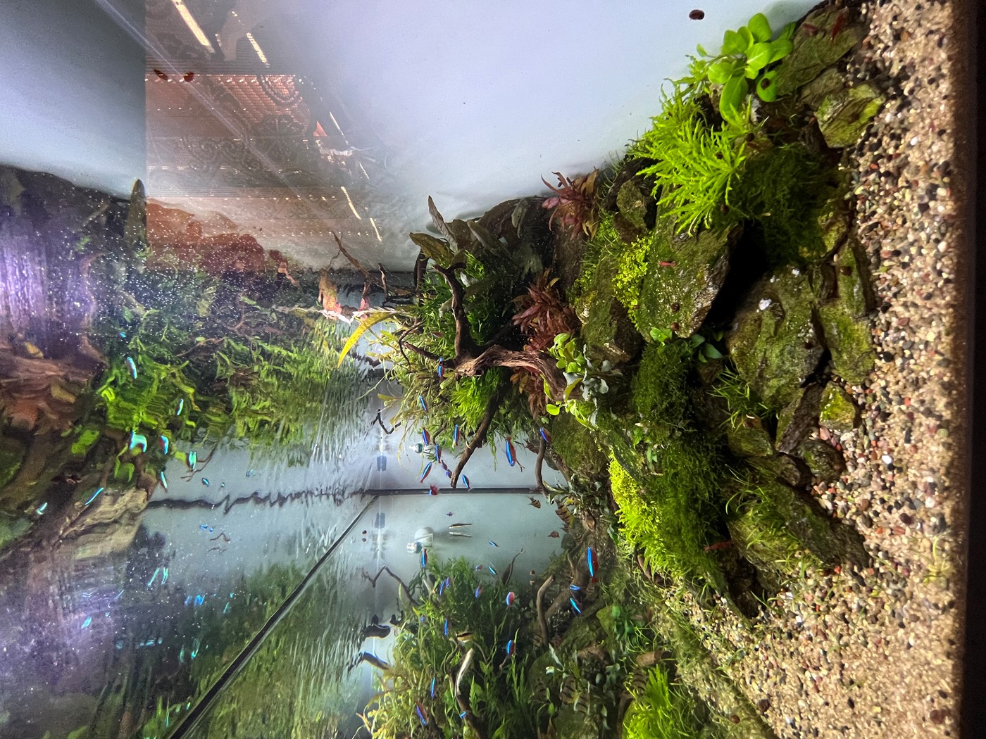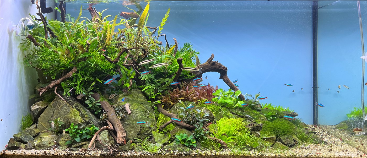 I made this aquarium for my friend who asked me to make “winter hotel” for the huge amount of fish living outside in his garden pond during summer. It is mixture of all kinds livebearers (Gupies, Platies, Red swordtails, Black Molly, etc. ) and therefore we had to approach this task accordingly. As a base for our project we used JUWEL RIO 350 Aquarium set. This type of set contain an aquarium with a built in filter and light. The lights and filtration are quite simple but as you can see, when you choose right plants, substrate and add pressurised CO2 you can achieve nice healthy growth.