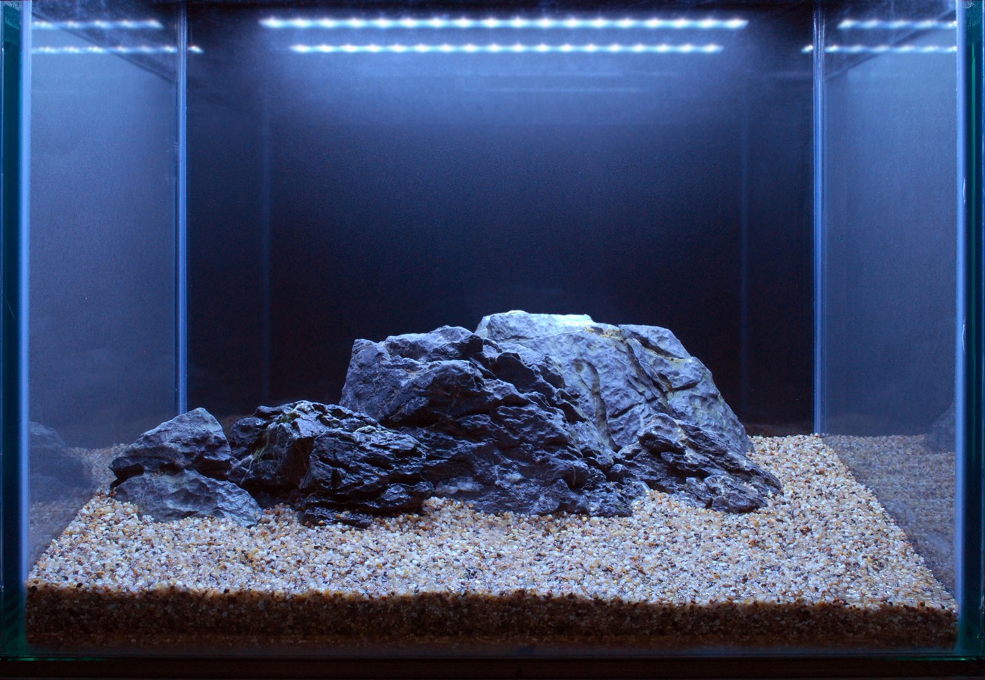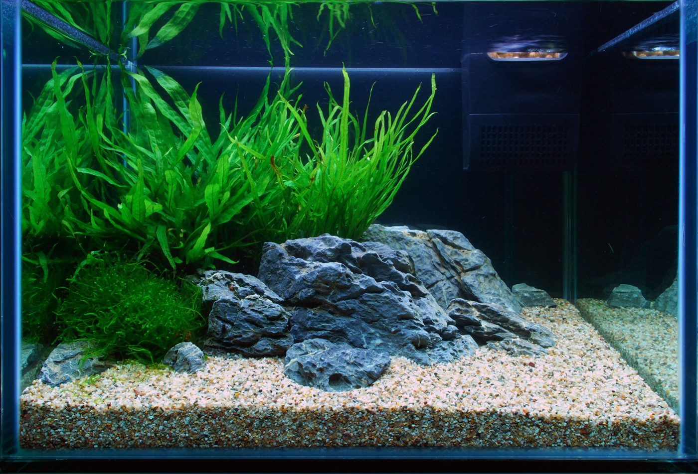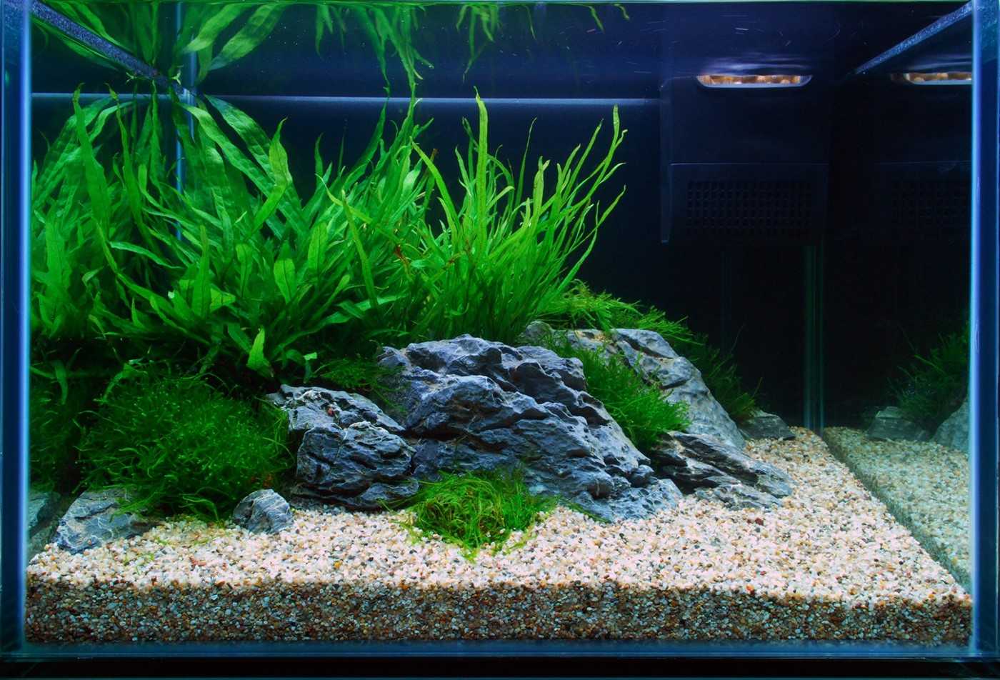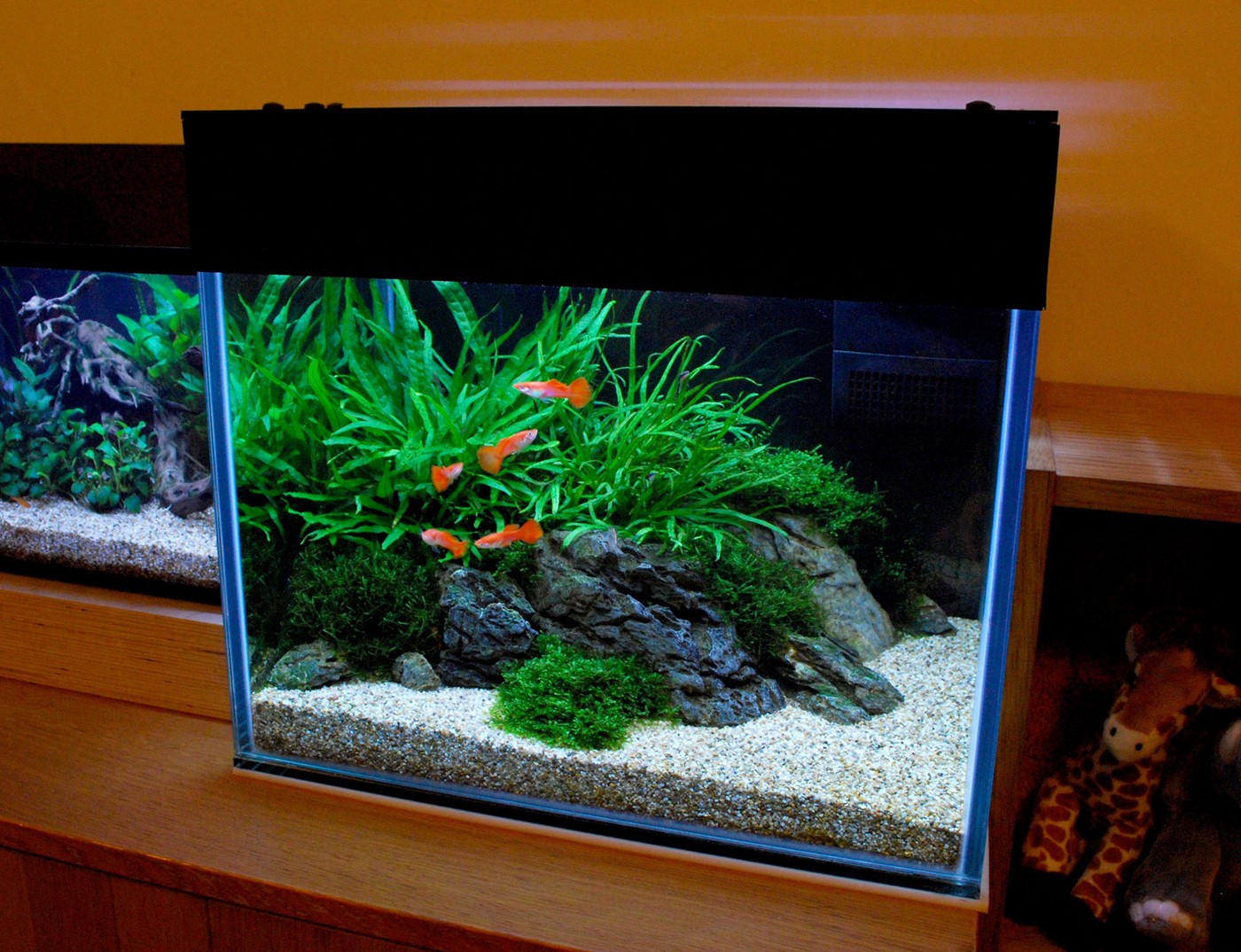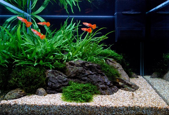 I set up this aquarium for my toddler as he had shown a keen interest in Guppy. I wanted the setup to be both easy to install and to maintain. I primarily used Tropica AquaDecor to speed up the planting process and chose species that would thrive without CO2 injection. By adding a cleaning crew that consisted of 5 Amano shrimps and 4 Otocinclus catfish maintenance was kept to an absolute minimum.