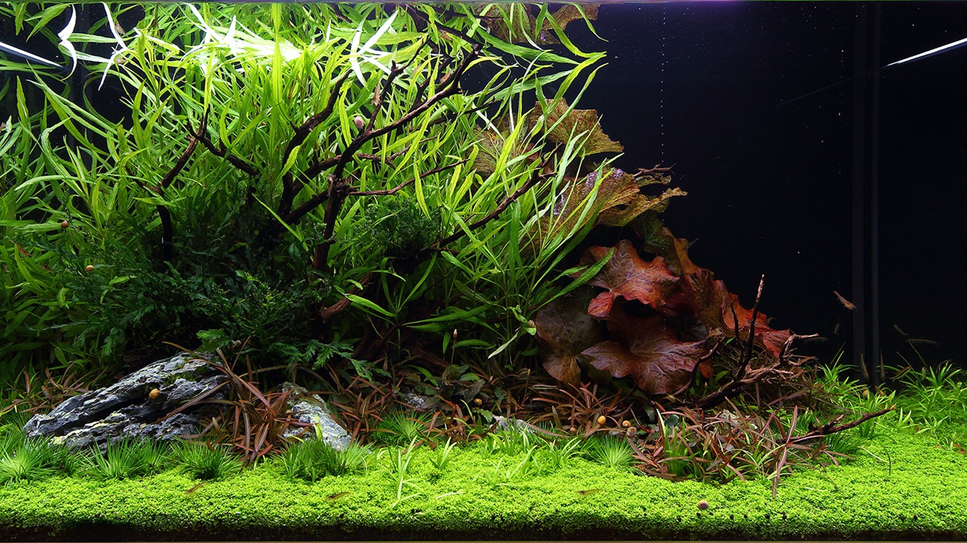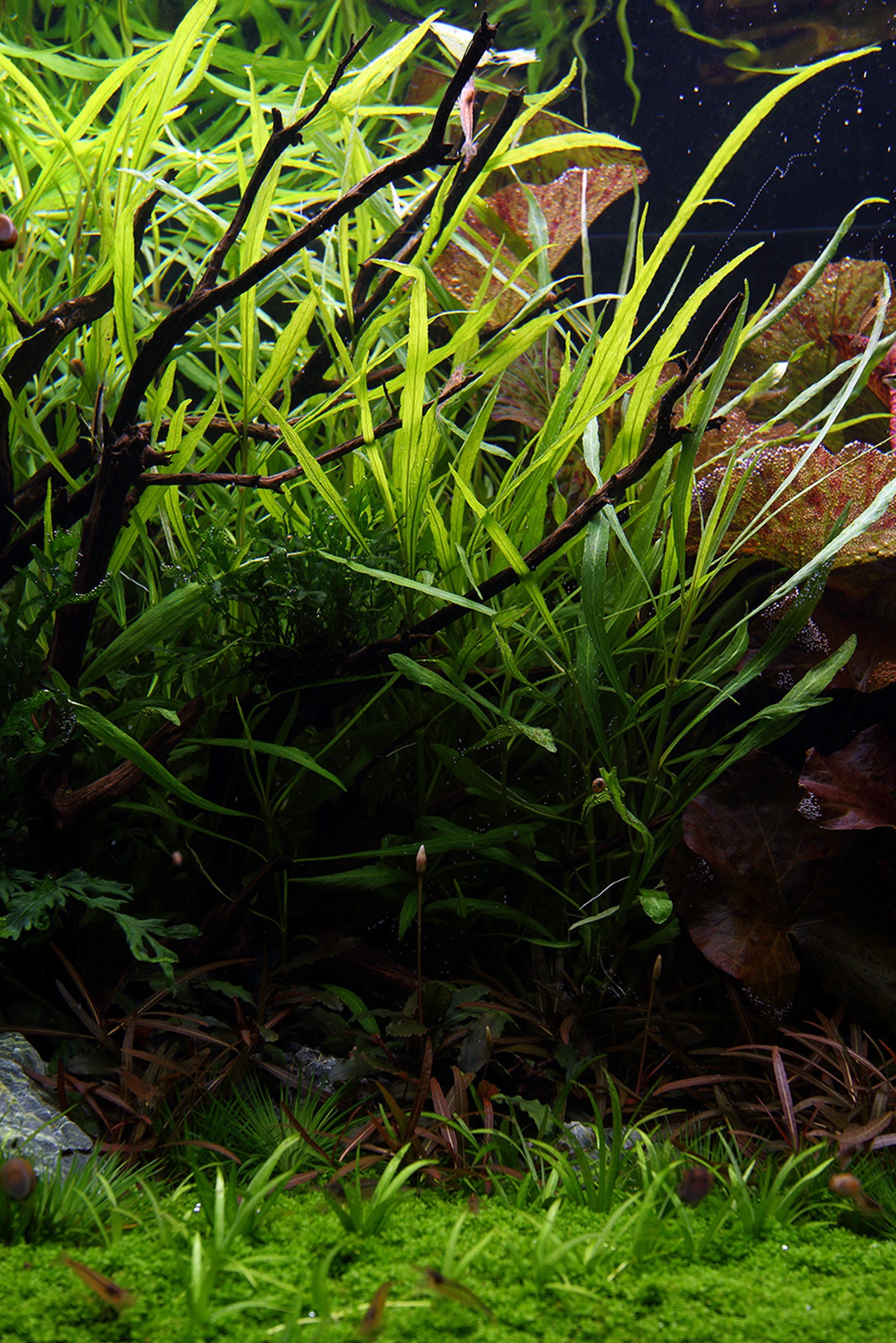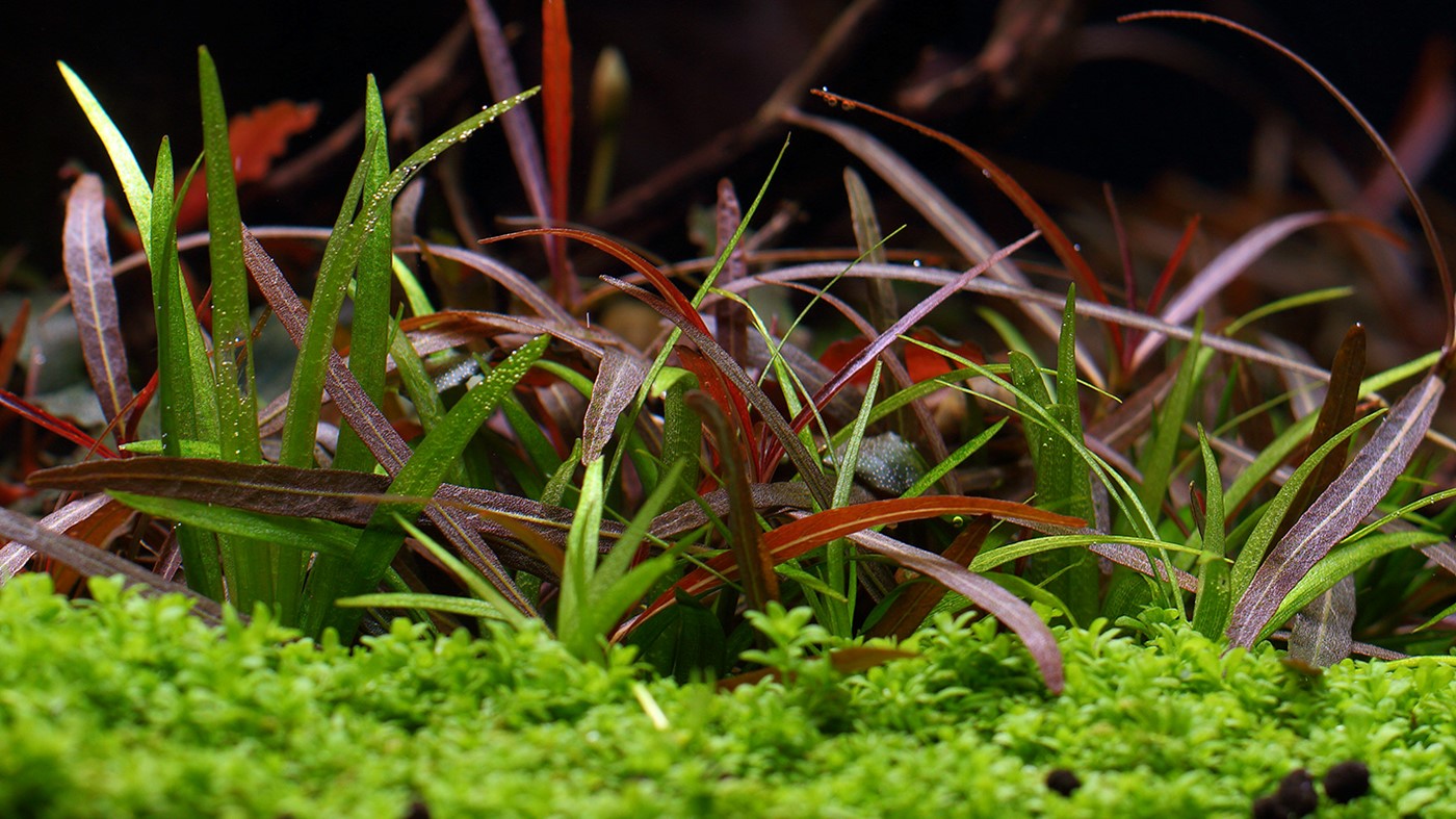 Bright green colours of Hygrophila costata and Hemianthus ’Cuba’ enclose and contrast the deep, green Bolbitis and the