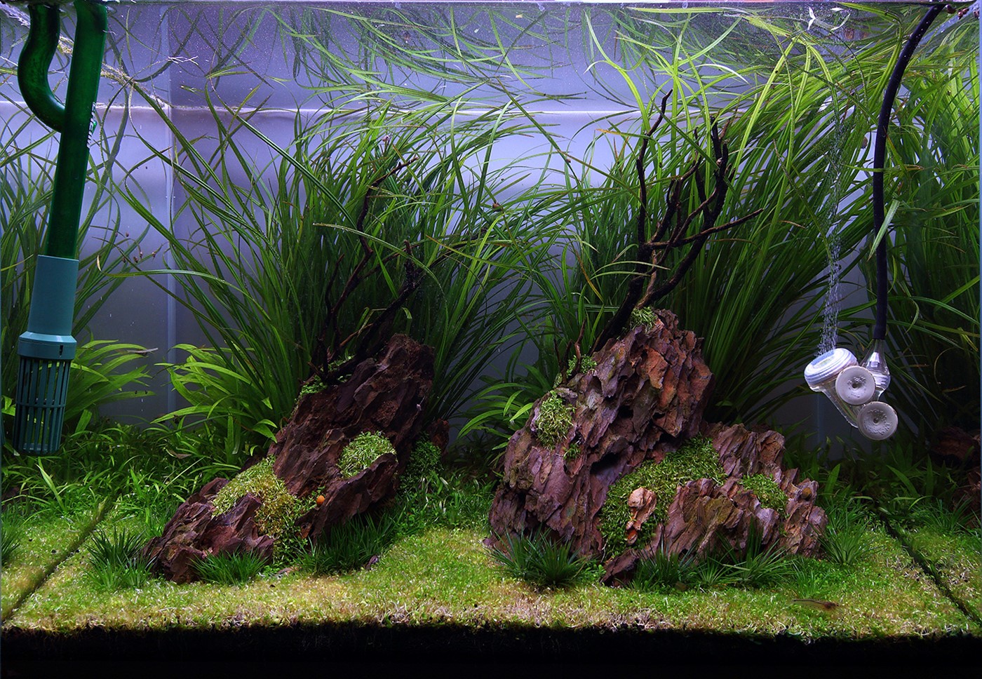 A tall aquarium almost calls for upright hardscape and slim, grassy plants like the Cyperus helferi and Eriocaulon.