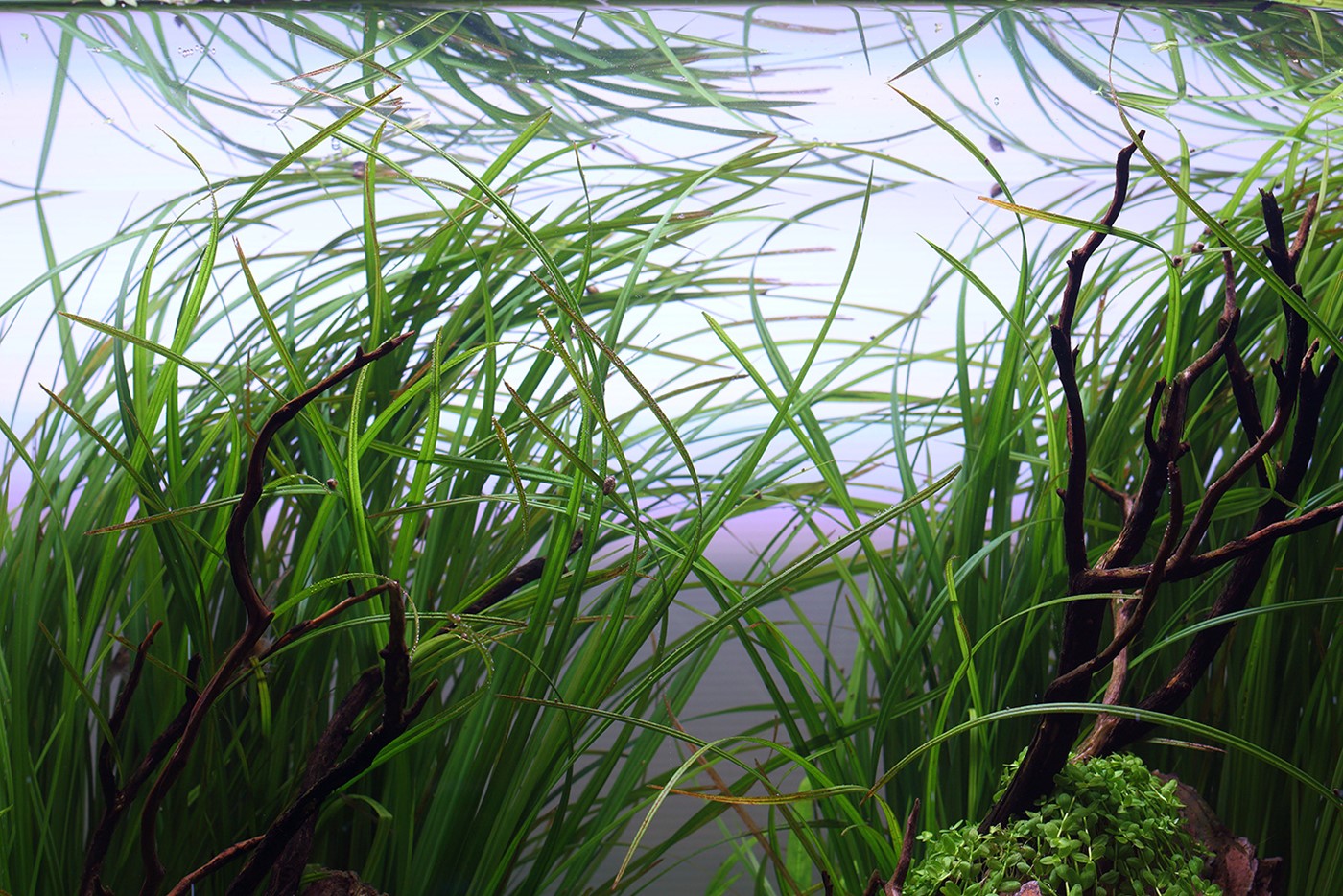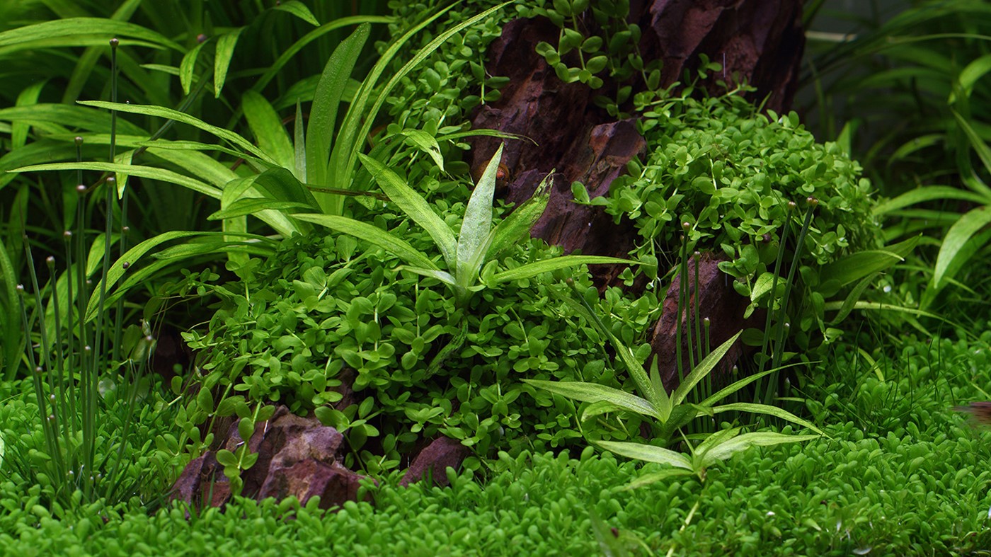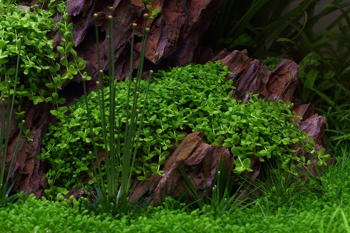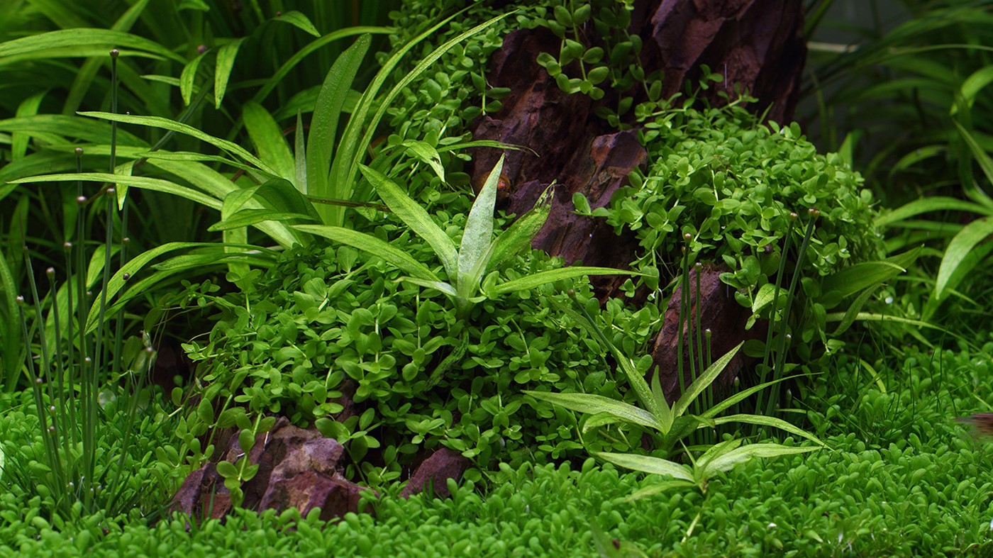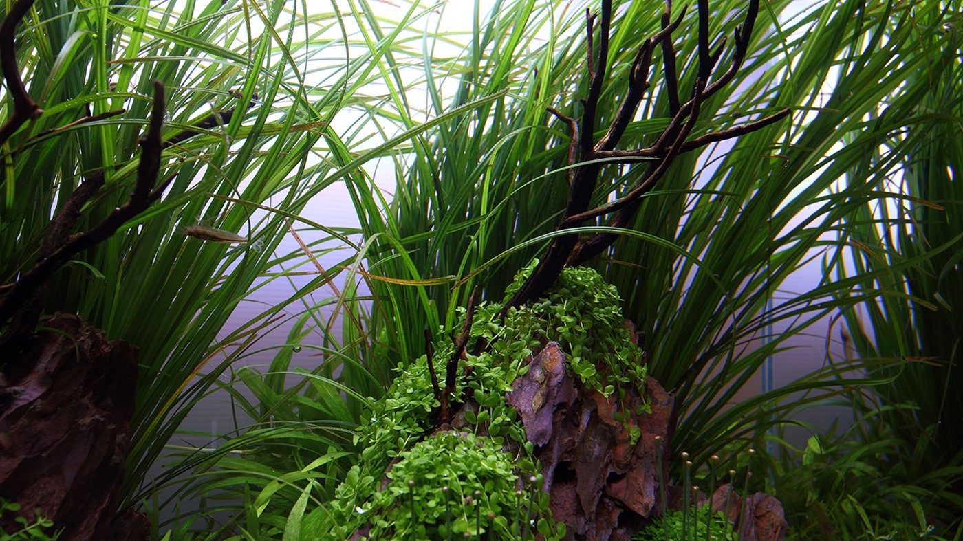 To soften the appearance a little, we attached small tufts of Micranthemum ’Monte Carlo’ to the dragonstone and created a lawn of Elatine hydropiper.