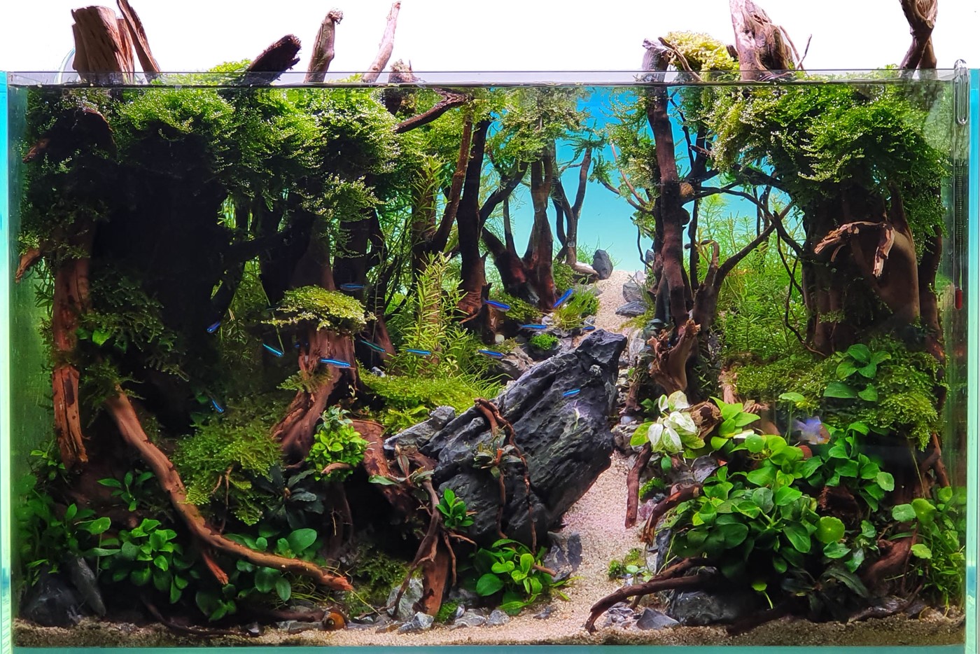 "This was my first serious approach for IAPLC contest in 2020 and I had the goal to rank arround 350. Finally I achieved a 365 place. The tank was hard to maintain since I created to close to the front and had nearly any place for maintenance or plant growth. I worked several times on the layout which can be seen in the images of different stages of the tank. I also added lots of different plant species after initial setup."