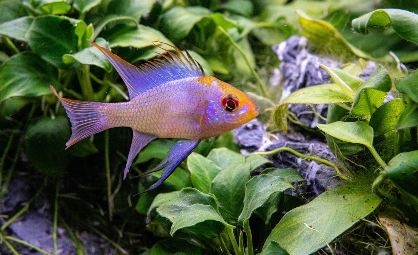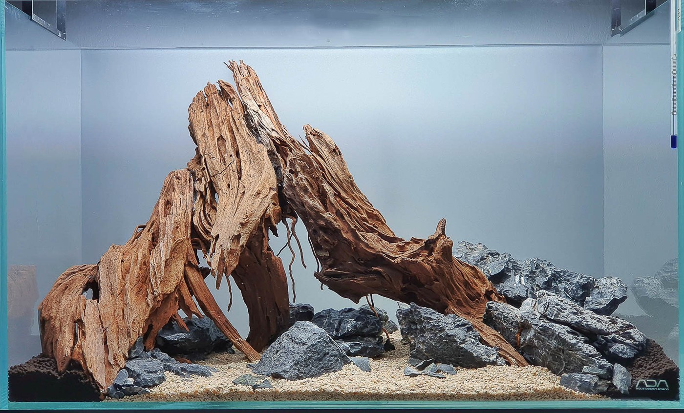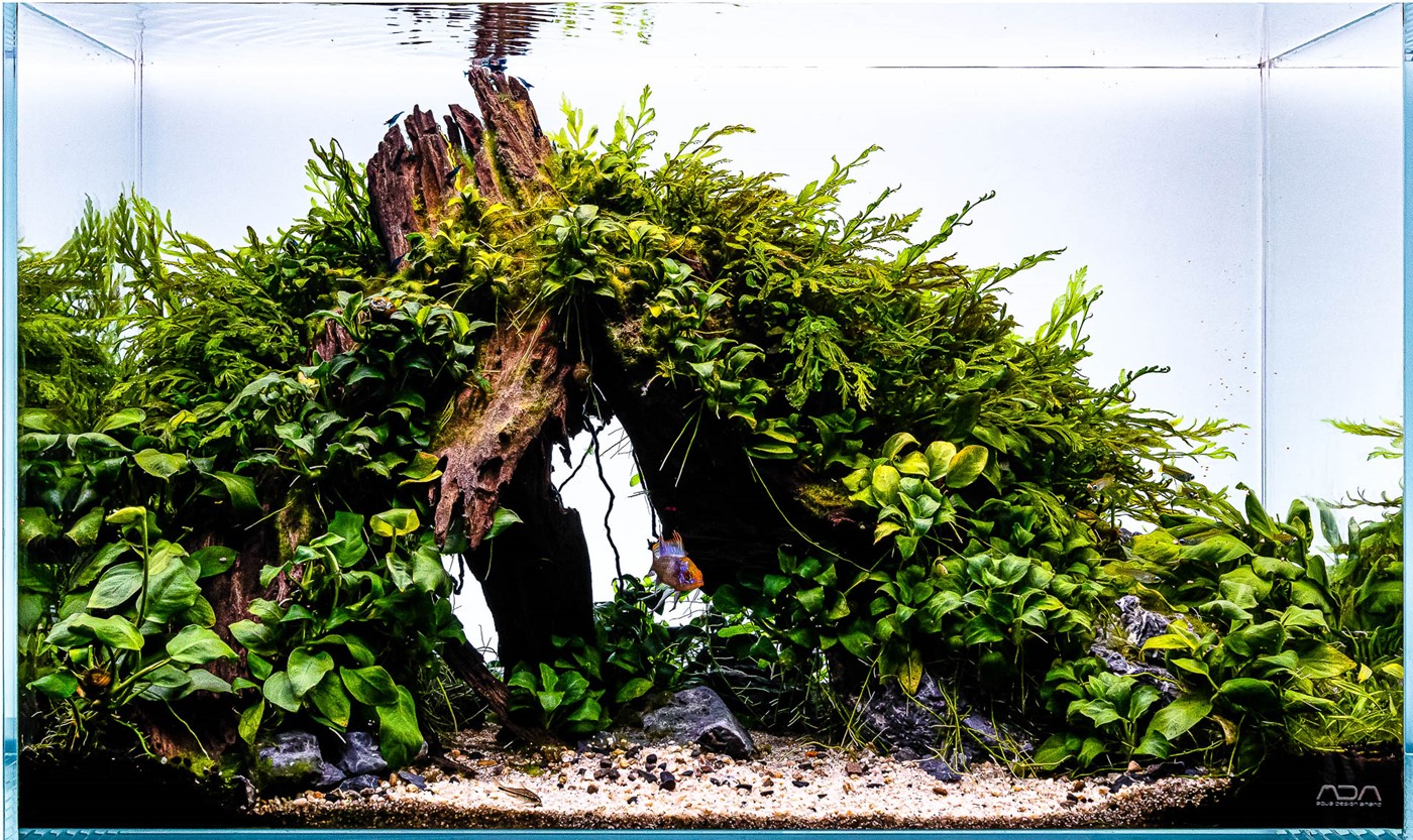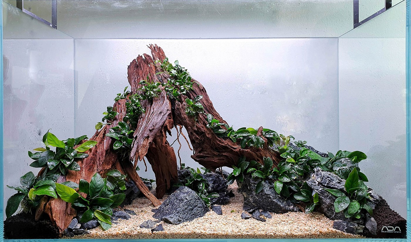 This scape has only african Plants, Anubias and Bolbitis. I used the taller leaves on the front bottom of the aquarium and arranged the smaller sized anubias 'petite' on the higher spots to create a better illusion of scale in this scape. In the beginning I wanted to only keep african fish aswell and started with Aplocheilichthys normani, an Westafrican Fish that is very agile. But after a couple of weeks I had to find a home for other fish I kept, so I started mixing it up a bit and added Microgeophagus Ramirezi Electric Blue and Corydoras Hastatus after a while. The whole layout is made by a few Black Seiryu stones and 5 pieces of Yati Wood that are glued with super glue. I added some Spiderwood under the Yati wood to provide a bit more of a jungle look with roots crawling down the massive central tree. I am quite happy with the result of this tank but had to shut it down due to a massive Cladophora (Algae) Invasion that was very hard to treat."