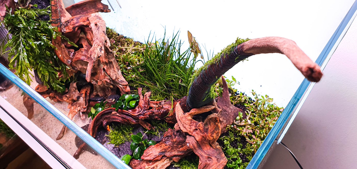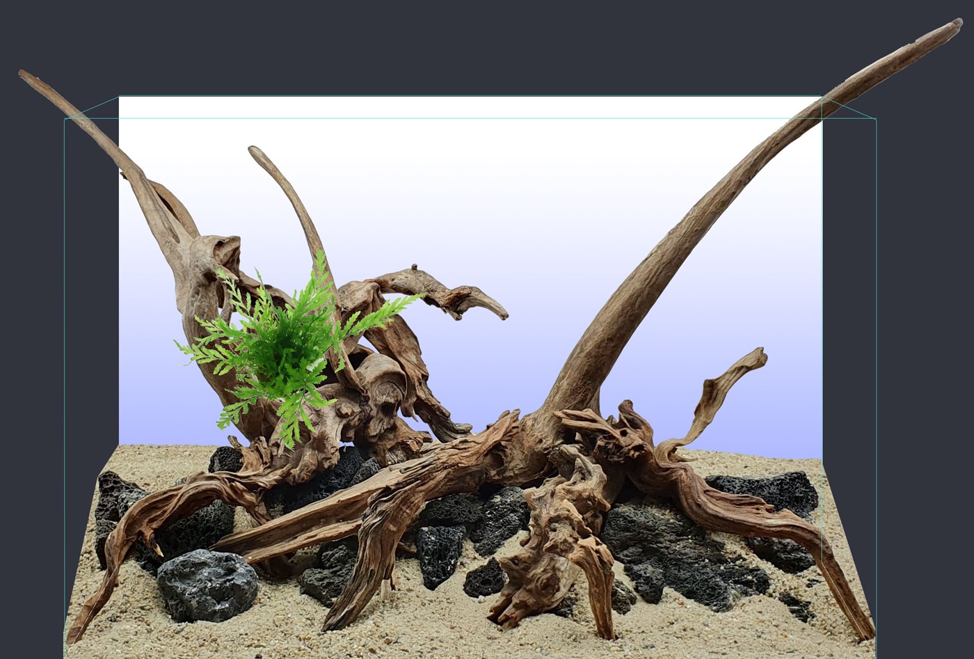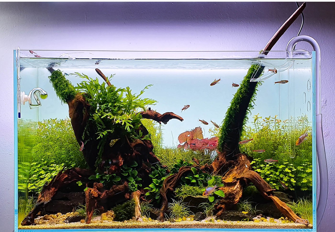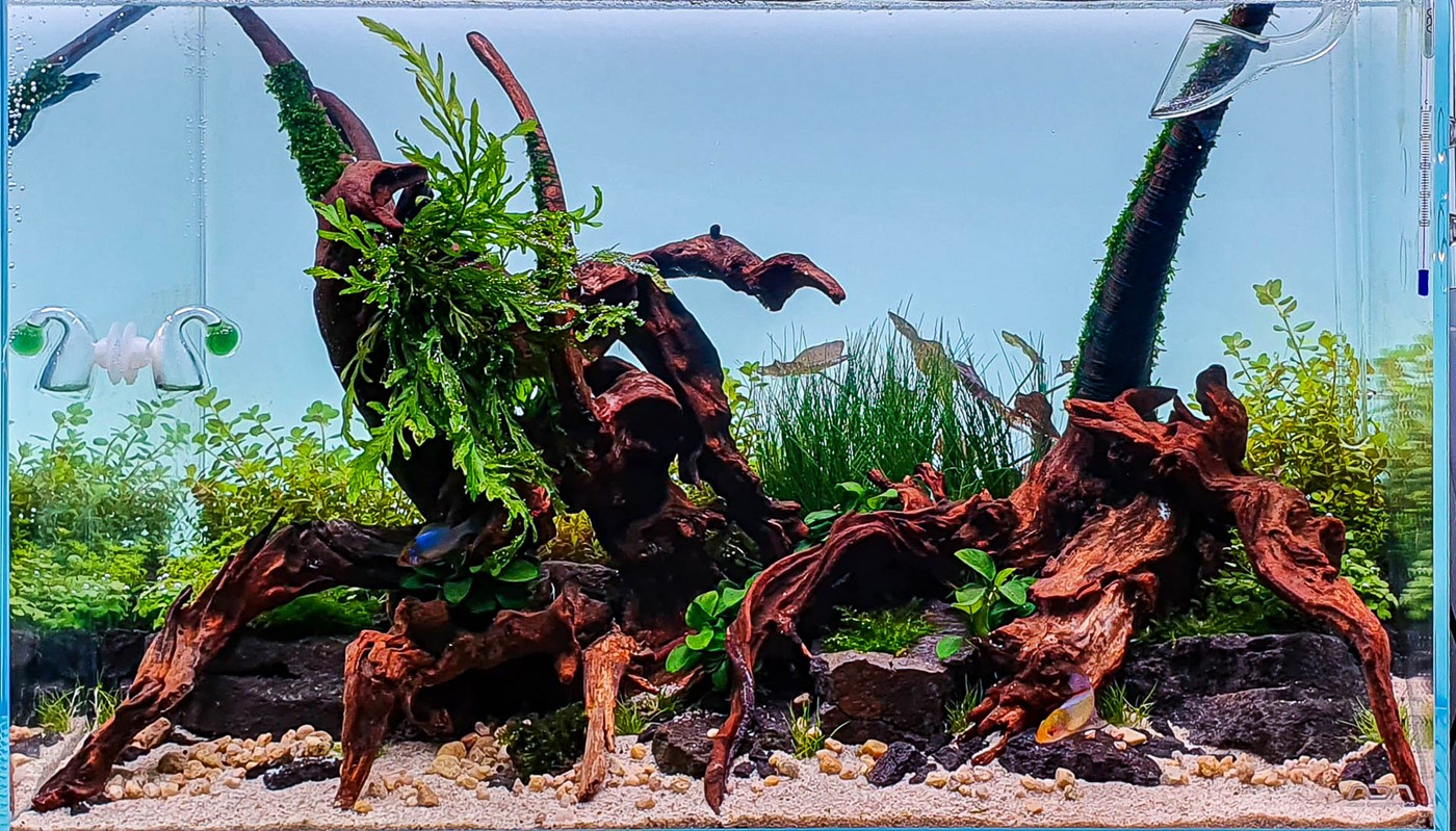 "I had the vision of 2 strong branches being surrounded by moss and plants on a shore line. With some additions of different Anubias species I got from friends this scape got more details in the midground than I have expected but I really like it. I wanted to achieve the Nymphaea Lotus in the center back to grow to the water surface, but it somehow felt more comfortable on the bottom of the aquarium."