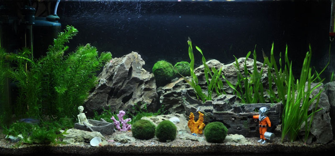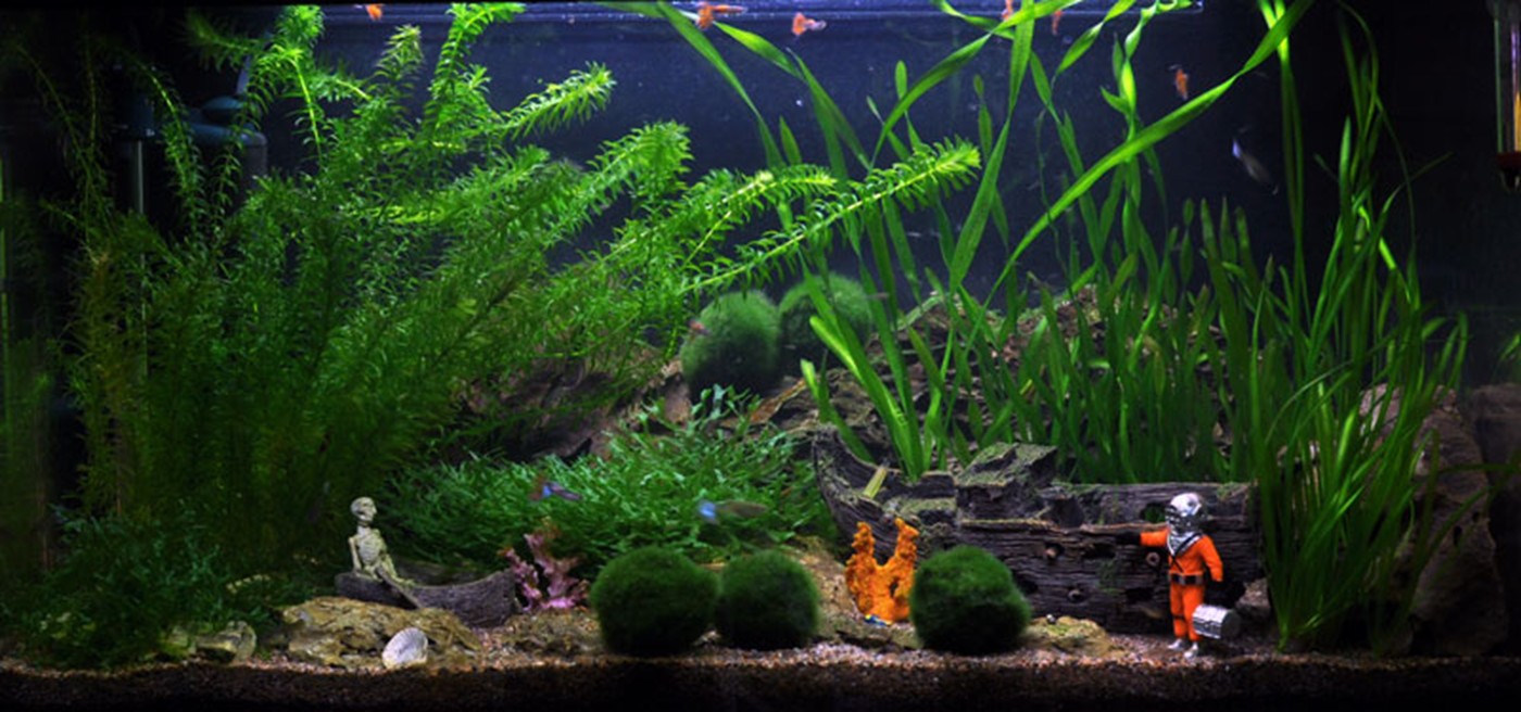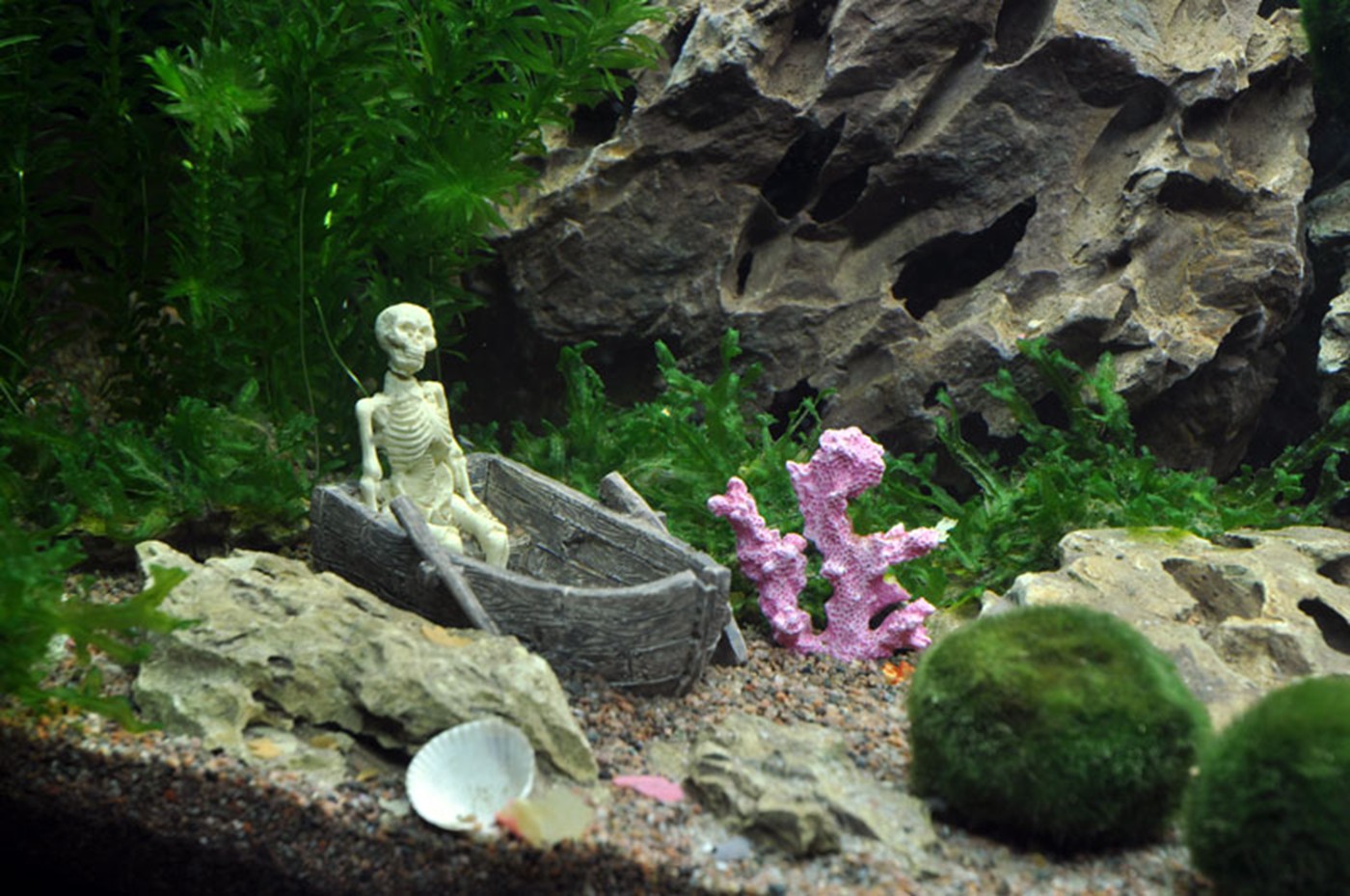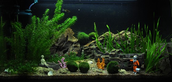 The aquarium in the children's room with the ship wreck, a diver, skeleton and lost treasures - the possibilities are many when choosing decorations! And it is easy to find plants which can help to represent the picture and create the necessary balance in the aquarium. We have chosen Egeria and Vallisneria which both can represent seaweeds. Algae balls are placed randomly as tufts on the coral reef, and Monosolenium are very much like Sea salad which you often find along the beach at summertime. All chosen plants are easy and do well even at the low light conditions as the chosen aquarium offer the plants!