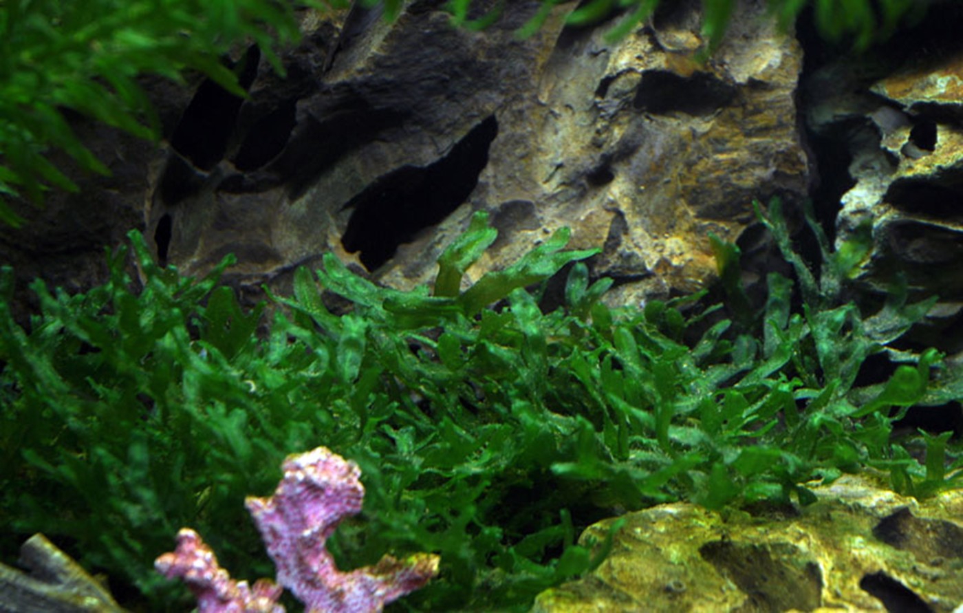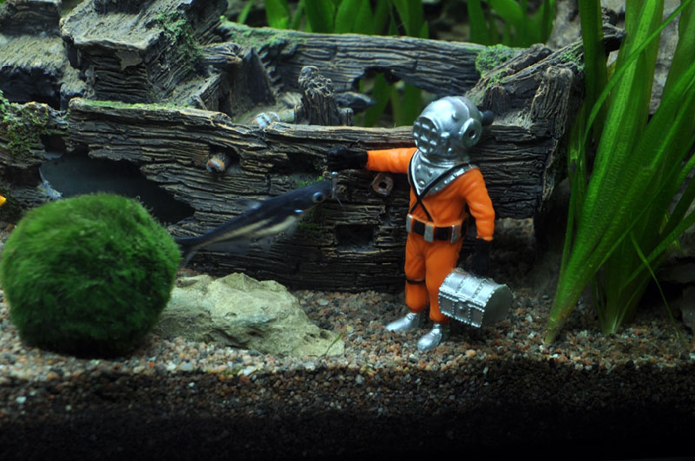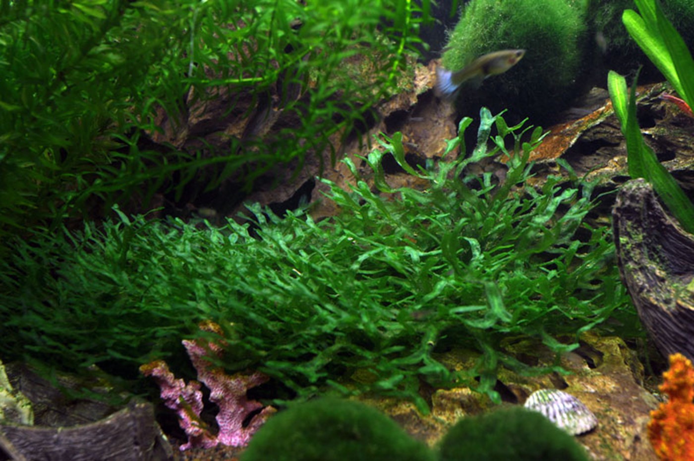 The aquarium in the children's room with the ship wreck, a diver, skeleton and lost treasures - the possibilities are many when choosing decorations! And it is easy to find plants which can help to represent the picture and create the necessary balance in the aquarium. We have chosen Egeria and Vallisneria which both can represent seaweeds. Algae balls are placed randomly as tufts on the coral reef, and Monosolenium are very much like Sea salad which you often find along the beach at summertime. All chosen plants are easy and do well even at the low light conditions as the chosen aquarium offer the plants!