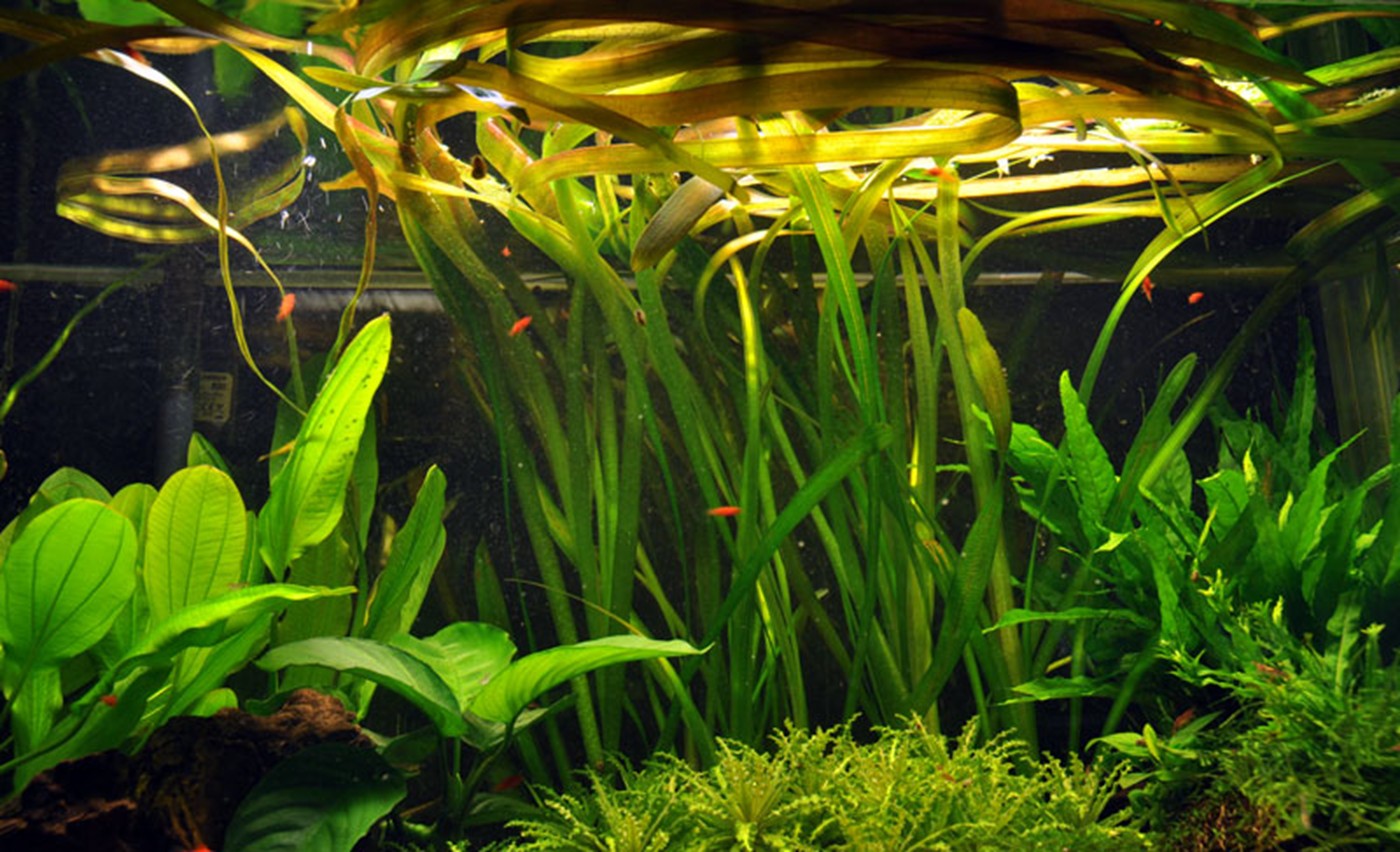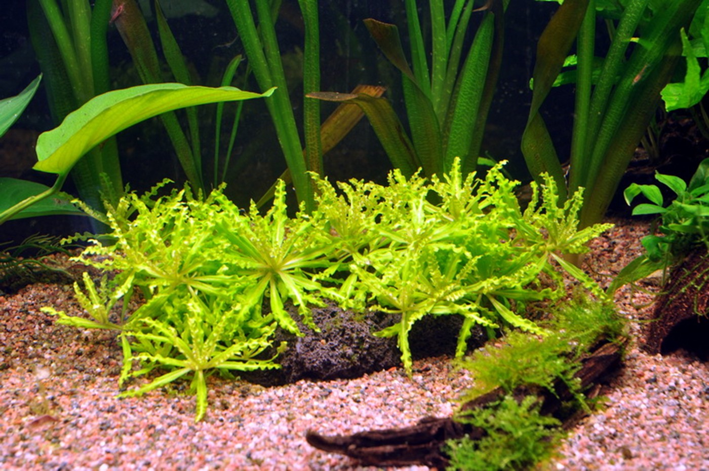 Here we show you how to do an aquarium "here and now" - even though it is your first aquarium! We use primarily AquaDecor-products where plants have been grown on the wood or rock, and supplies with few pots of Echinodorus and Vallisneria. In one side of the aquarium, we have placed a large piece of wood with two Anubias, and in the other side pieces of wood with respectively Microsorum and Anubias. Centrally, a rock with Pogostemon helferi breaks with lighter green colour and curly leaves. In front is placed a narrow wood piece with moss. A half coconut with plants creates decoration and a hiding space for fish. Vallisneria and Echinodorus in the background add volume and are fast growing plants.