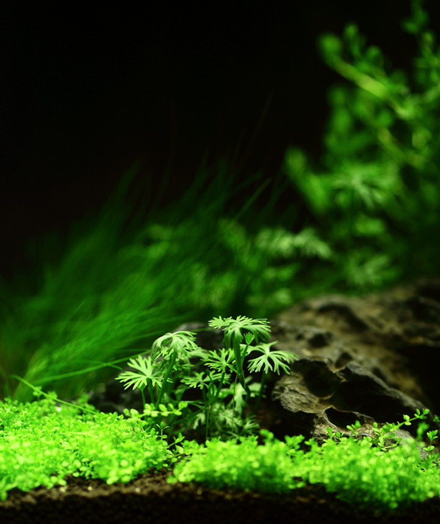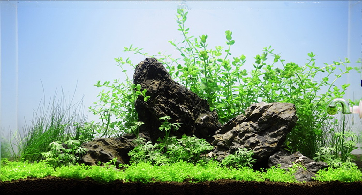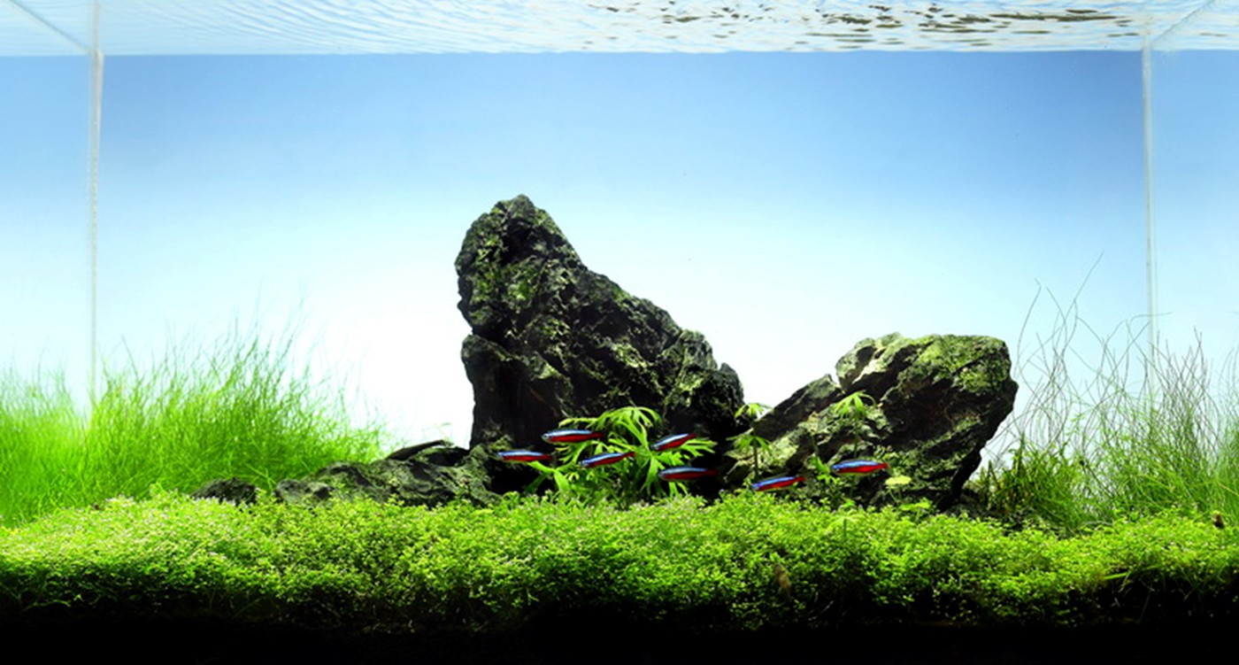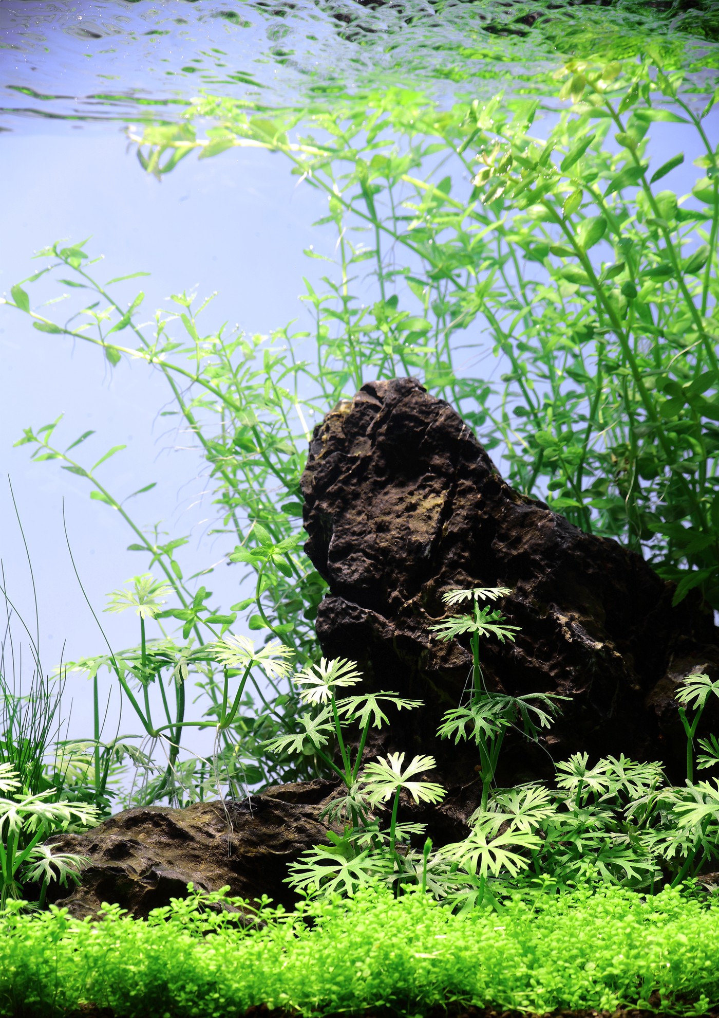 Mark Evans has aquascaped this "Iwagumi" layout. First, Mark arranges the fresh green, a shallow and vital foreground carpet. Between Hemianthus and the dark rocks there are tufts of Ranunculus. Behind the rocks there are light draperies of Rotala and on the side, where the rocks penetrate the sand, tufts of Eleocharis. Mark has attached blue foil to the aquarium and with light effects during photoshoots he achieves a blue sky over the fresh green layout.
