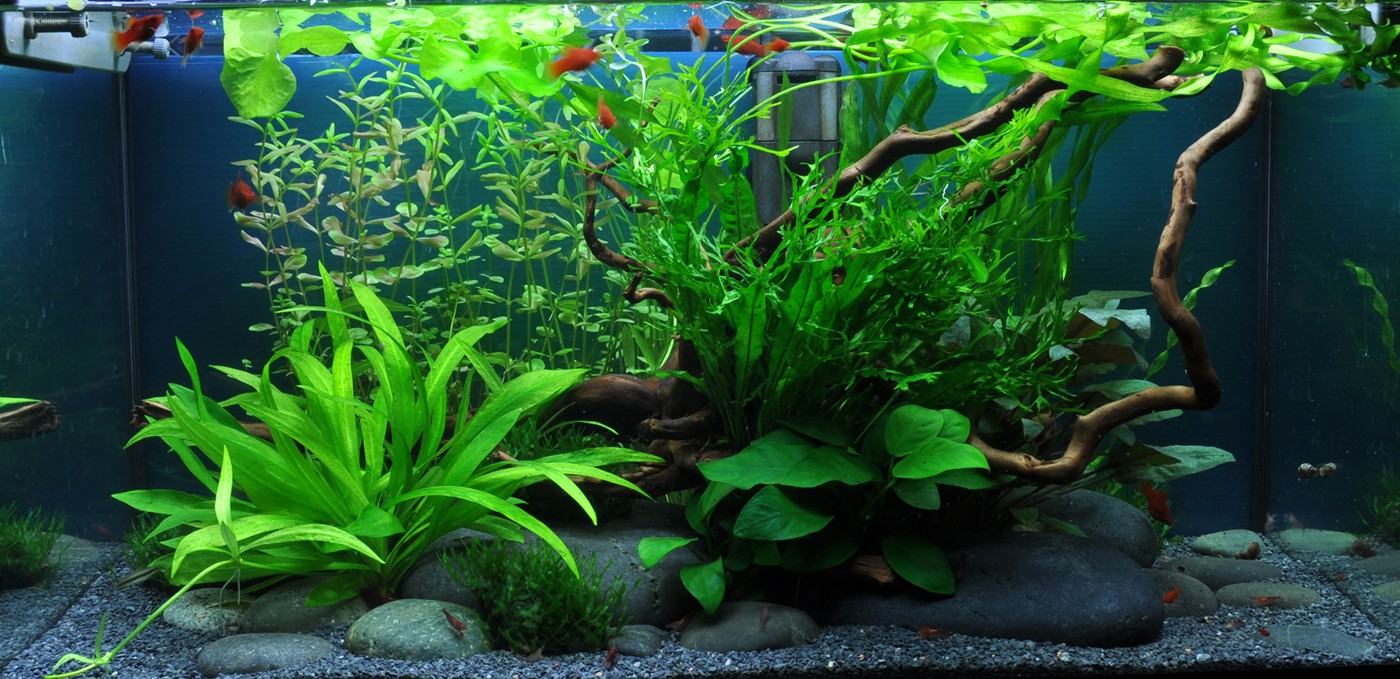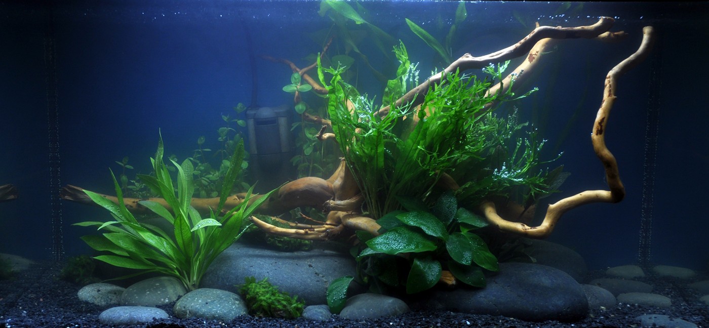 The modest amount of light and no CO2 limit the choice of plants to the most robust ones. The layout is based initially on structures, forms and colours. The round, dark marine gravels and Anubias, Monosolenium and Cryptocryne Tropica create the underlying peace in the aquarium. The spider-like root, quadricostatus and Winde leaves by their light colours and "sharpness" create a strong contrast and give the impression of life and restlessness. The leaves of the soft, light green Nymphoides are under the surface.