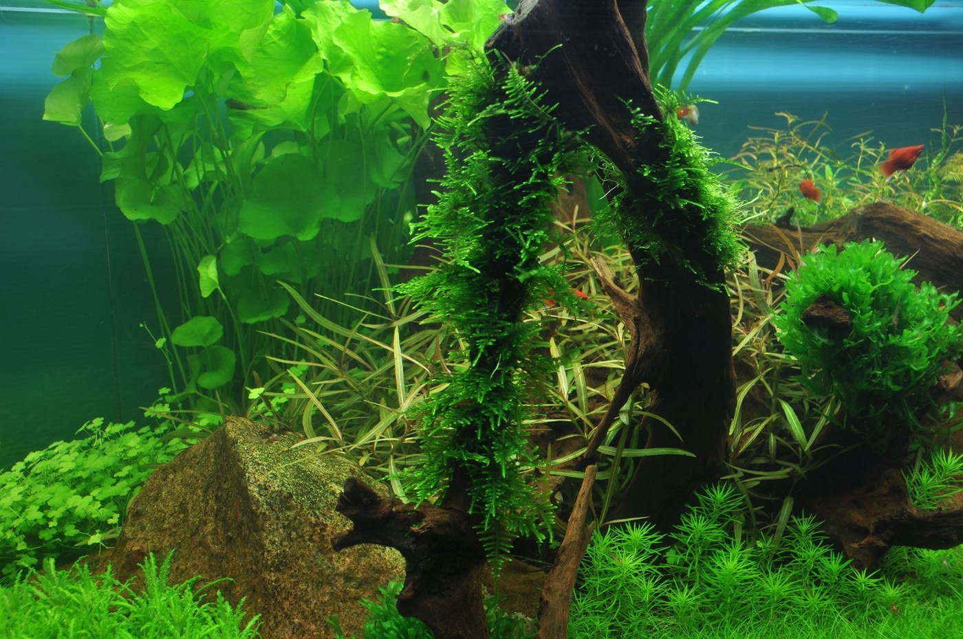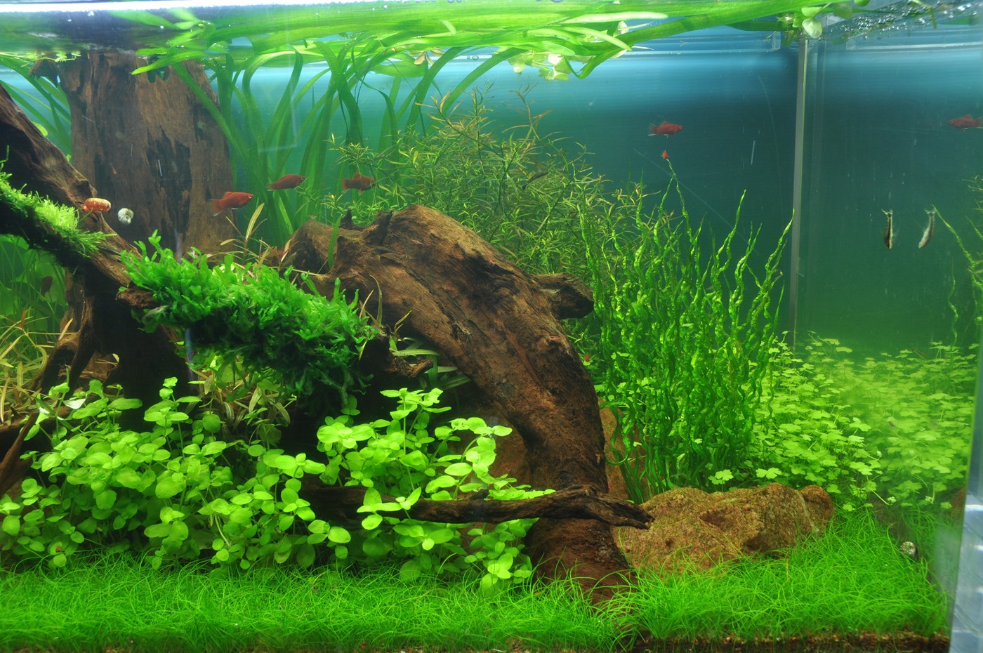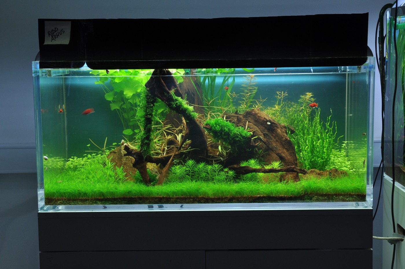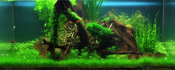 Red granite stones and solid mangrove roots build up the hardscape in this aquarium. With the good lighting and CO2 supply the compact, reddish araguaia and the slim Proserpinaca and arcuata find their right place. The somewhat demanding Utricularia has found foothold at the bottom of the Spiky moss which together with Monosolenium form a picture frame in the middle of the aquarium. A solid bottom cover of Eleocharis, helferi and Hydrocotyle create contrast and bring out each other's leaf structures.