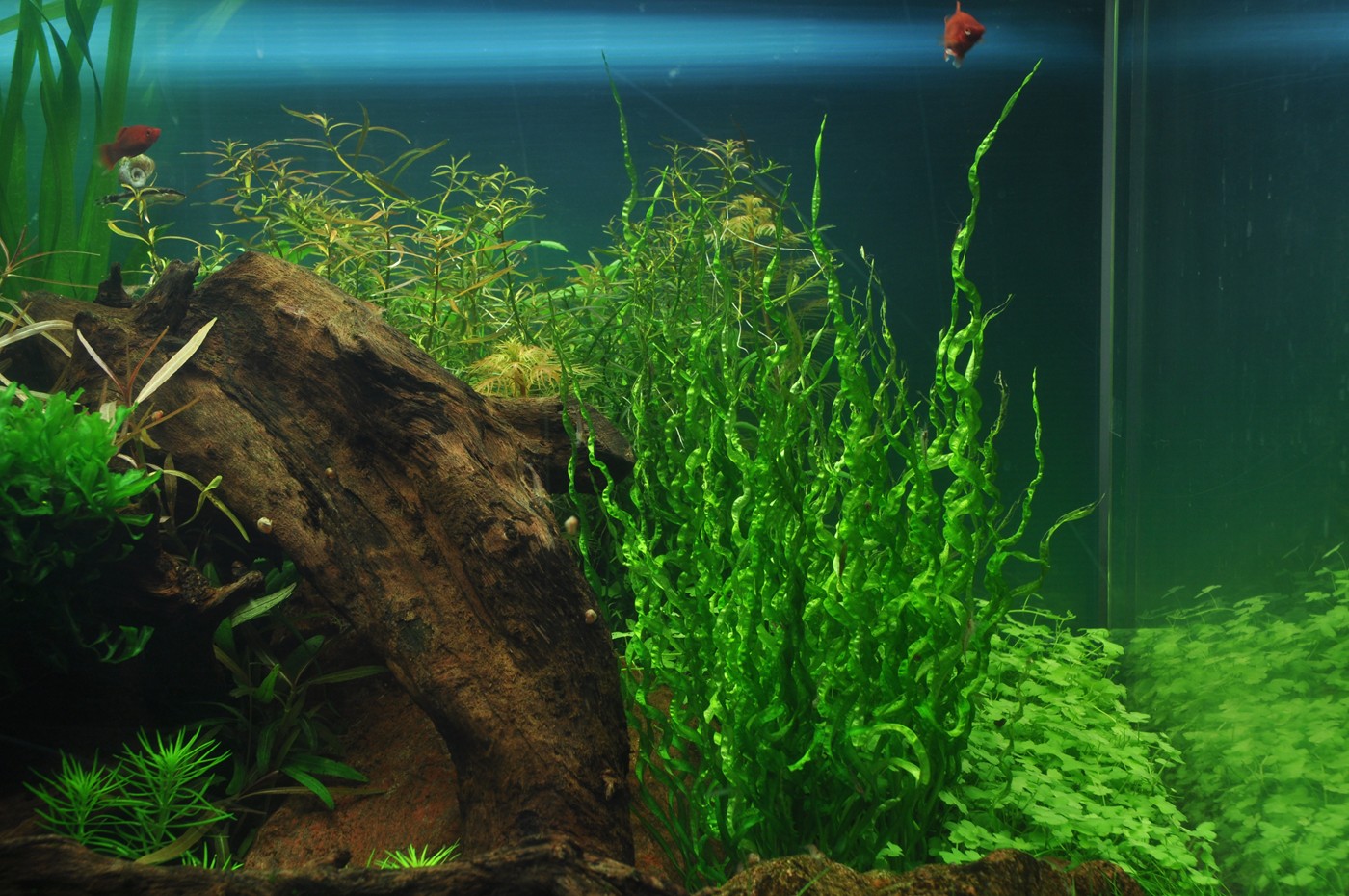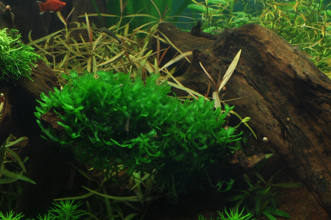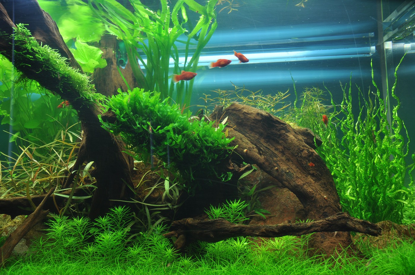 Red granite stones and solid mangrove roots build up the hardscape in this aquarium. With the good lighting and CO2 supply the compact, reddish araguaia and the slim Proserpinaca and arcuata find their right place. The somewhat demanding Utricularia has found foothold at the bottom of the Spiky moss which together with Monosolenium form a picture frame in the middle of the aquarium. A solid bottom cover of Eleocharis, helferi and Hydrocotyle create contrast and bring out each other's leaf structures.