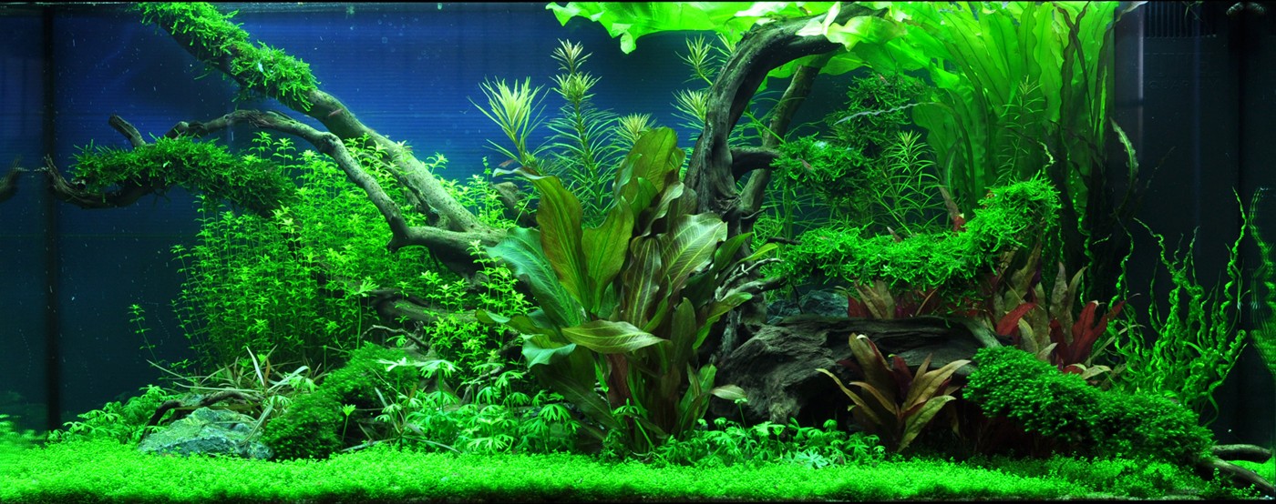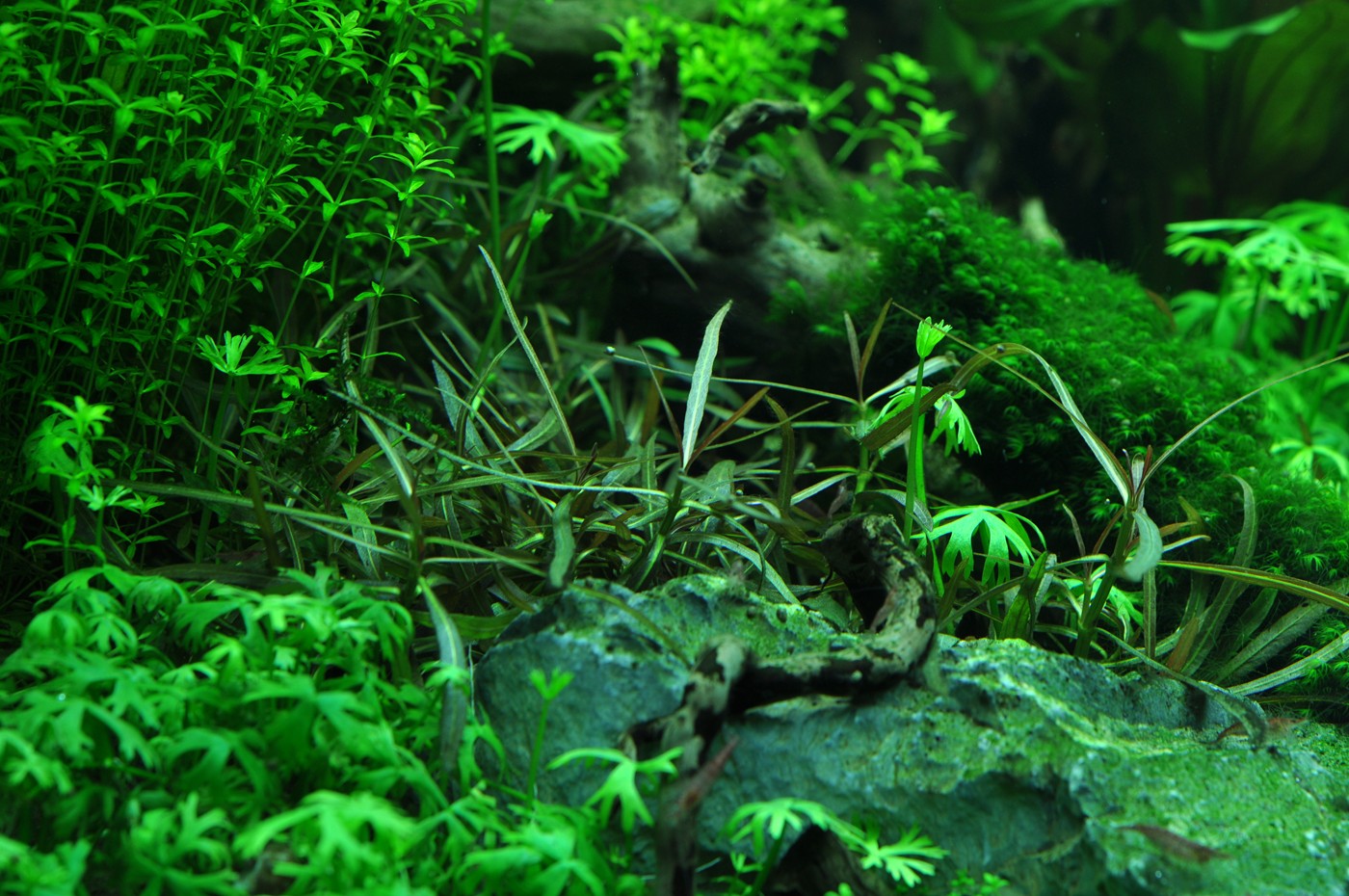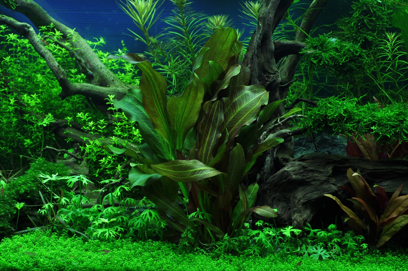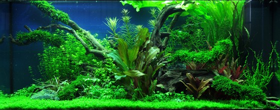 The large, dead rainforest tree makes room for an abundance of new growth. A thick wall of red and green Aponogeton, stellata and Hemianthus falls softly from the right to the left in the back of the aquarium. Echinodorus 'Reni' and 'Araguaia' create, along with Alternanthera, colourful focus points. The thick, dark mosses give the layout a sense of age and character as a contrast to the vigorous, light-green Hemianthus carpet that covers the entire foreground of the aquarium.