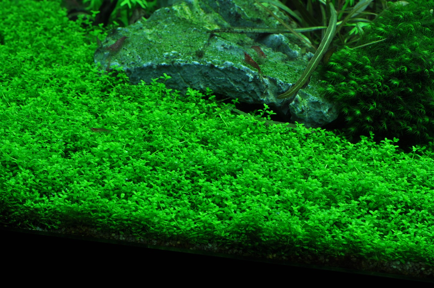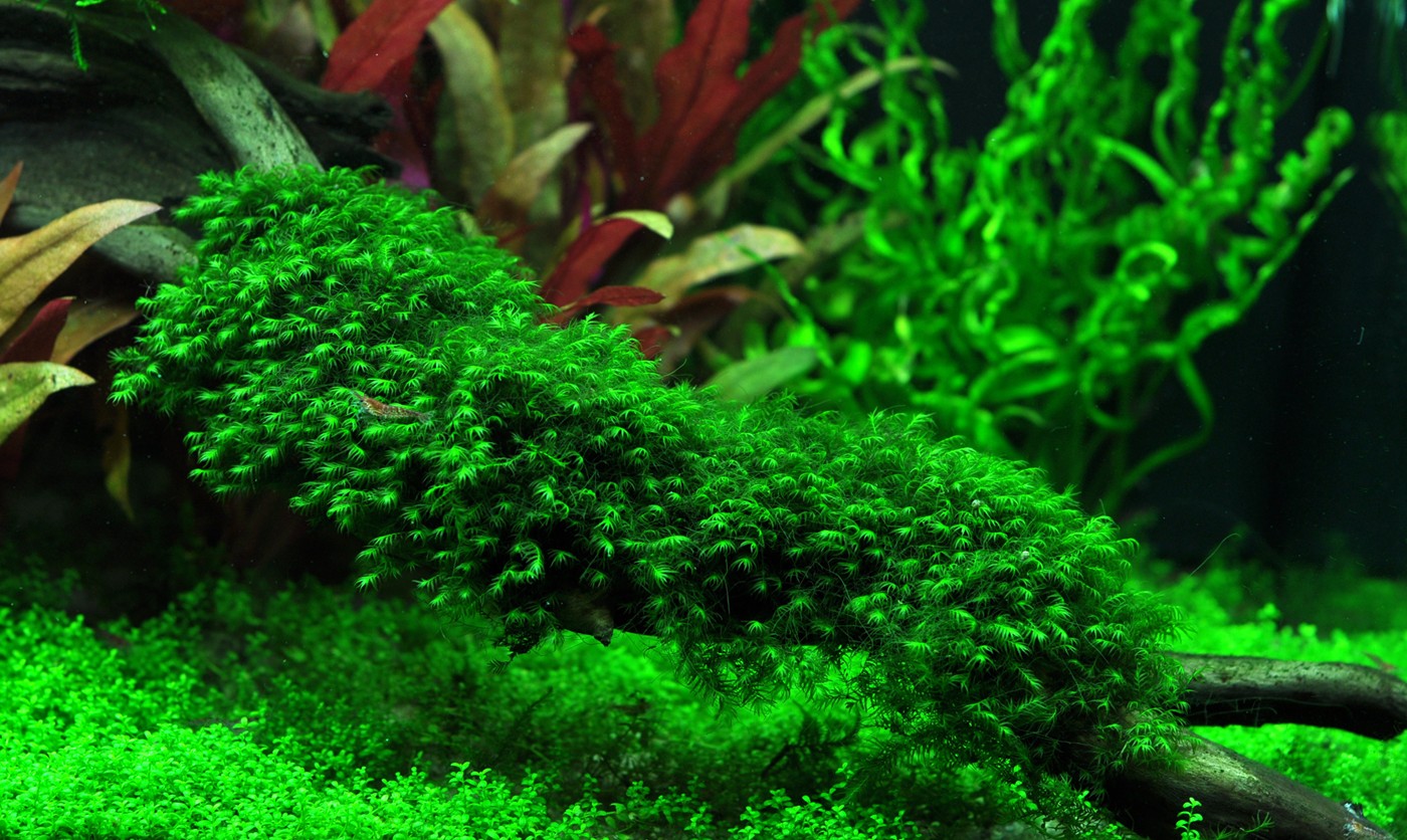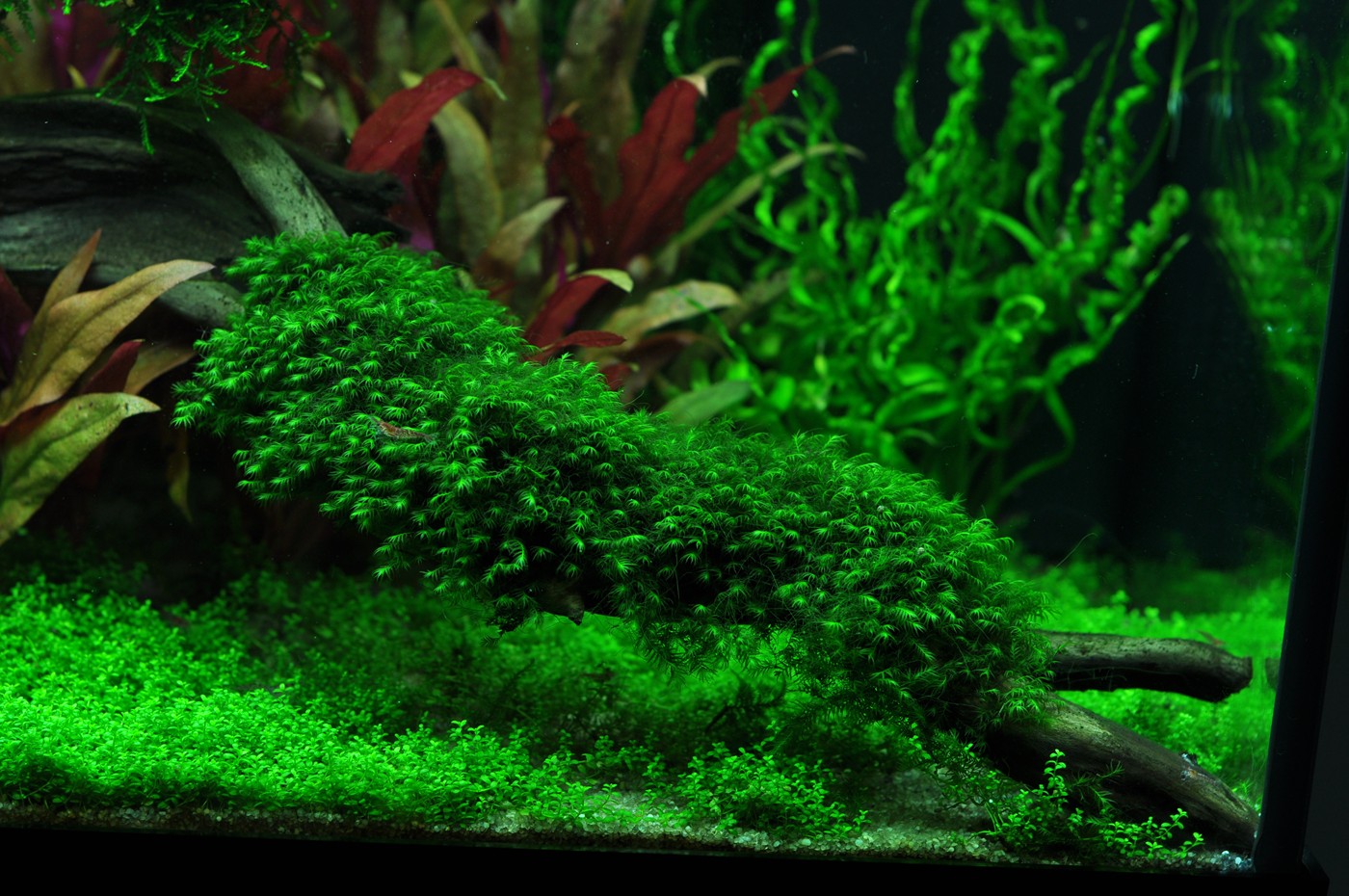 The large, dead rainforest tree makes room for an abundance of new growth. A thick wall of red and green Aponogeton, stellata and Hemianthus falls softly from the right to the left in the back of the aquarium. Echinodorus 'Reni' and 'Araguaia' create, along with Alternanthera, colourful focus points. The thick, dark mosses give the layout a sense of age and character as a contrast to the vigorous, light-green Hemianthus carpet that covers the entire foreground of the aquarium.