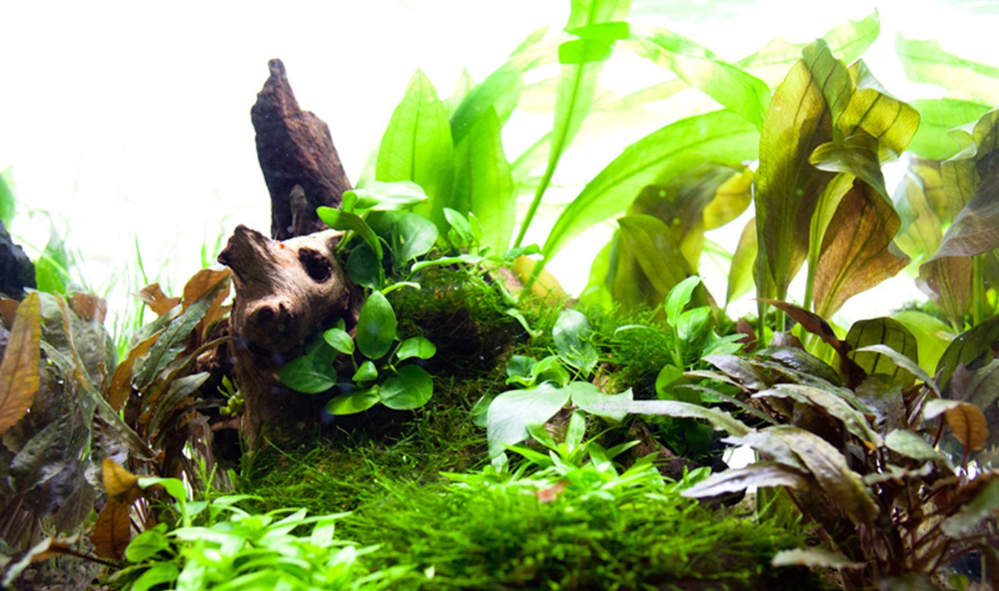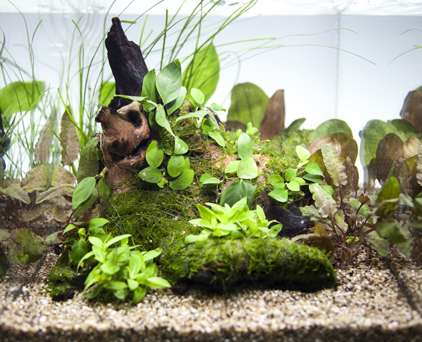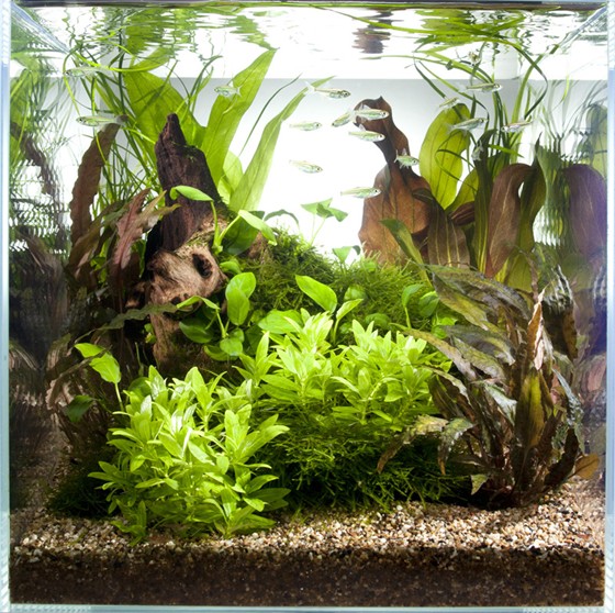 The cube's 30 x 30 cm is perfect for a simple hardscape with only one root placed in the middle of the aquarium. The root will look more natural over time because it will be covered with moss. The shape of the root is suitable for Anubias. Cryptocoryne wendtii "Tropica" and Echinodorus "Reni" contribute to the red shades of the root which emphasise the fresh green Staurogyne in the foreground.