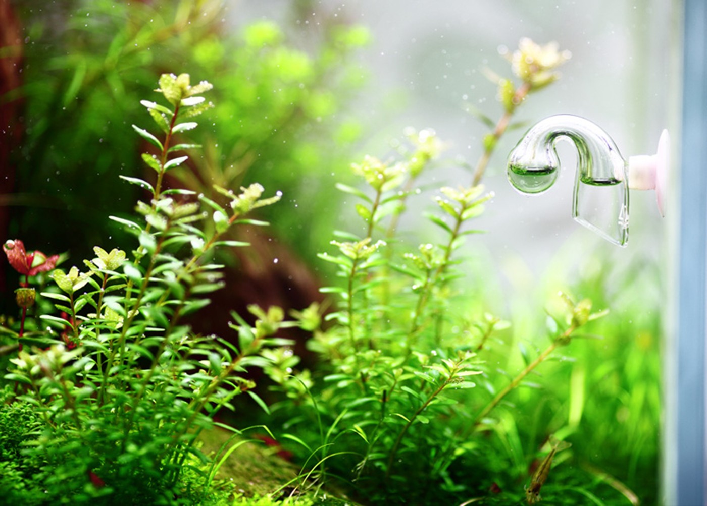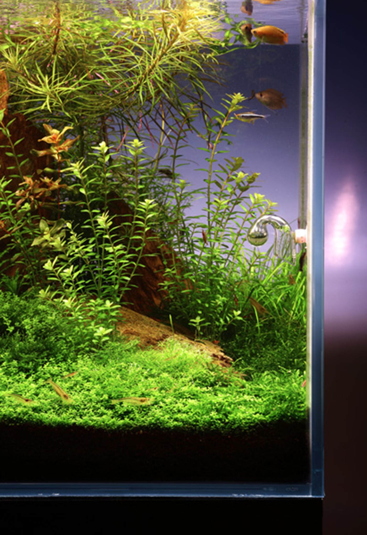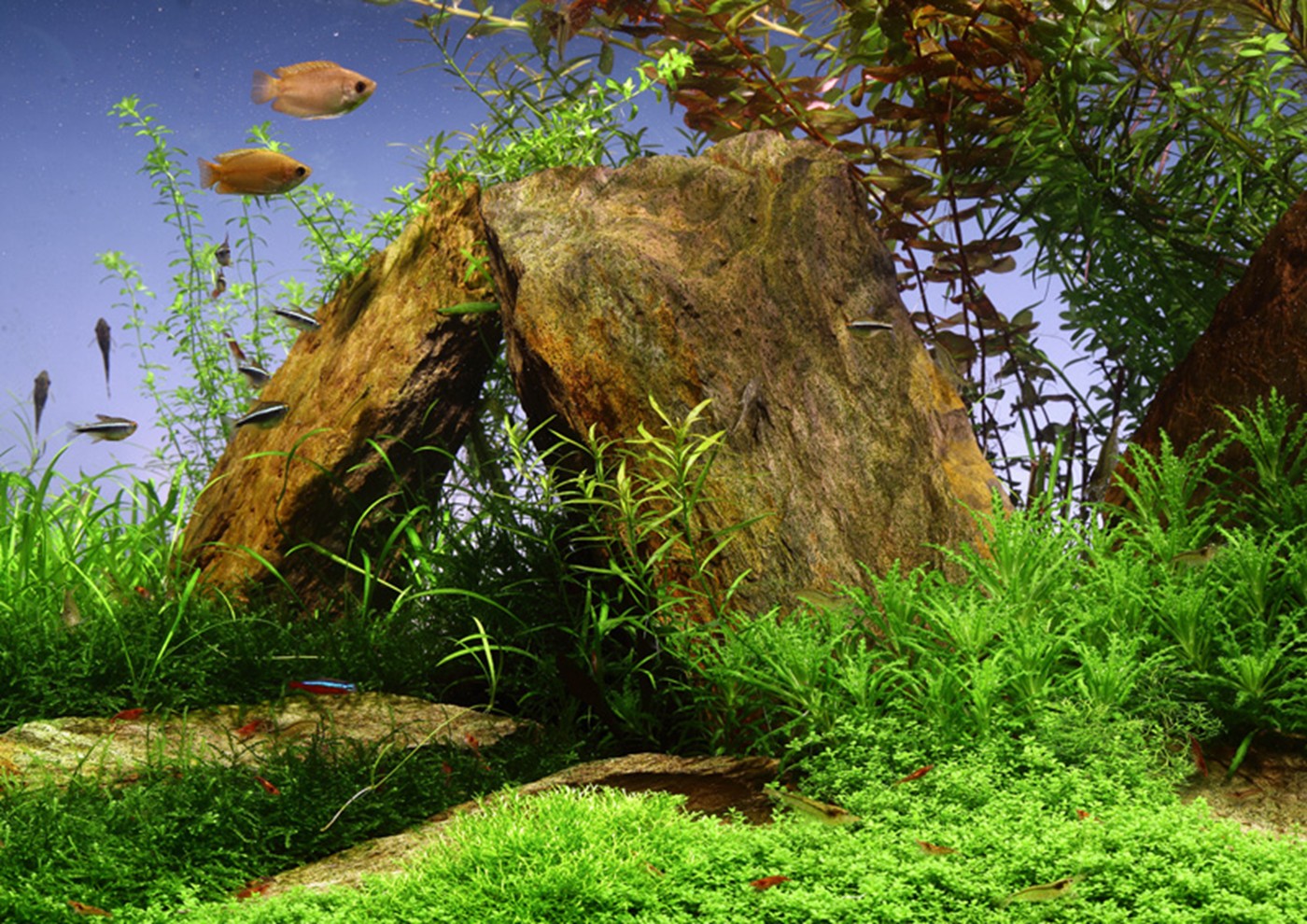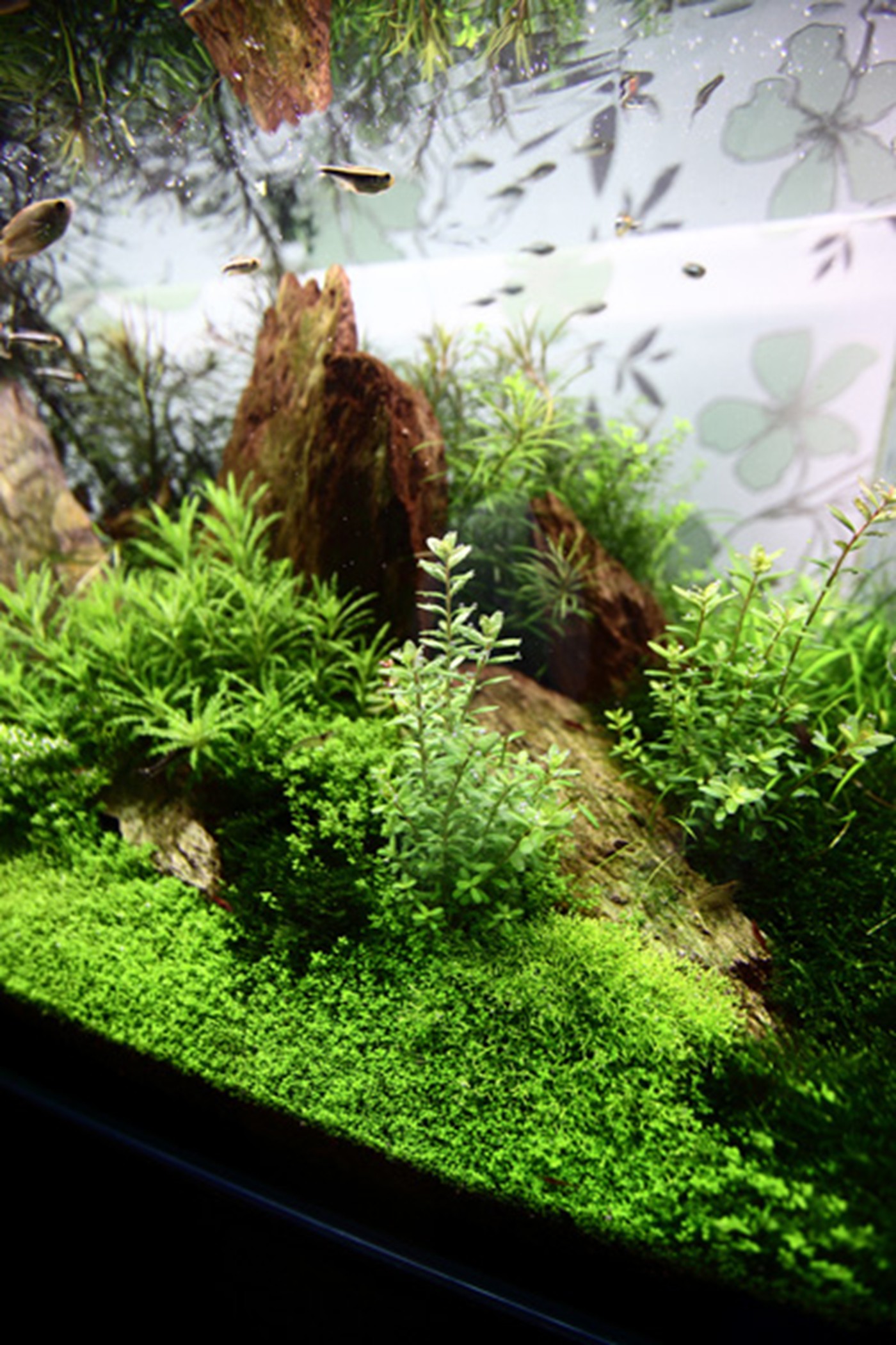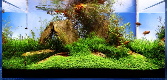 Mark has designed a dramatic rock landscape where the eye is caught in the light green, luxuriant foreground and guided towards the centre of the aquarium. Here we meet an abundance of colours and shapes. Dark green moss and a dense Tenellus forest frame the V-shaped edge. The colourful stem plants are challenging but if you succeed, they will be a nice contrast to the peaceful green foreground.
