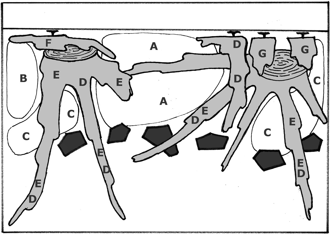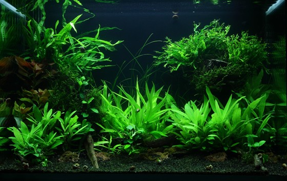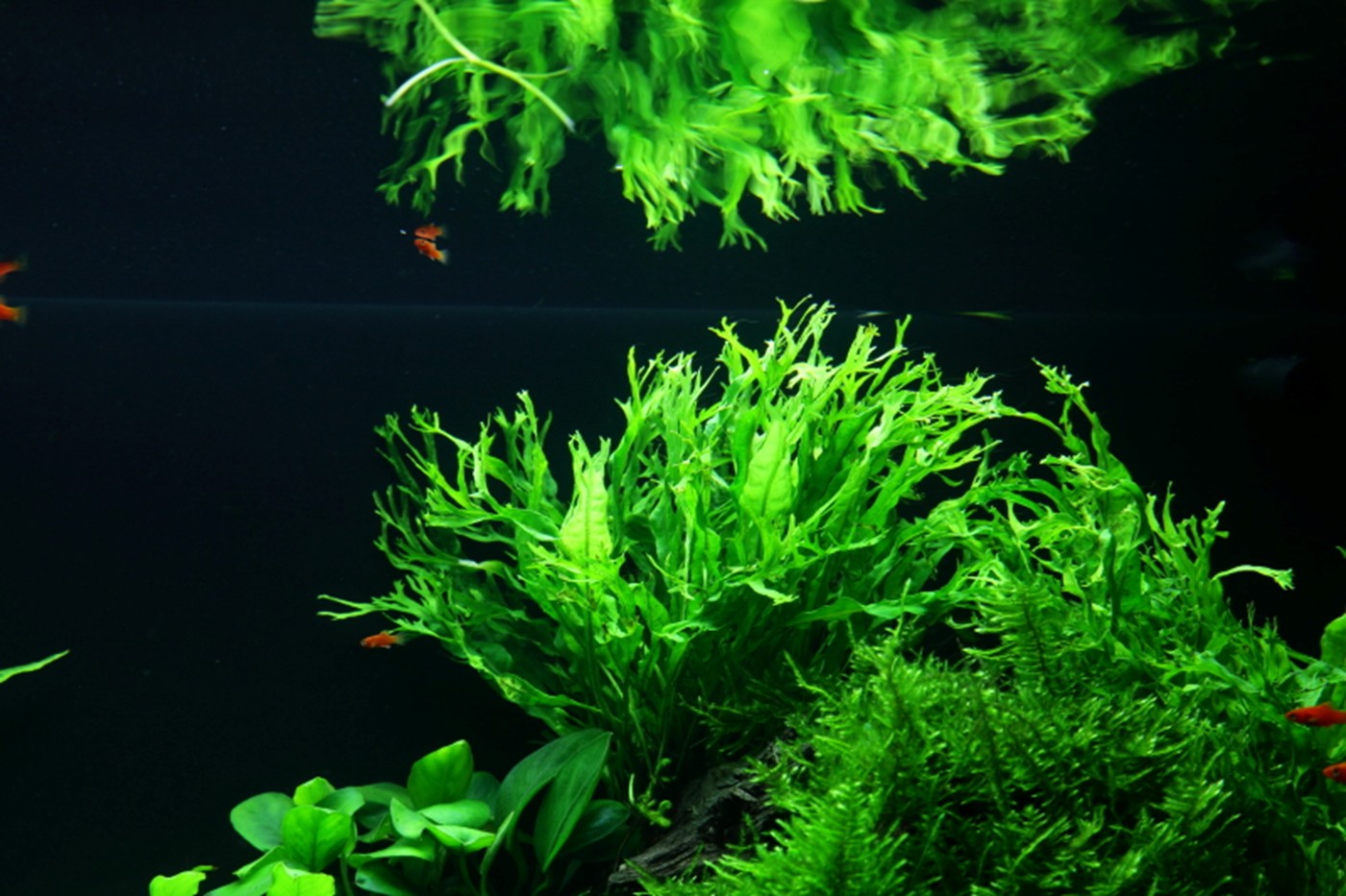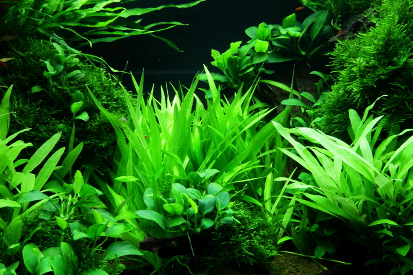 The deep dark bottom layer accentuates the pale green Hygrophila and Helanthium (previously named Echinodorus) quadricostatus. Both are easy plants with a fresh and vigorous appearance. As a powerful contrast, you will see the darker Anubias and Microsorum, well surrounded by Spiky-moss and placed with each their tree root in the backmost corners. The orange red Ludwigia will catch your attention in this little, intimate place in the jungle river.