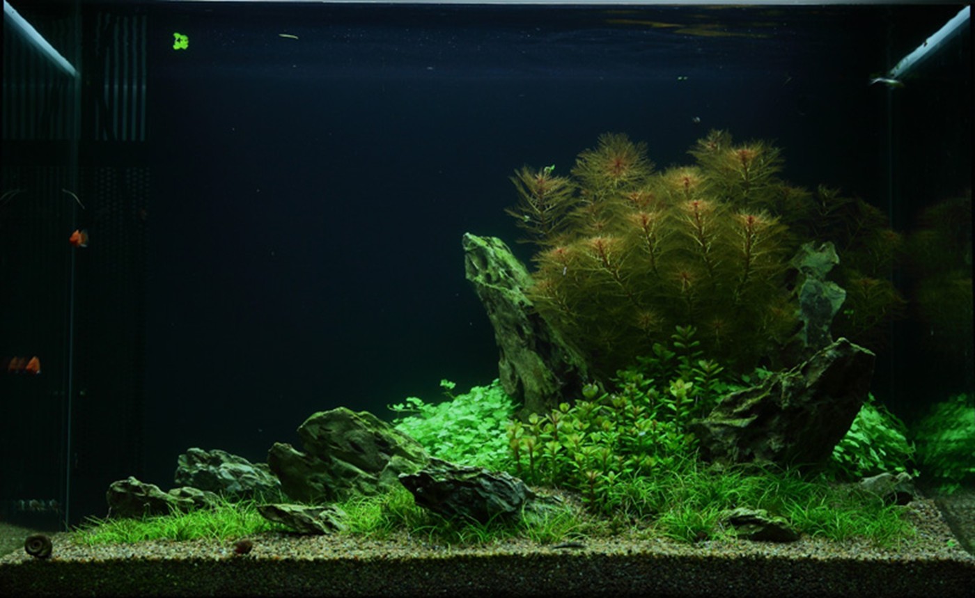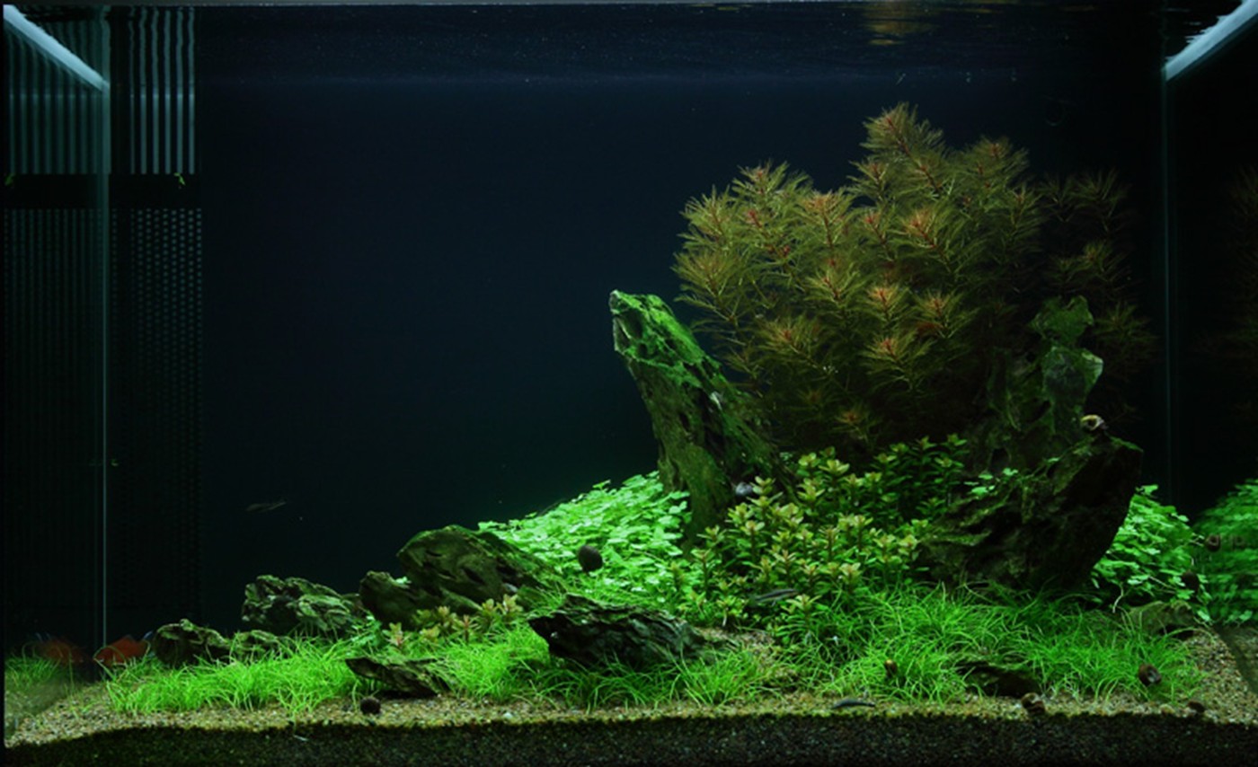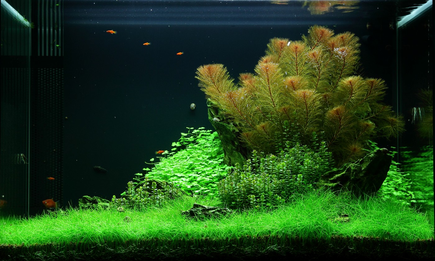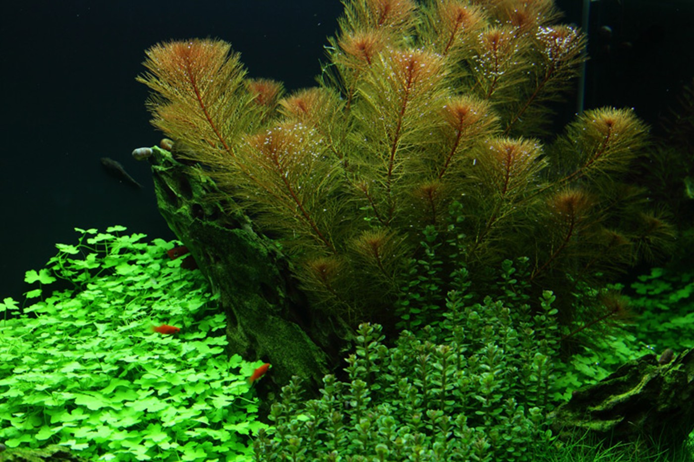 The choice of only 4 different plants gives the aquarium an incredibly consistent, simple and harmonious image. The soft, calm lawn by Eleocharis 'Mini' (that stays low and does not require mowing) accentuates the forms and colours of Myriophyllum, Rotala sp. bonsai and Hydrocotyle, just like the merging in the colour tone of the fine-leafed, warm orange red Myriophyllum and the terminals on Rotala are very effective. Upright dragon rocks stop the fall from the right towards to the left for a short moment and allow the eye to linger on the details of each plant.