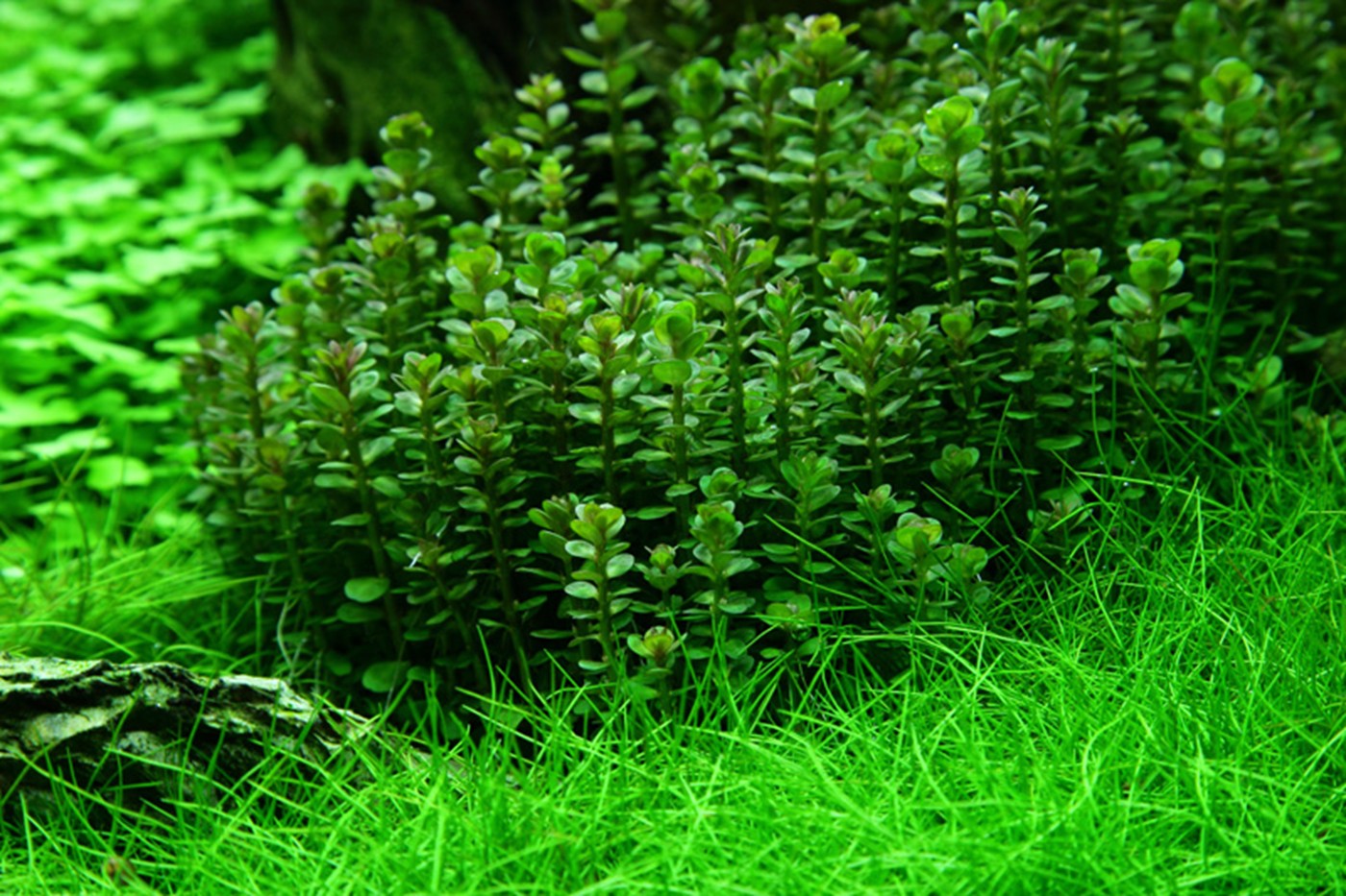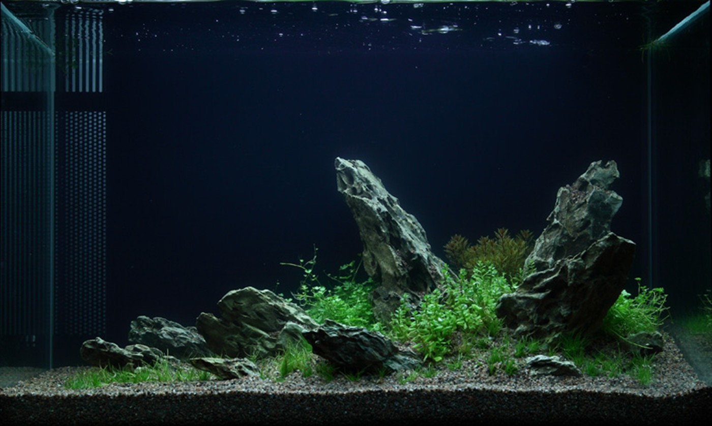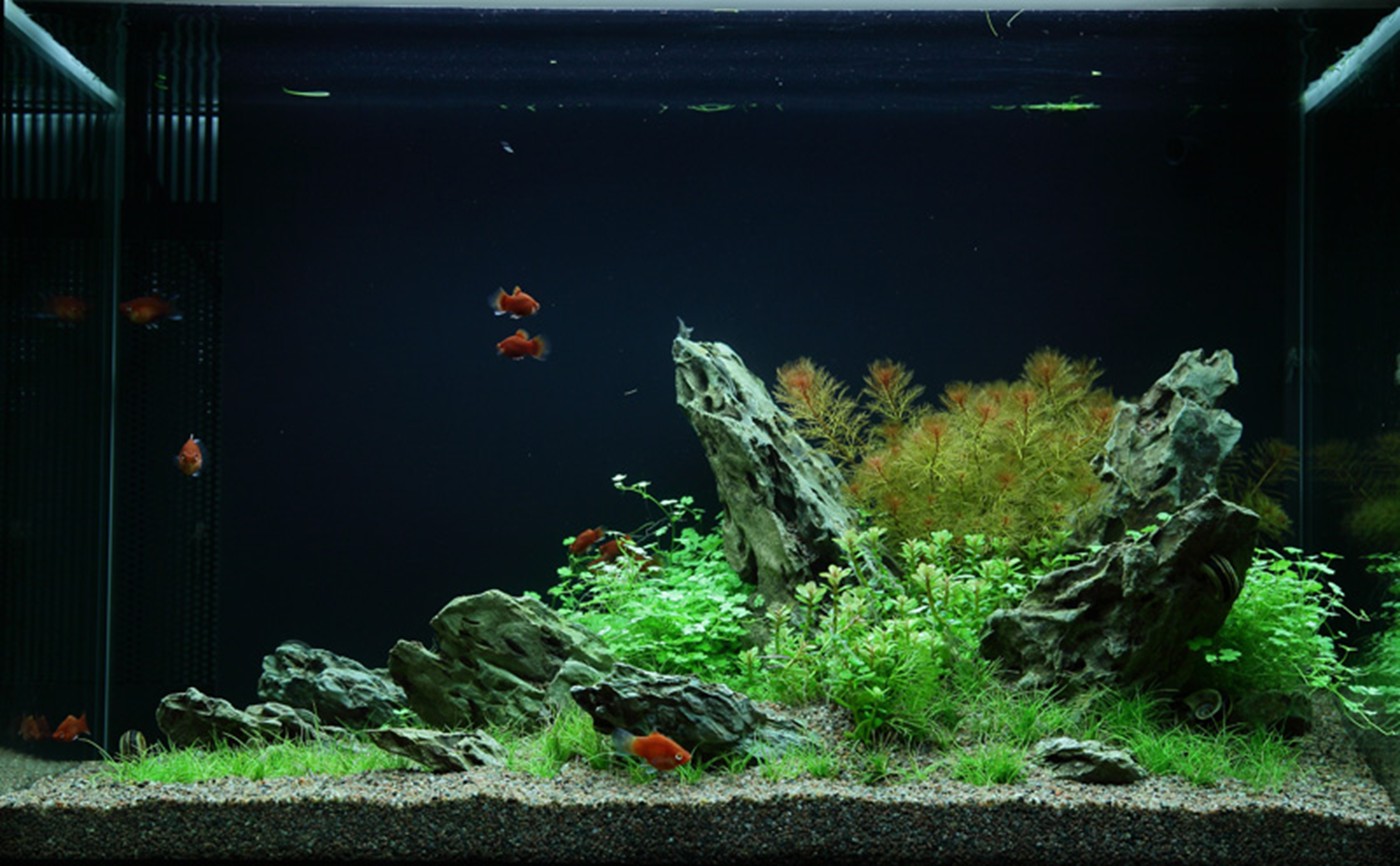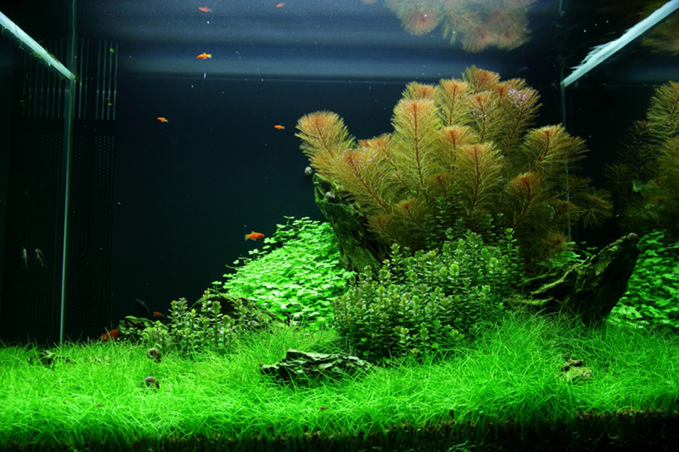 The choice of only 4 different plants gives the aquarium an incredibly consistent, simple and harmonious image. The soft, calm lawn by Eleocharis 'Mini' (that stays low and does not require mowing) accentuates the forms and colours of Myriophyllum, Rotala sp. bonsai and Hydrocotyle, just like the merging in the colour tone of the fine-leafed, warm orange red Myriophyllum and the terminals on Rotala are very effective. Upright dragon rocks stop the fall from the right towards to the left for a short moment and allow the eye to linger on the details of each plant.