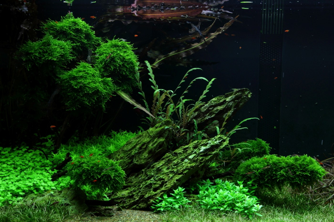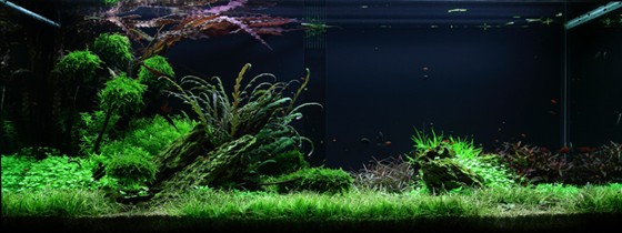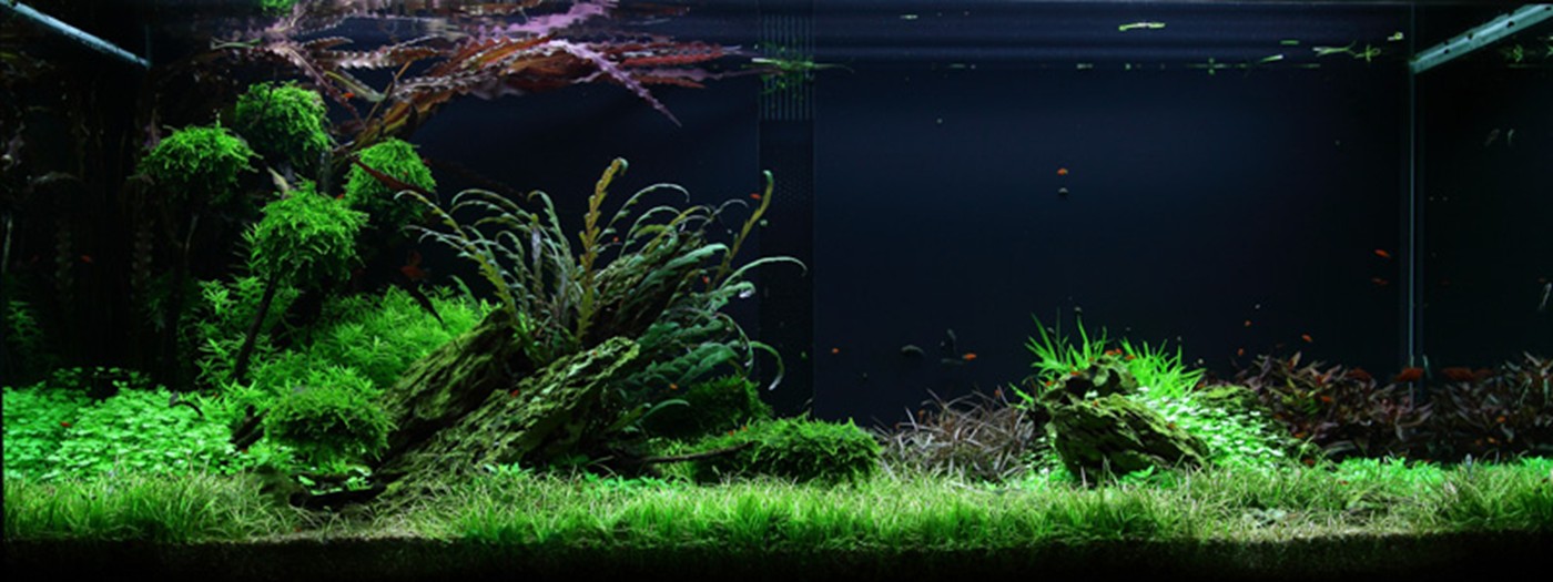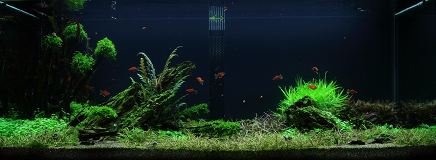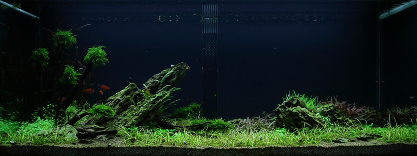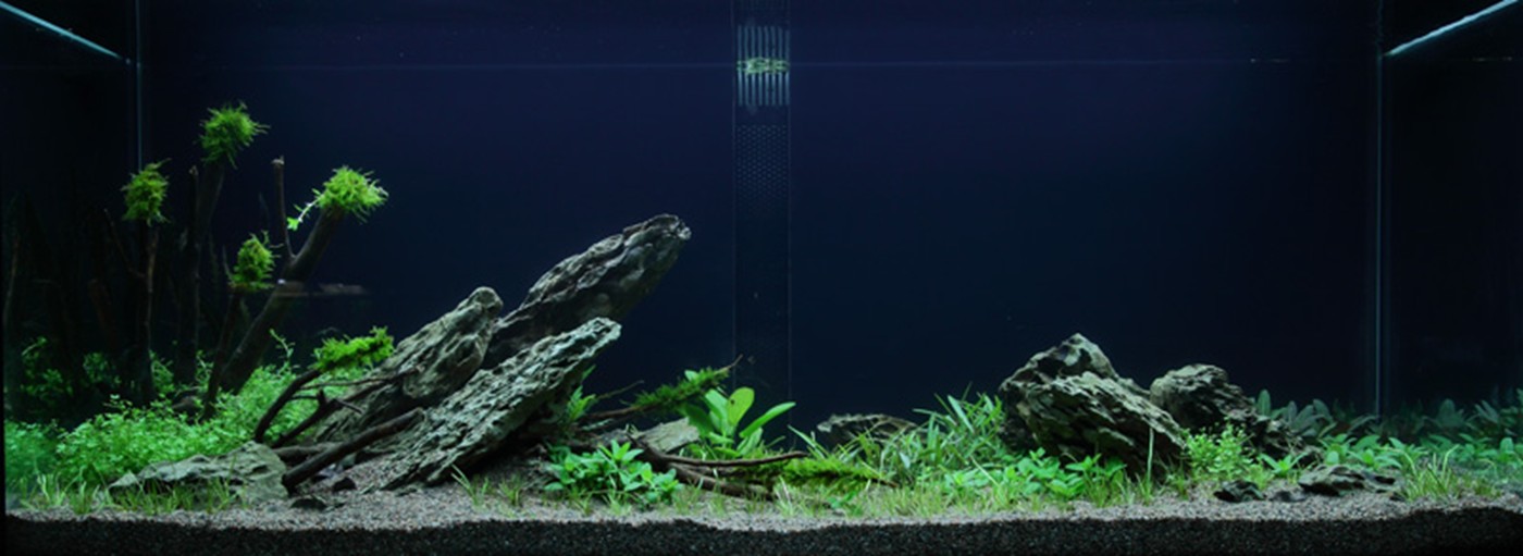 Dramatic, upright dragon rocks in a calm, flat landscape of tenellus, Staurogyne and Hydrocotyle form the two classical islands with small details and the ravine in between. Hydrocotyle creates a light green glacier on one of them, while pinnatifida towers over the other. The mixture of red purple Aponogeton, Ludwgia and Hygrophila araguaia with fresh green Heteranthera and Rotala green beautifully accentuates both colours. Soft moss, Weeping and Christmas, soften up the somewhat sharp branches. The aquarium radiates peace and plenty of space.