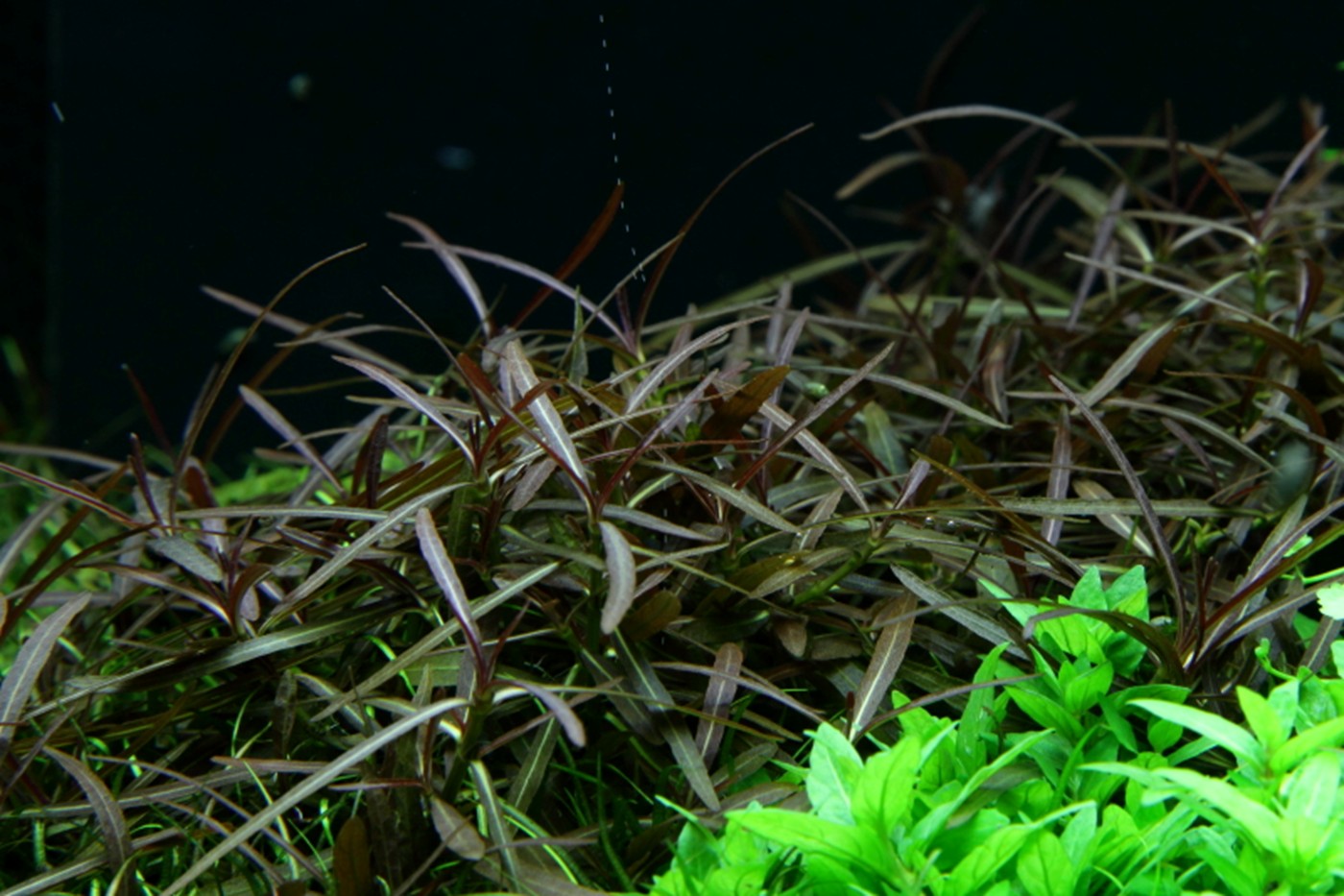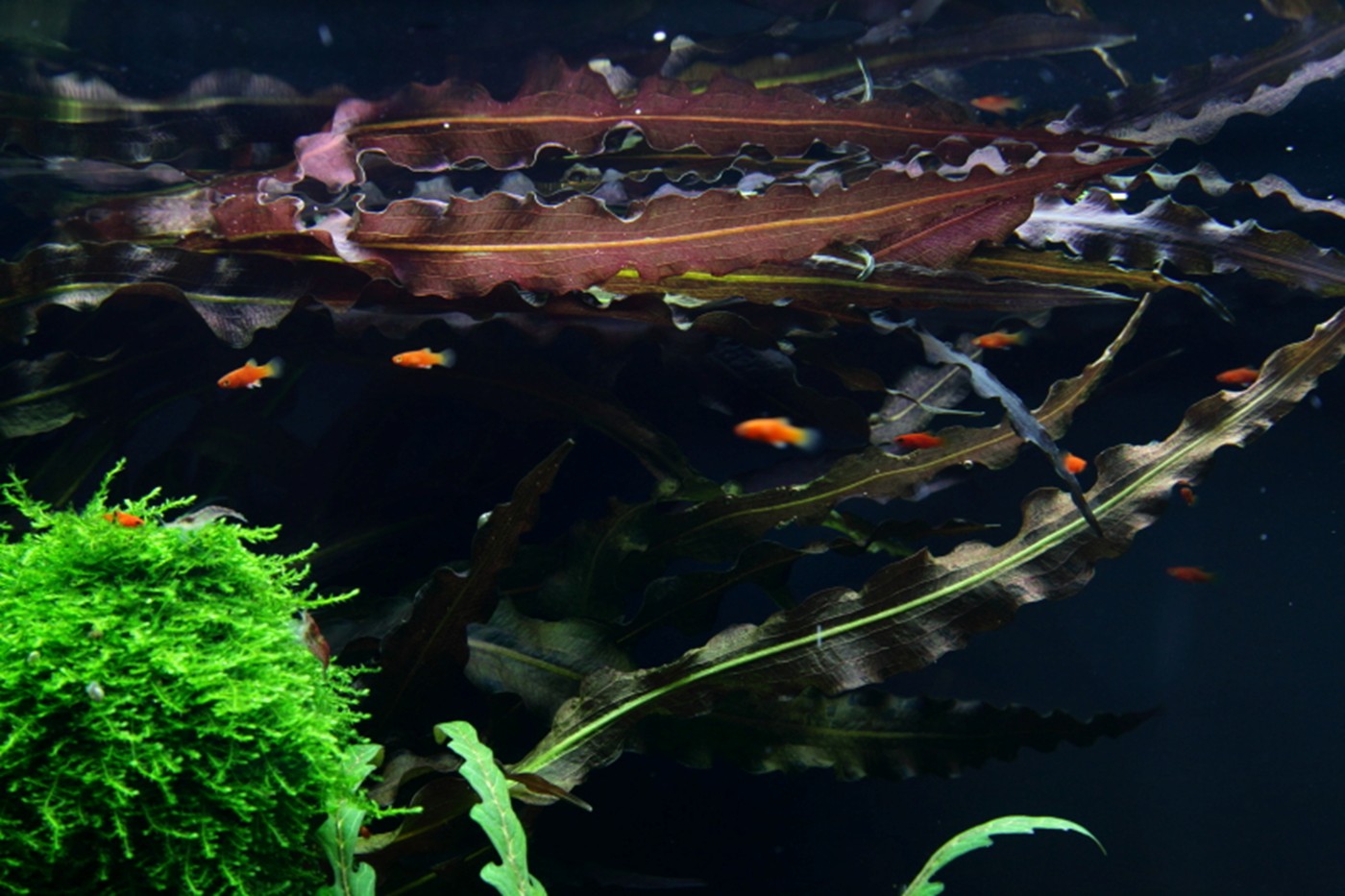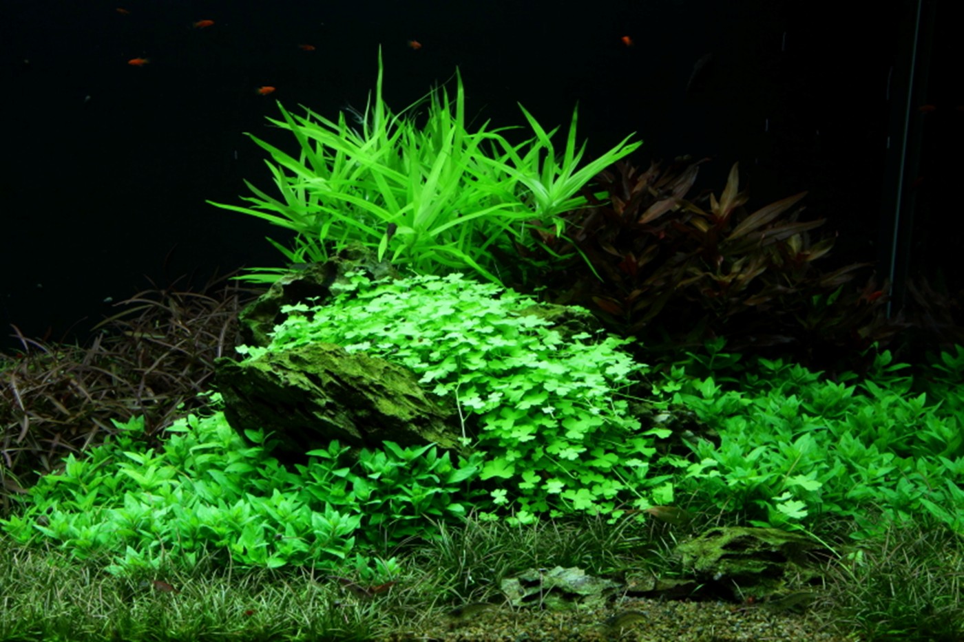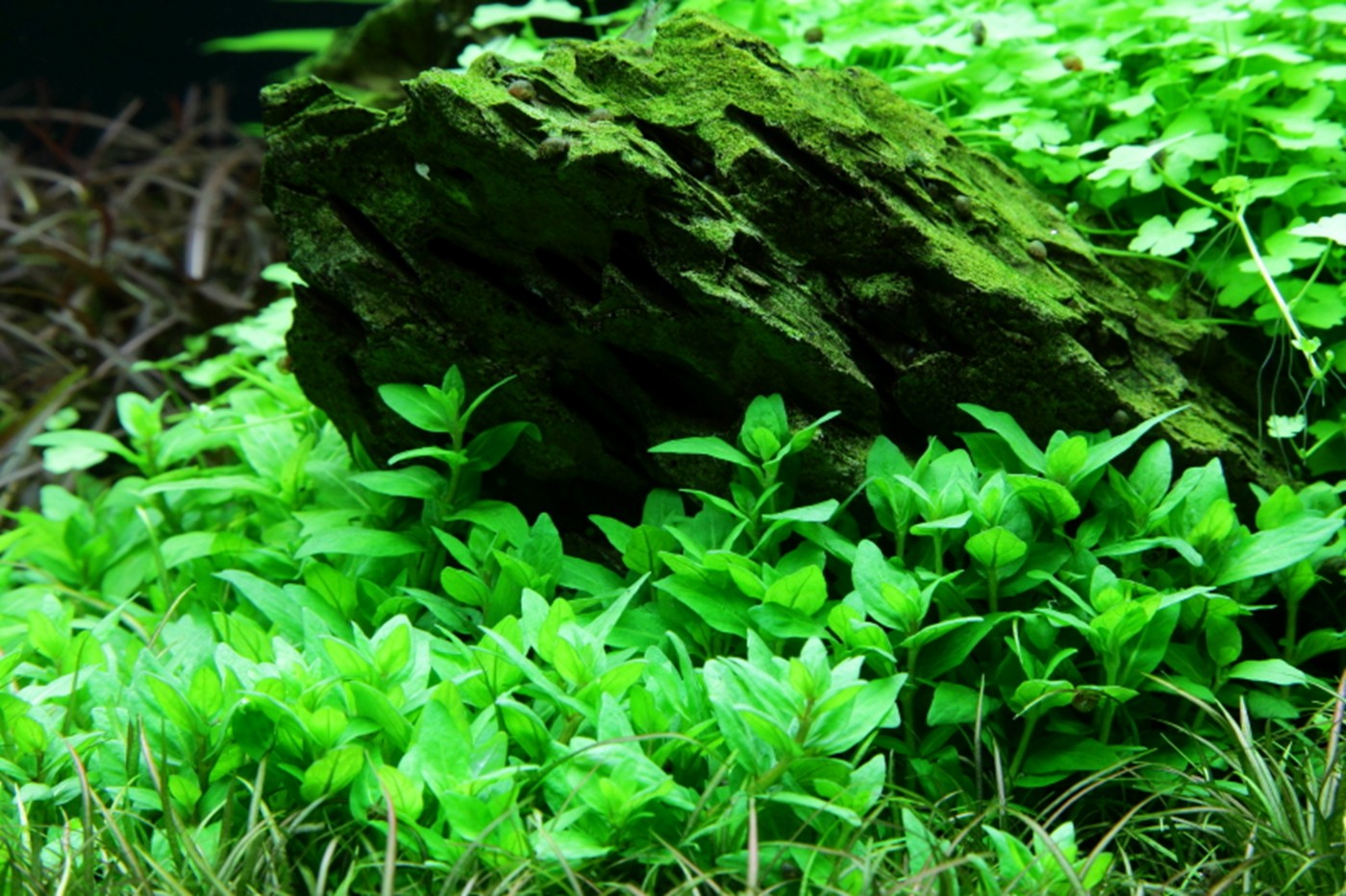 Dramatic, upright dragon rocks in a calm, flat landscape of tenellus, Staurogyne and Hydrocotyle form the two classical islands with small details and the ravine in between. Hydrocotyle creates a light green glacier on one of them, while pinnatifida towers over the other. The mixture of red purple Aponogeton, Ludwgia and Hygrophila araguaia with fresh green Heteranthera and Rotala green beautifully accentuates both colours. Soft moss, Weeping and Christmas, soften up the somewhat sharp branches. The aquarium radiates peace and plenty of space.