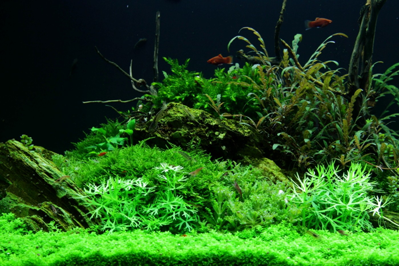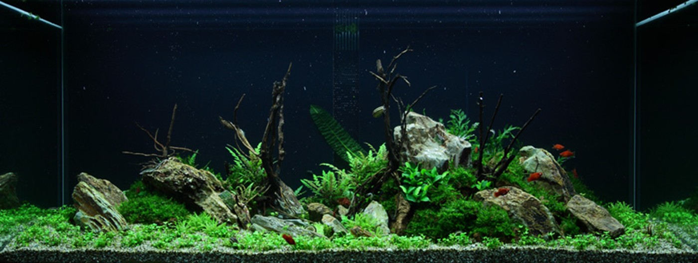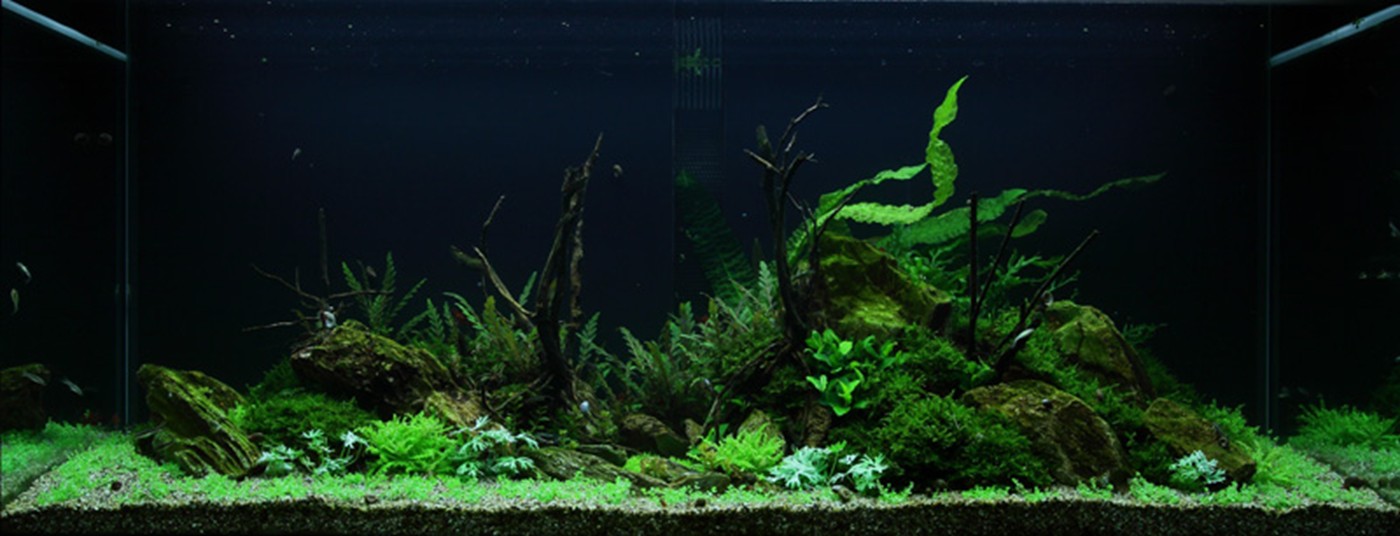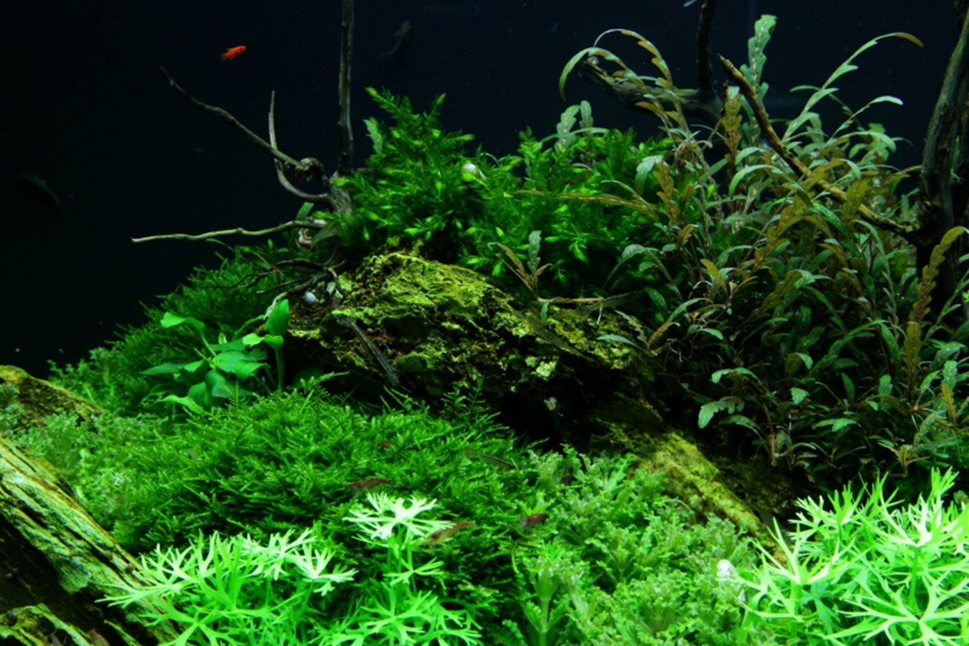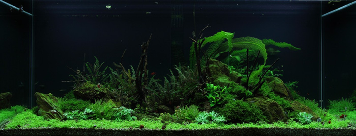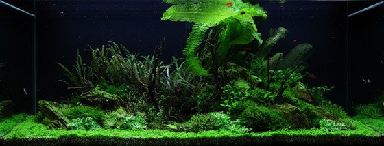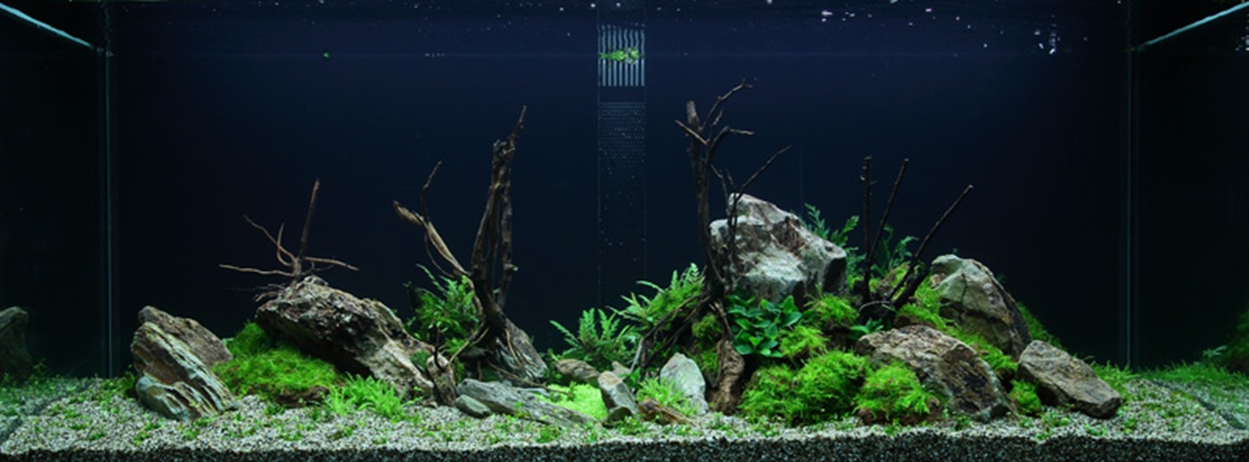 A true abundance of details in vigorous, green hills of rocks and Christmas-moss makes you think of prehistoric landscapes. Pinnatifida, Bolbitis and Aponogeton are with their big leaves placed in the back. A wealth of small, varying leaf forms from Pogostemon, Ranunculus and Anubias populate the moss hills. Utricularia and Rotala sp. bonsai live in beautiful harmony in the little bog between the hills.