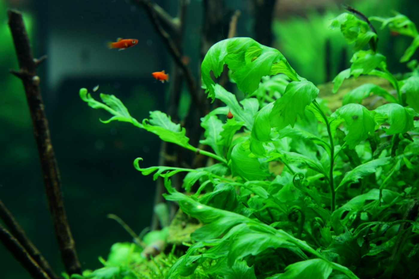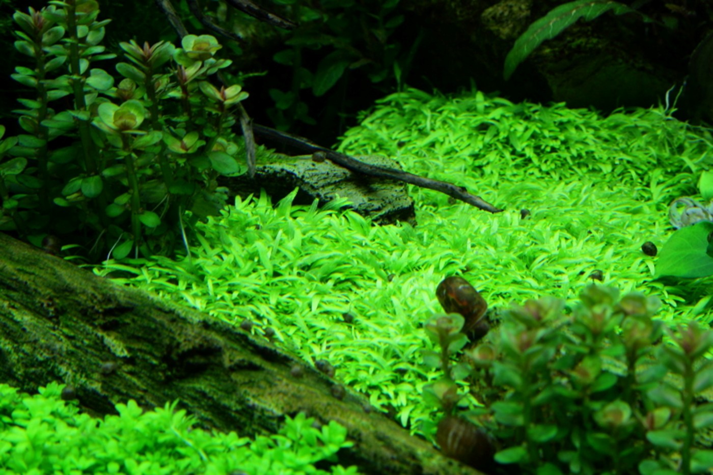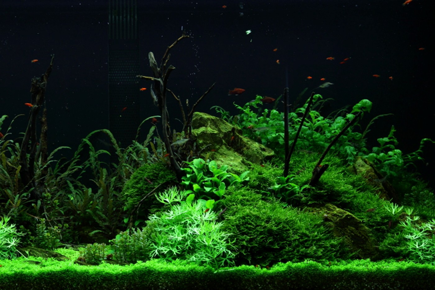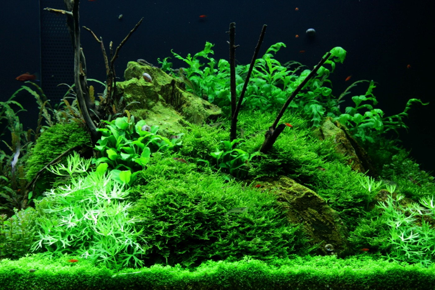 A true abundance of details in vigorous, green hills of rocks and Christmas-moss makes you think of prehistoric landscapes. Pinnatifida, Bolbitis and Aponogeton are with their big leaves placed in the back. A wealth of small, varying leaf forms from Pogostemon, Ranunculus and Anubias populate the moss hills. Utricularia and Rotala sp. bonsai live in beautiful harmony in the little bog between the hills.