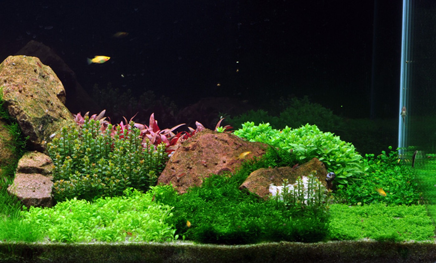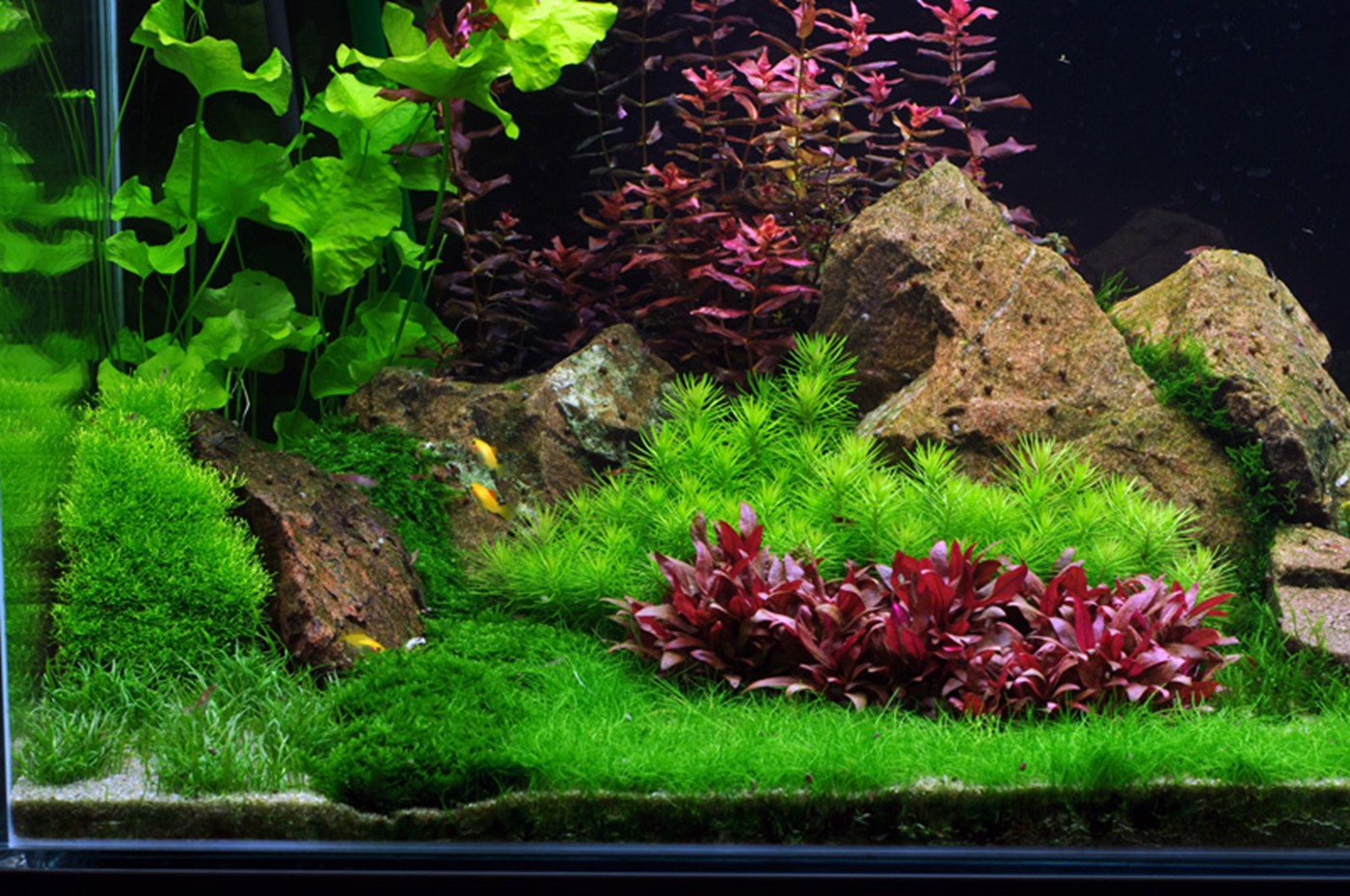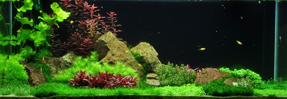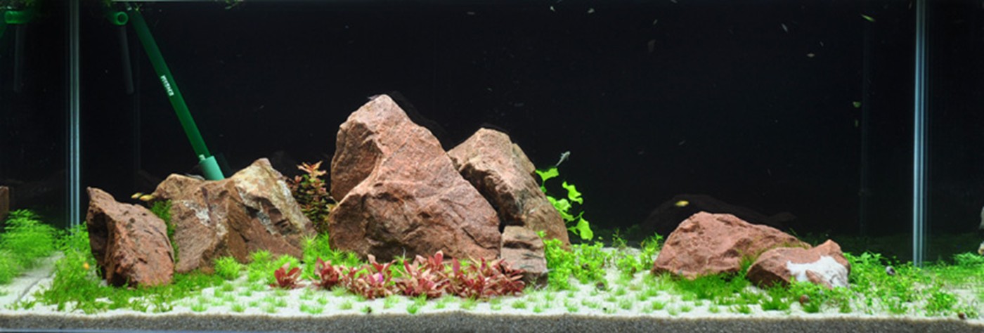 A world of 1-2-Grow! All variants are represented in this aquarium. The three tallest plants - Nymphoides, Rotala and Heteranthera - show up behind a mountain range of red granite. In between the large rocks, the moss is wedged and creates deep green glaciers. The clear, light green Riccia is tied to a couple of lava stones furthest to the left. Pogostemon and Staurogyne are accentuated in their leaf form as well as colour by Alternanthera, which together with Rotala creates focus areas. Eleocharis, moss, Hemianthus and Marselia, together with Glossostigma and Lilaeopsis, create a vigorous and varied plain landscape, where the little, compact Rotala 'Bonsai' shoots up here and there. A more harmonious and calm layout can be achieved by using a smaller amount of different foreground plants.