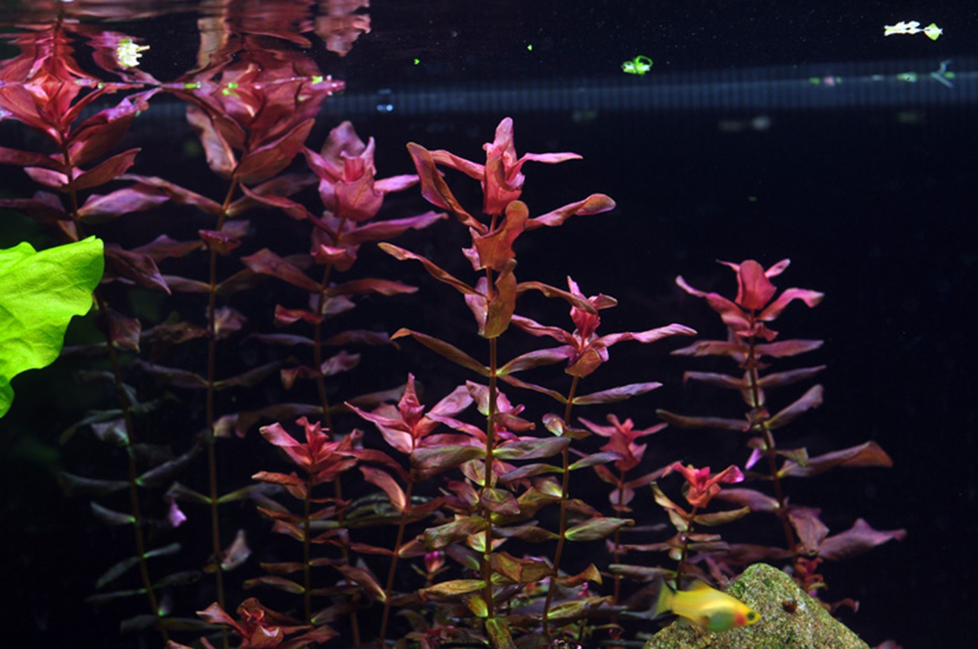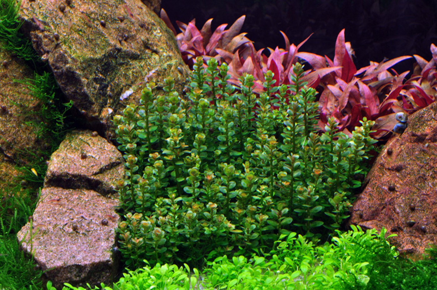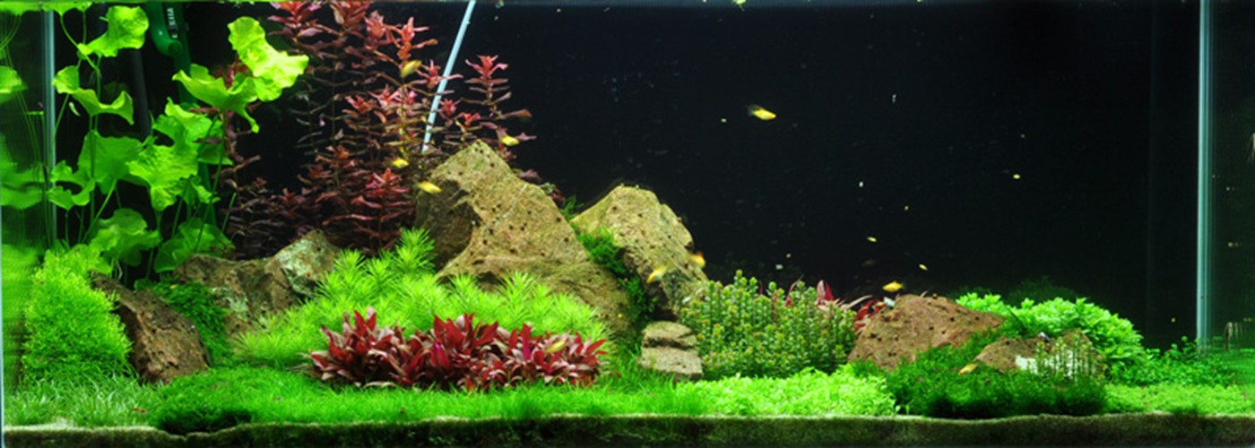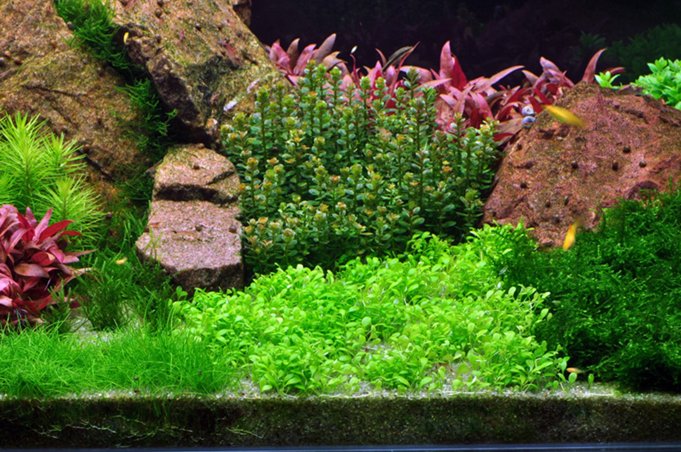 A world of 1-2-Grow! All variants are represented in this aquarium. The three tallest plants - Nymphoides, Rotala and Heteranthera - show up behind a mountain range of red granite. In between the large rocks, the moss is wedged and creates deep green glaciers. The clear, light green Riccia is tied to a couple of lava stones furthest to the left. Pogostemon and Staurogyne are accentuated in their leaf form as well as colour by Alternanthera, which together with Rotala creates focus areas. Eleocharis, moss, Hemianthus and Marselia, together with Glossostigma and Lilaeopsis, create a vigorous and varied plain landscape, where the little, compact Rotala 'Bonsai' shoots up here and there. A more harmonious and calm layout can be achieved by using a smaller amount of different foreground plants.