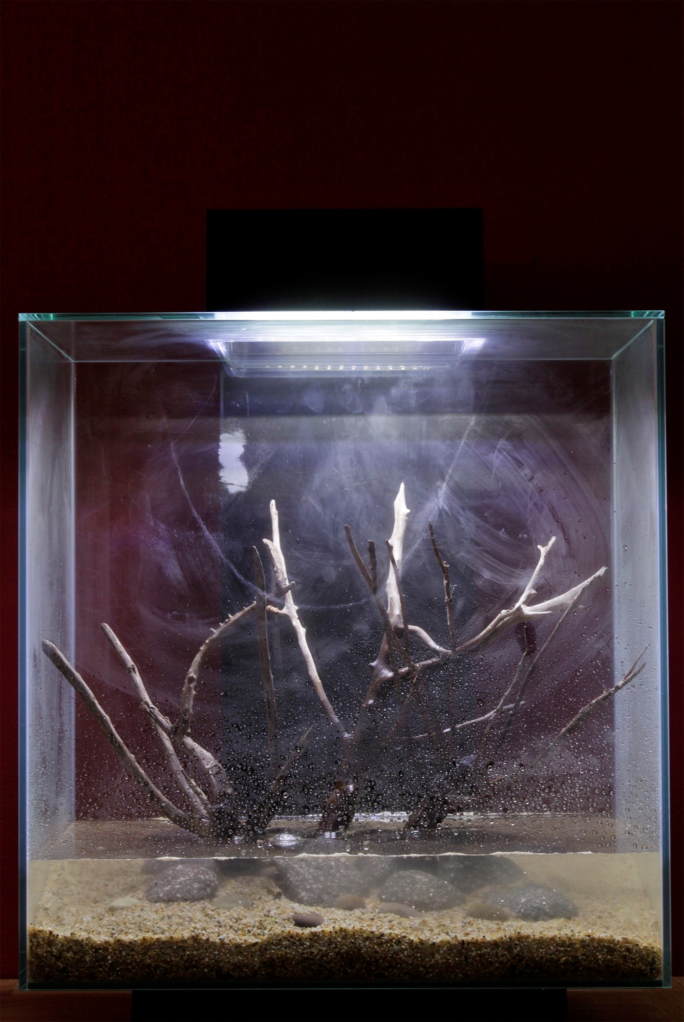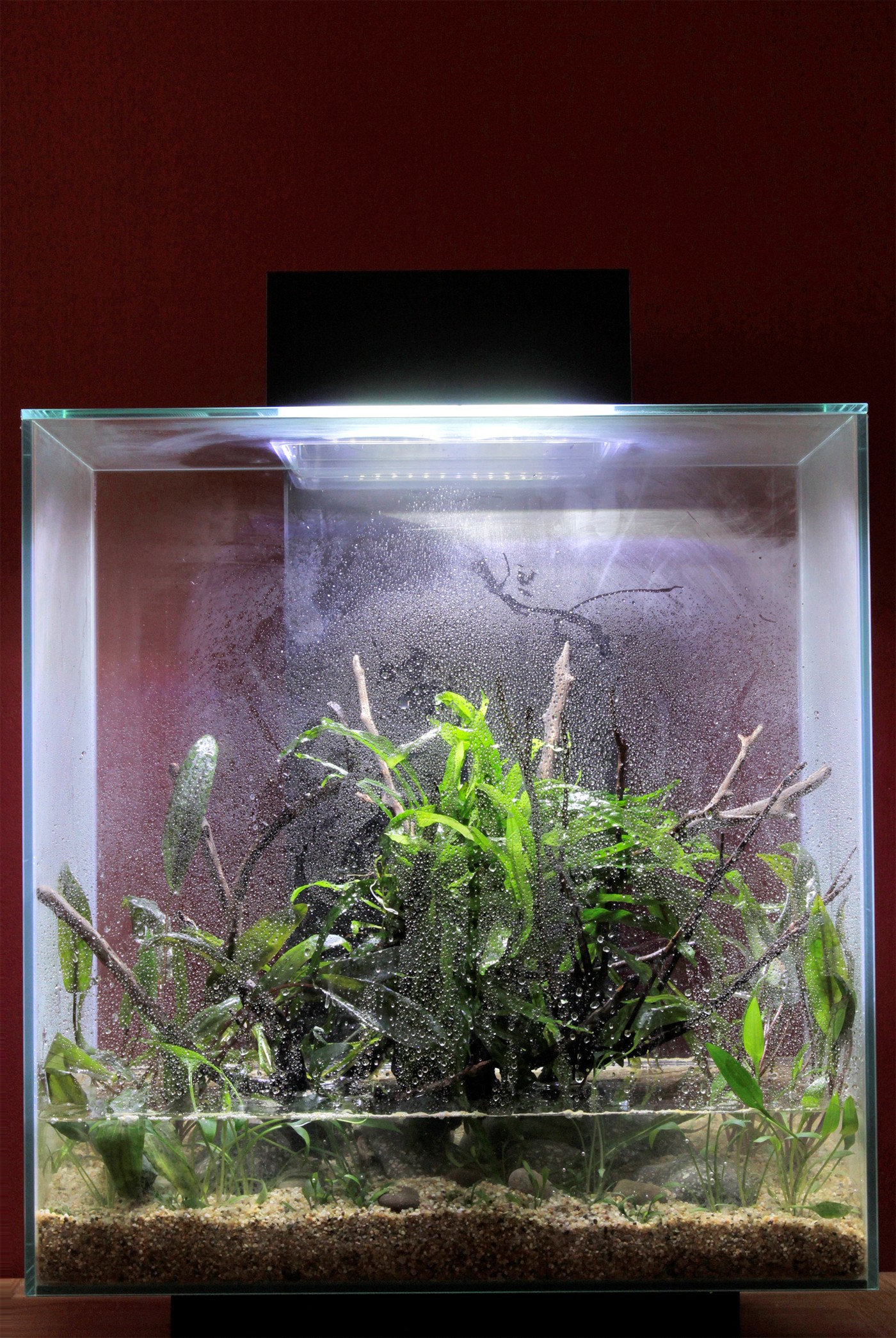 A classic layout that is easy to maintain with slow growing, easy plants - here with several Cryptocorynes and Microsorum. The layout has been built up around the nano root and the small, round stones in a Fluval Edge 46L with LED-lighting. Microsorum is the focus area and the different Crypts form the fore-, middle- and background. In the front, there is parva, low with small fresh green leaves. In the middle, there are several wendtii-types and in the back, there is balansae with the curly leaves. This selection of plants means that no trimming of the plants is required within the first couple of months.