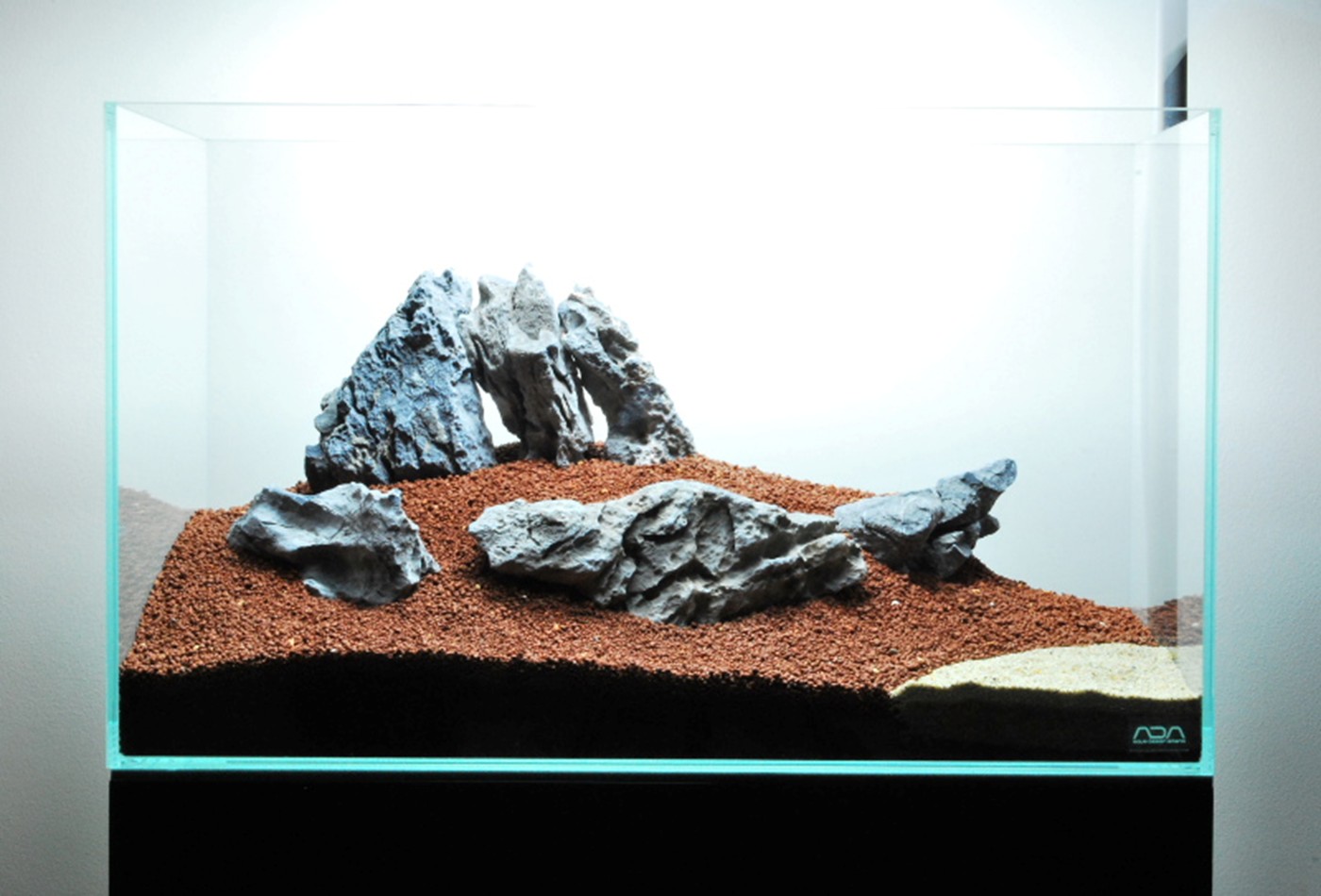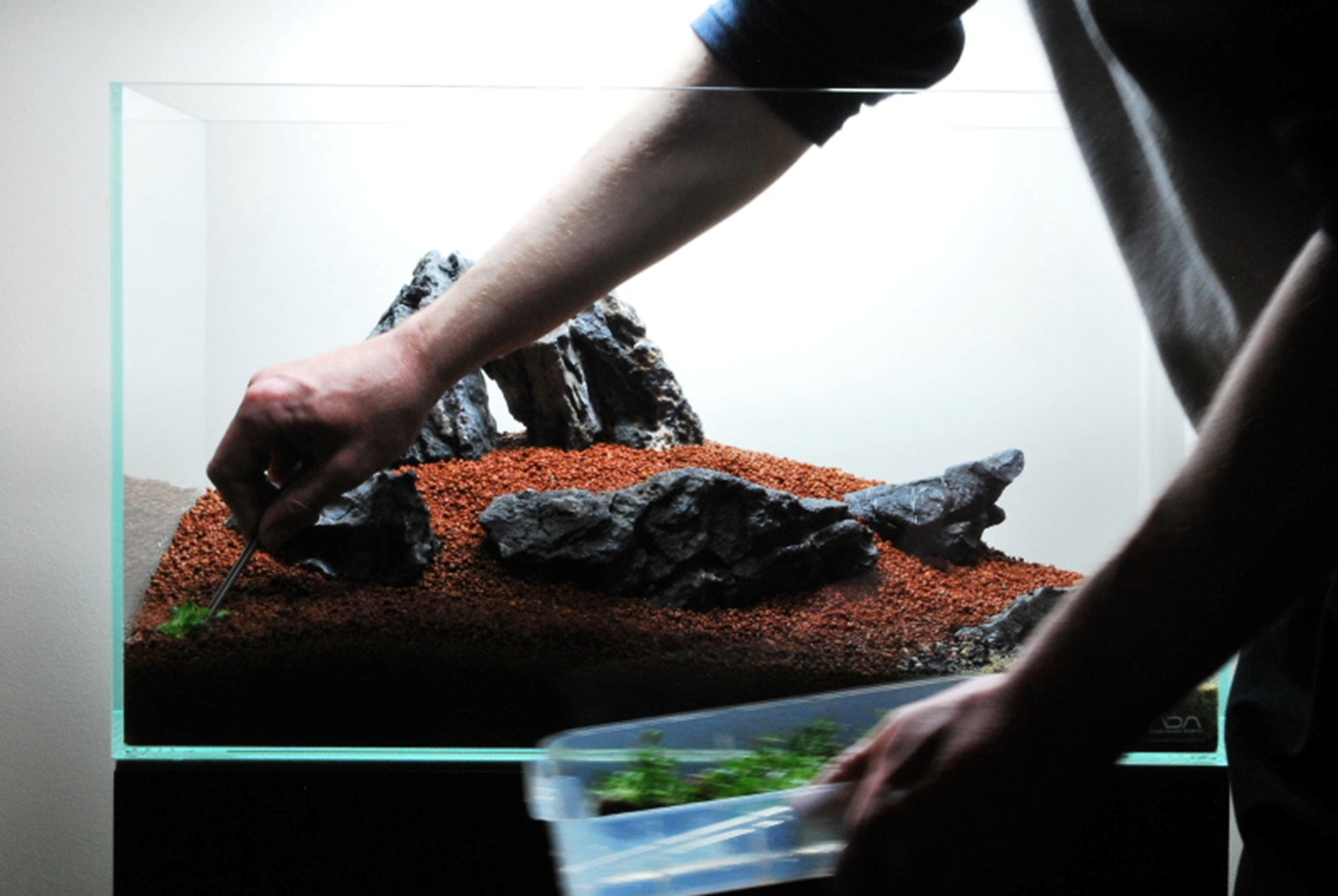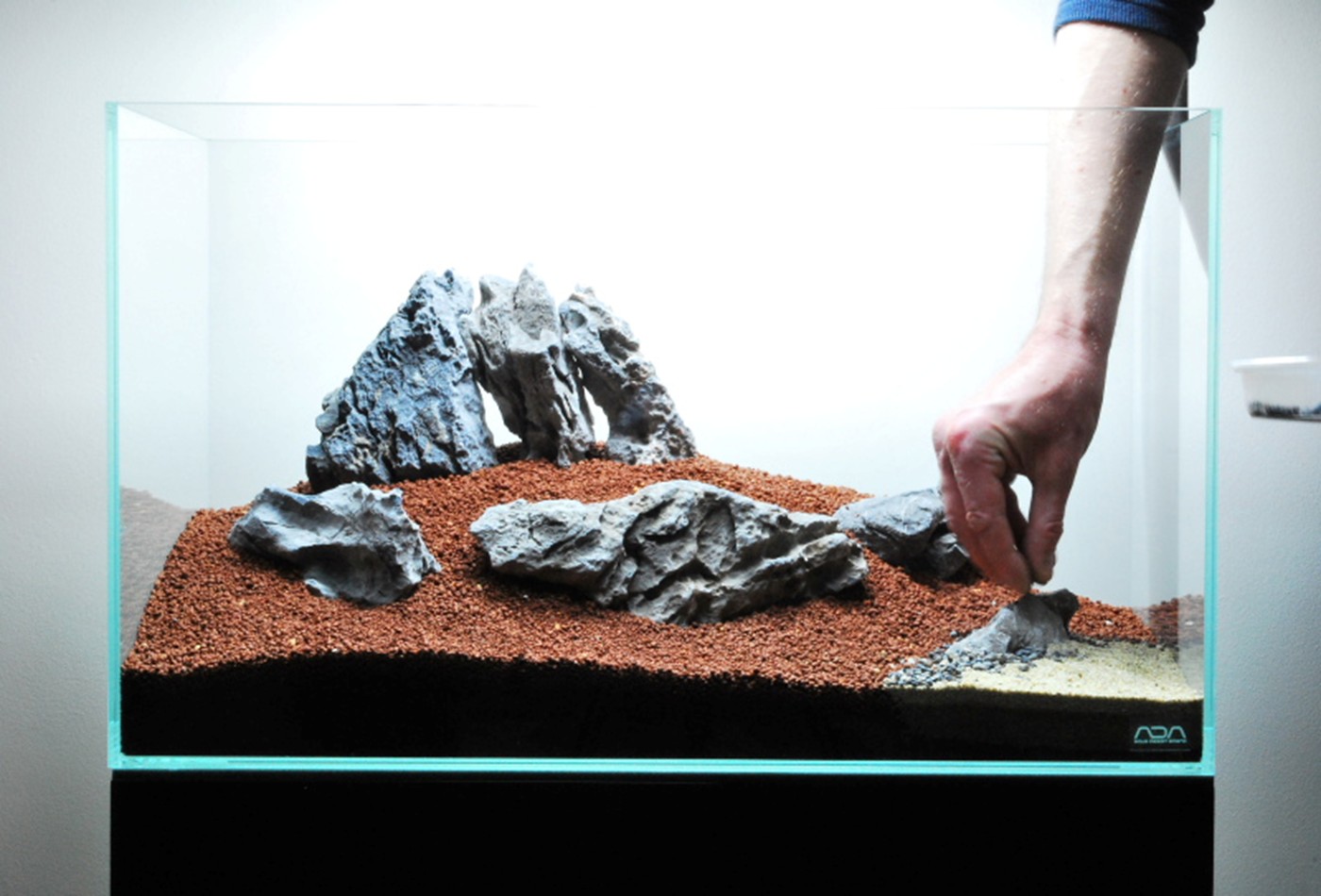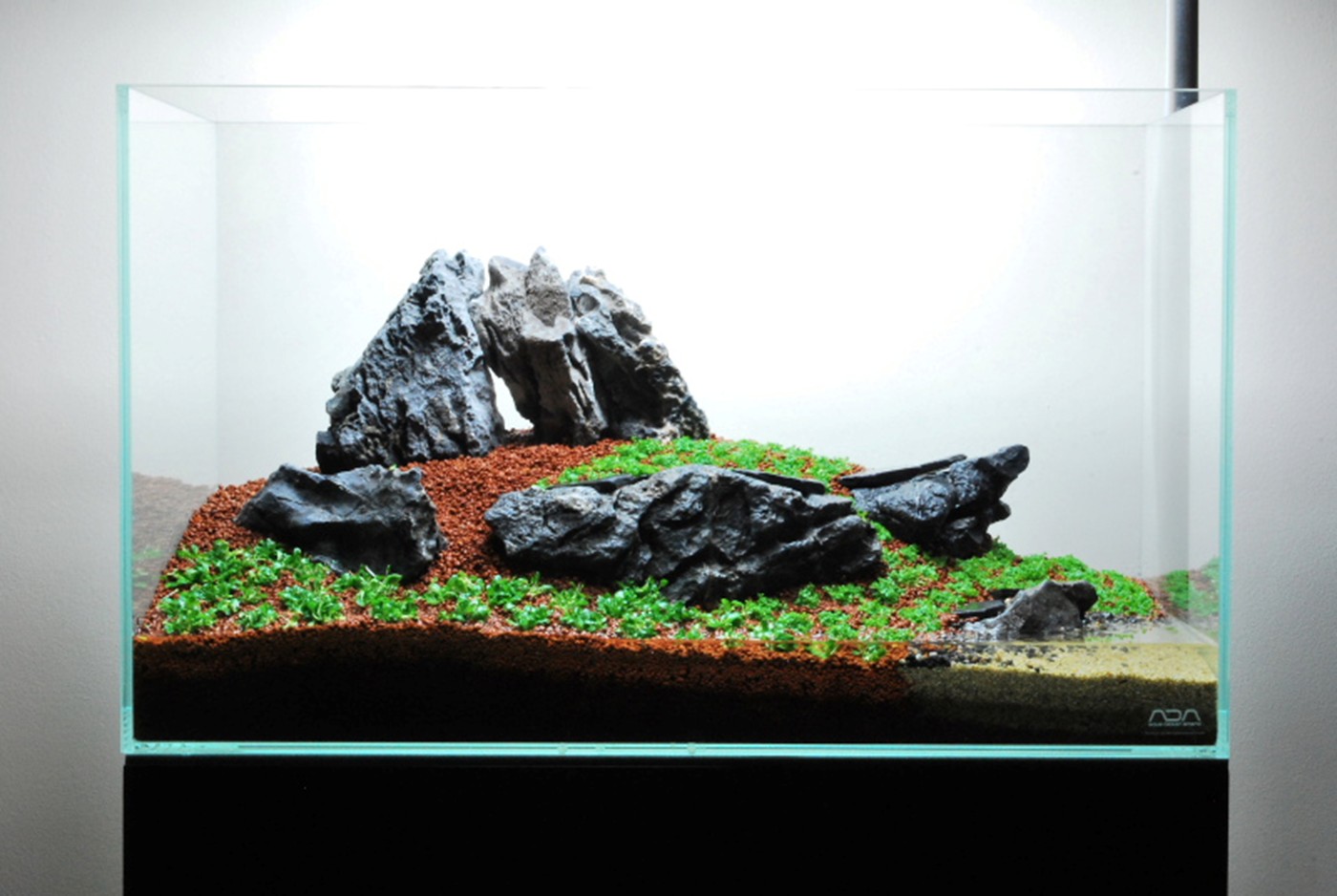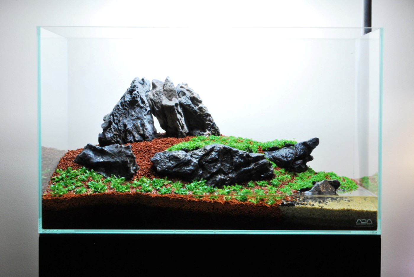 James Starr-Marshall has visited Harborough Rocks in Peak District National Park in Derbyshire, England, and has been inspired to depict the robust as well as mobile landscape in the aquarium. The location of the rocks is an attempt to reproduce forms, lines and texture from the natural wonder with the creation of a plateau, from where groups of Hemianthus can droop down. Glossostigma has been selected as the slightly darker, green foreground, and the group of tenellus breaks the carpet plants towards the rock in the background.