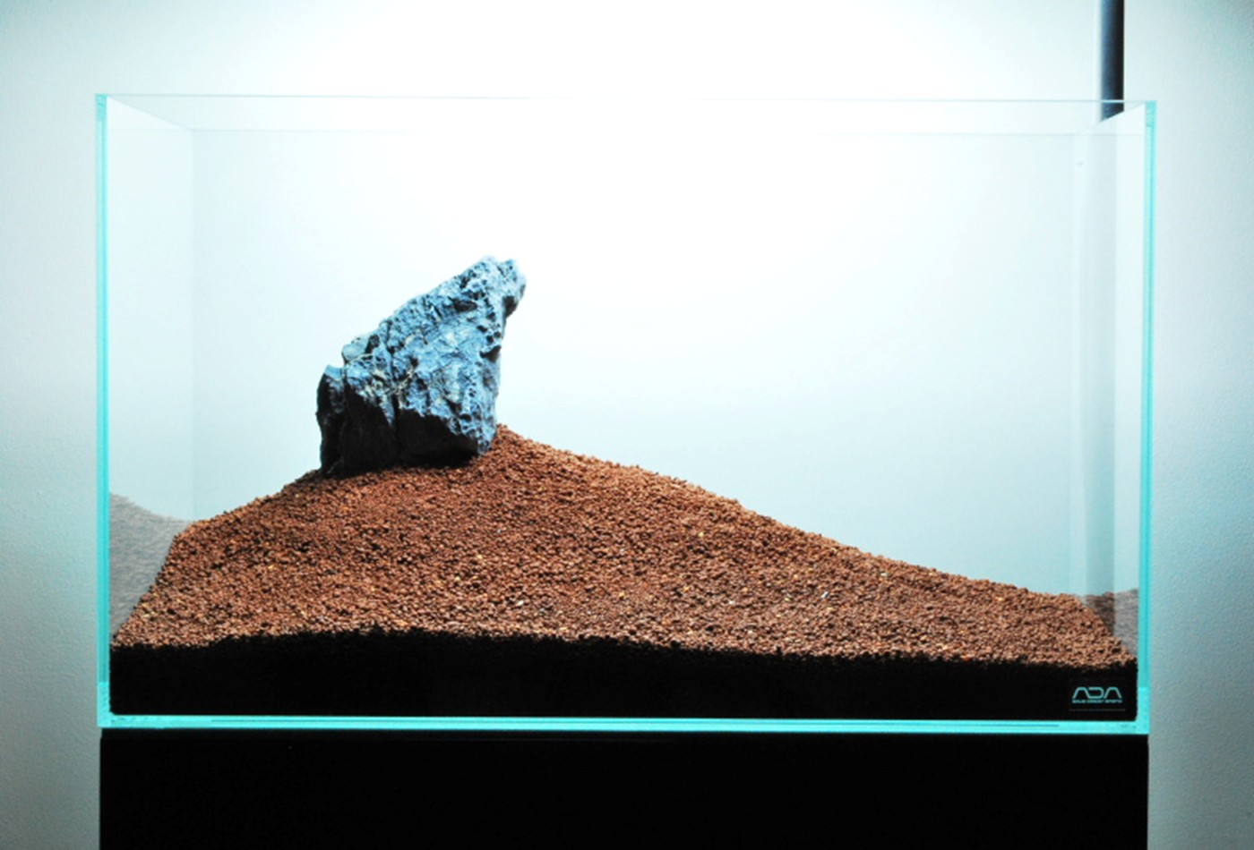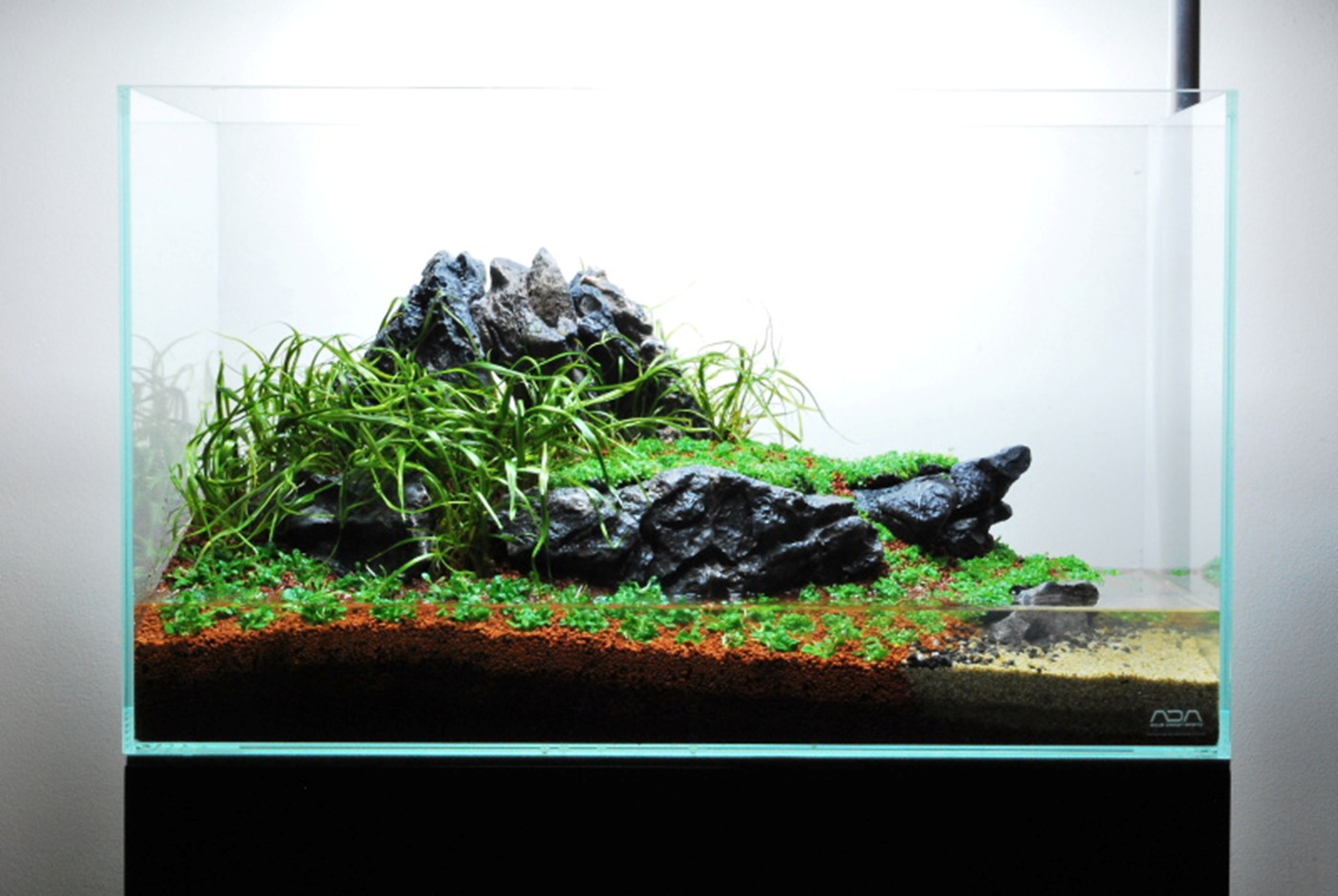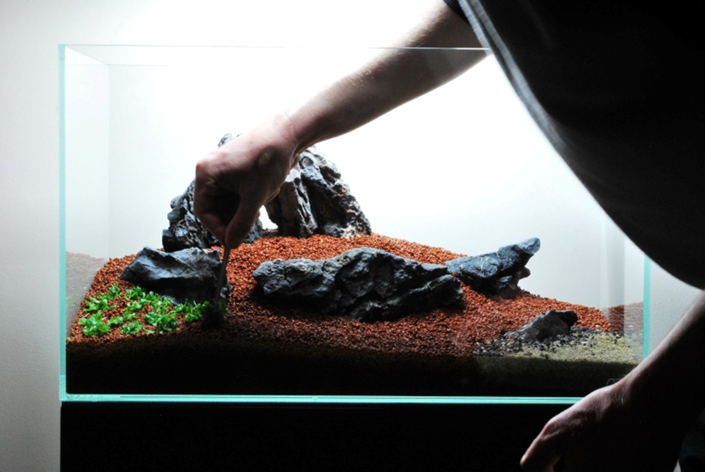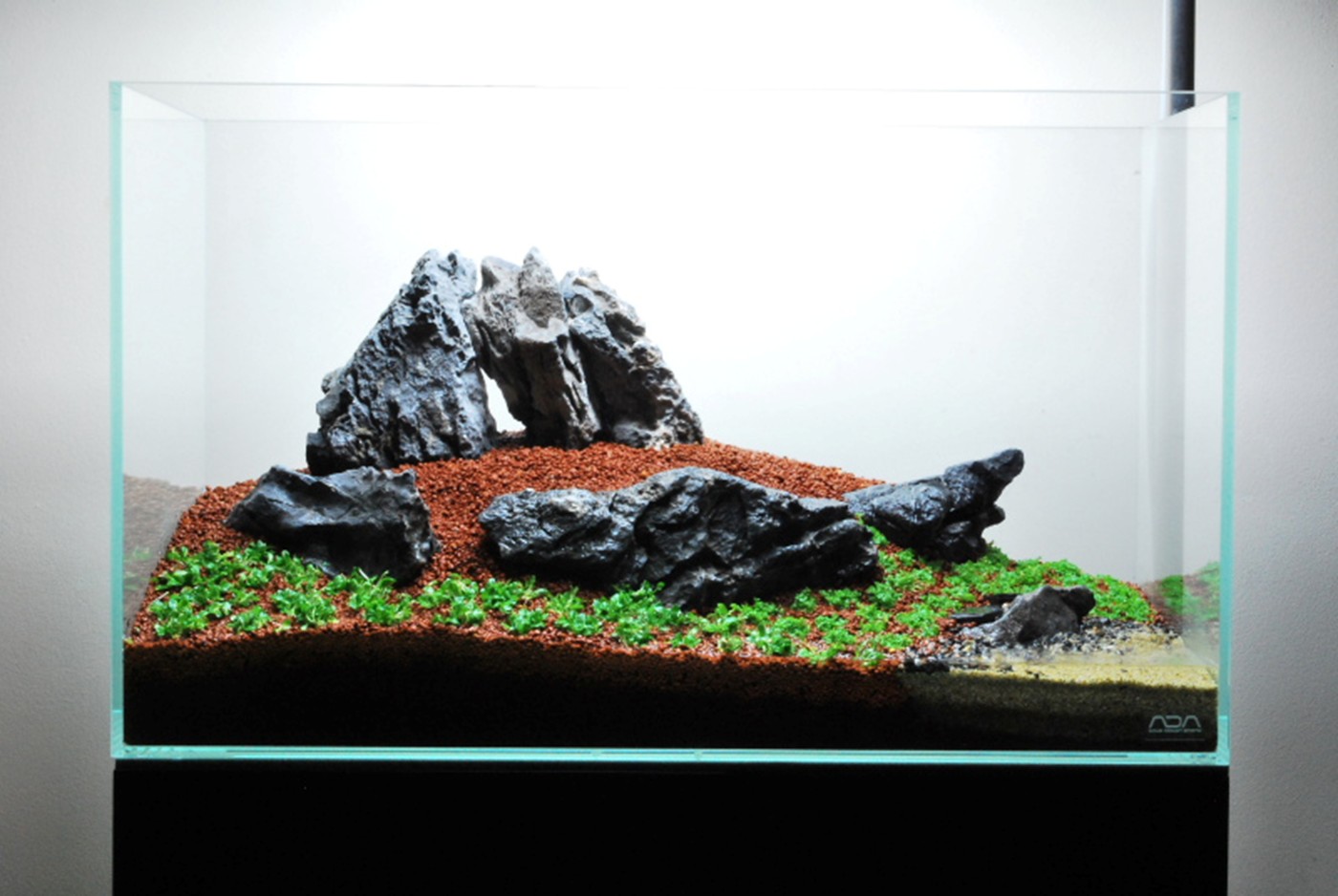James Starr-Marshall has visited Harborough Rocks in Peak District National Park in Derbyshire, England, and has been inspired to depict the robust as well as mobile landscape in the aquarium. The location of the rocks is an attempt to reproduce forms, lines and texture from the natural wonder with the creation of a plateau, from where groups of Hemianthus can droop down. Glossostigma has been selected as the slightly darker, green foreground, and the group of tenellus breaks the carpet plants towards the rock in the background.