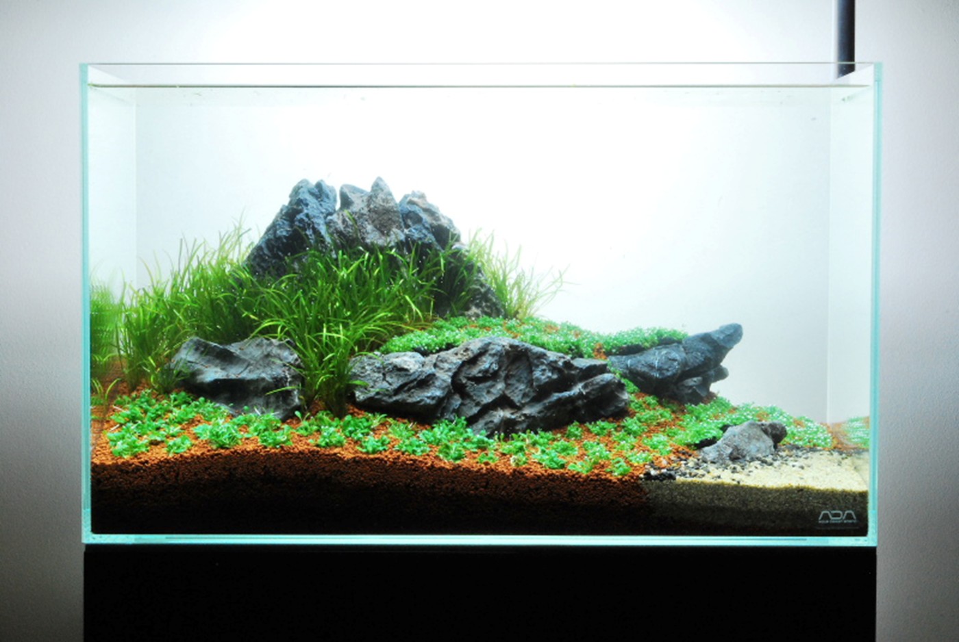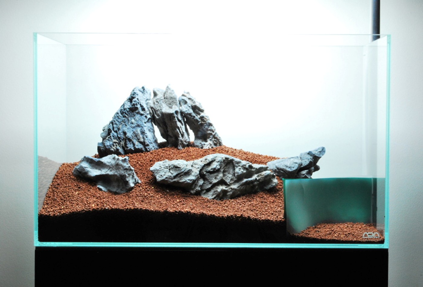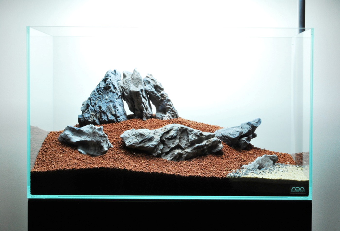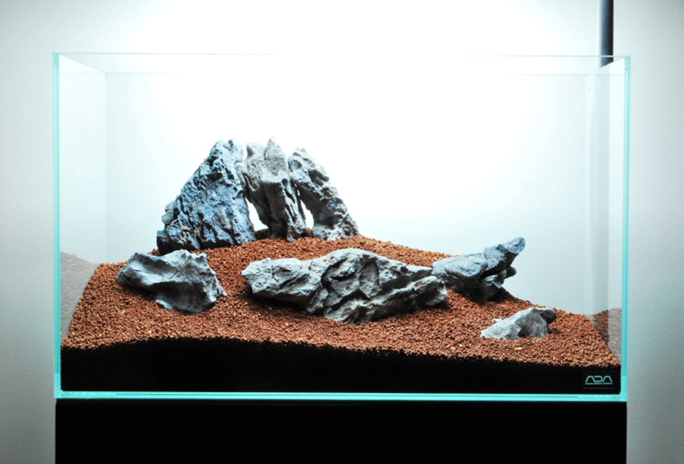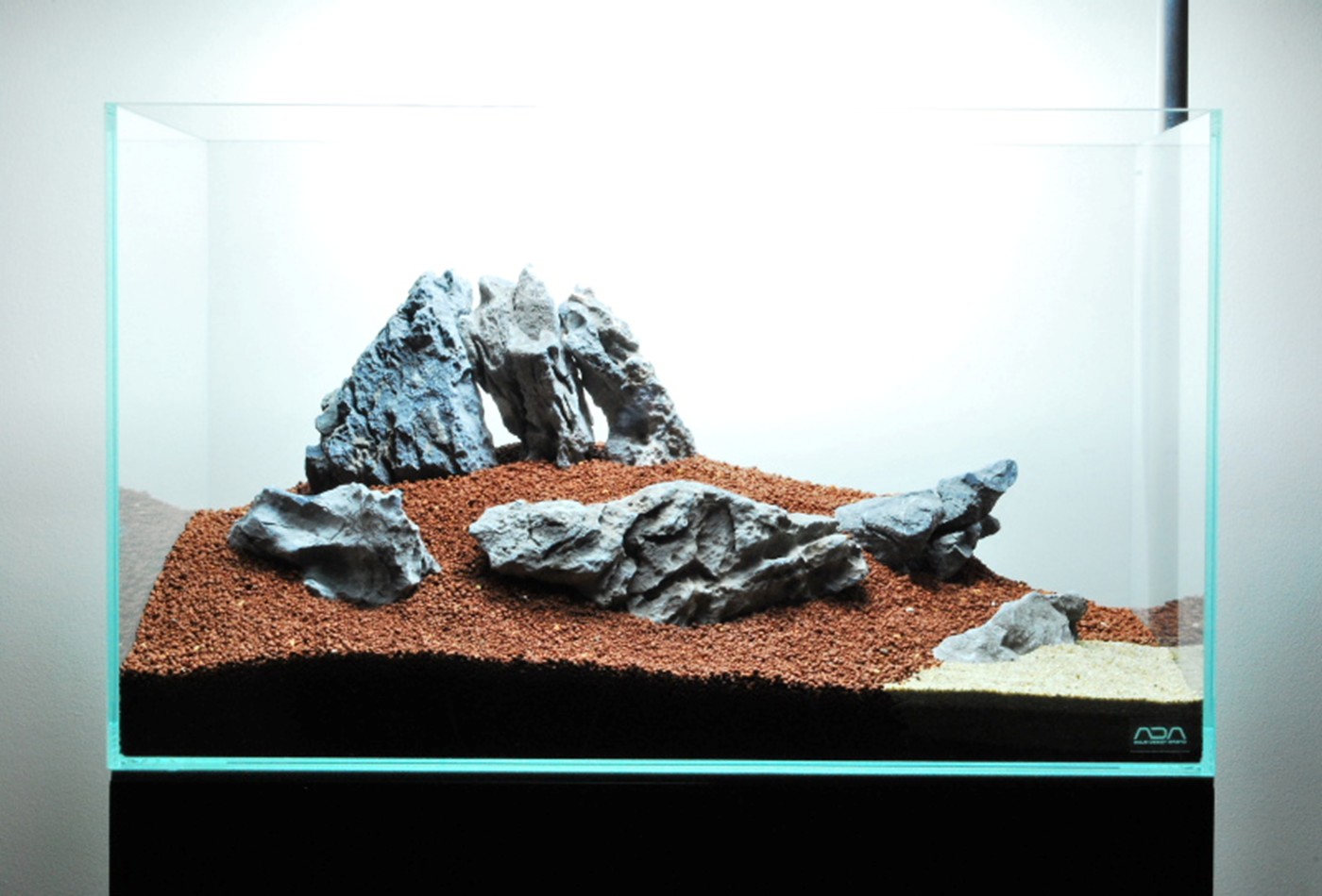 James Starr-Marshall has visited Harborough Rocks in Peak District National Park in Derbyshire, England, and has been inspired to depict the robust as well as mobile landscape in the aquarium. The location of the rocks is an attempt to reproduce forms, lines and texture from the natural wonder with the creation of a plateau, from where groups of Hemianthus can droop down. Glossostigma has been selected as the slightly darker, green foreground, and the group of tenellus breaks the carpet plants towards the rock in the background.