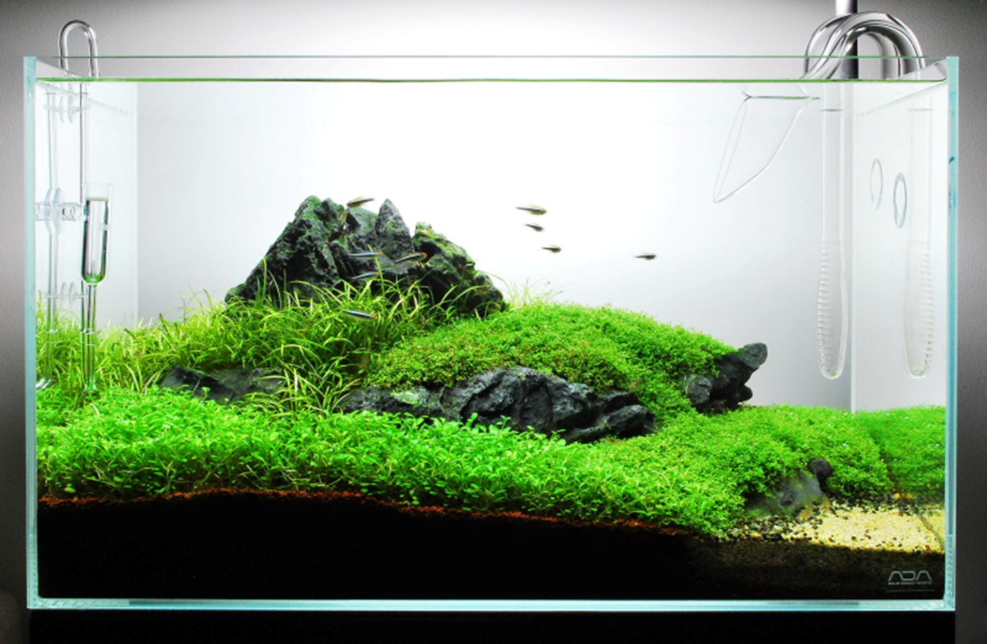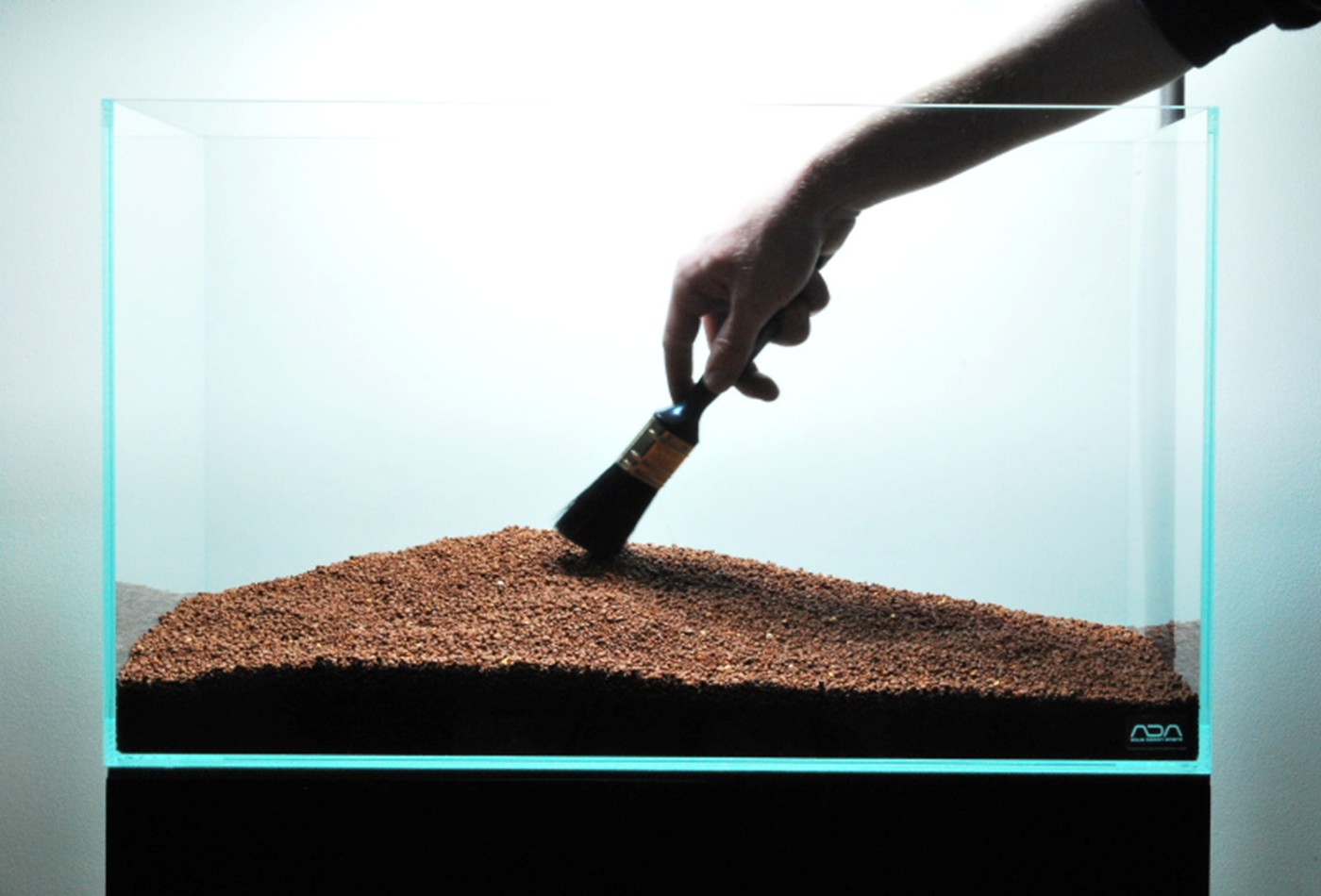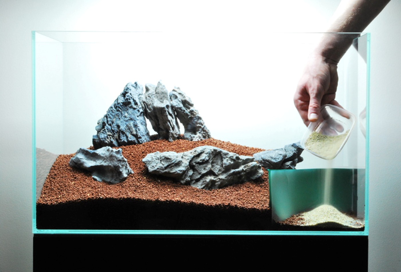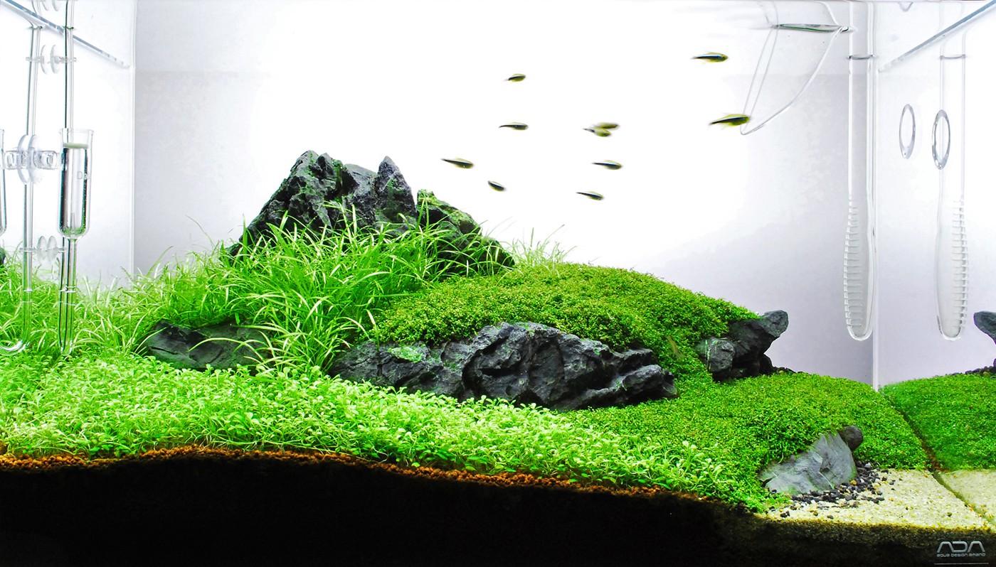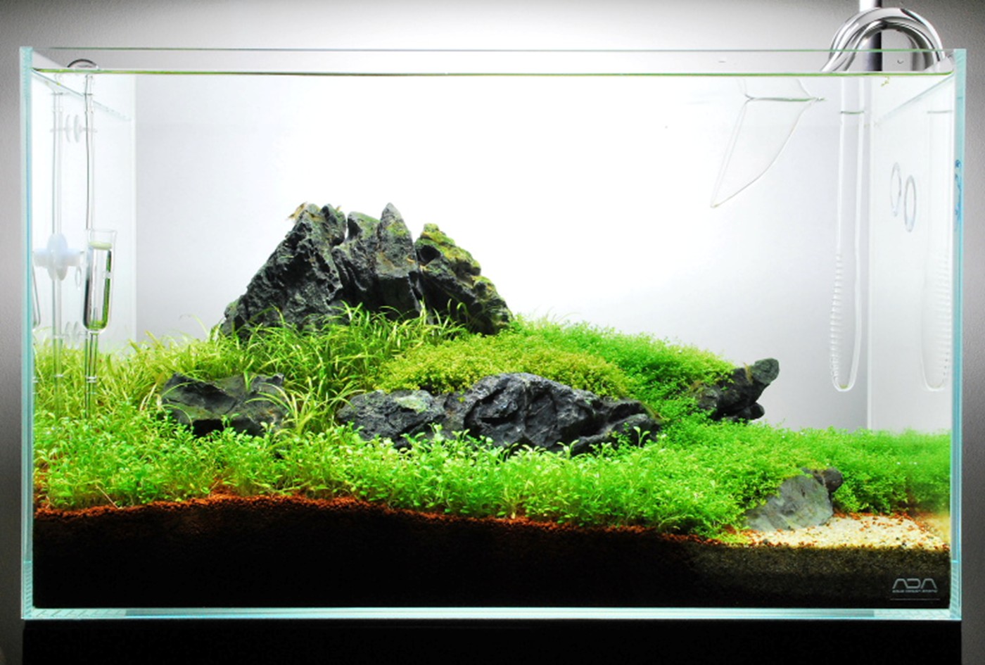 James Starr-Marshall has visited Harborough Rocks in Peak District National Park in Derbyshire, England, and has been inspired to depict the robust as well as mobile landscape in the aquarium. The location of the rocks is an attempt to reproduce forms, lines and texture from the natural wonder with the creation of a plateau, from where groups of Hemianthus can droop down. Glossostigma has been selected as the slightly darker, green foreground, and the group of tenellus breaks the carpet plants towards the rock in the background.