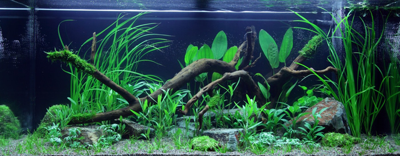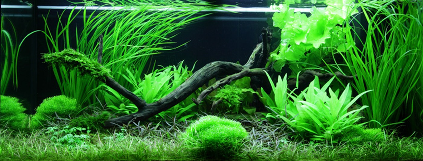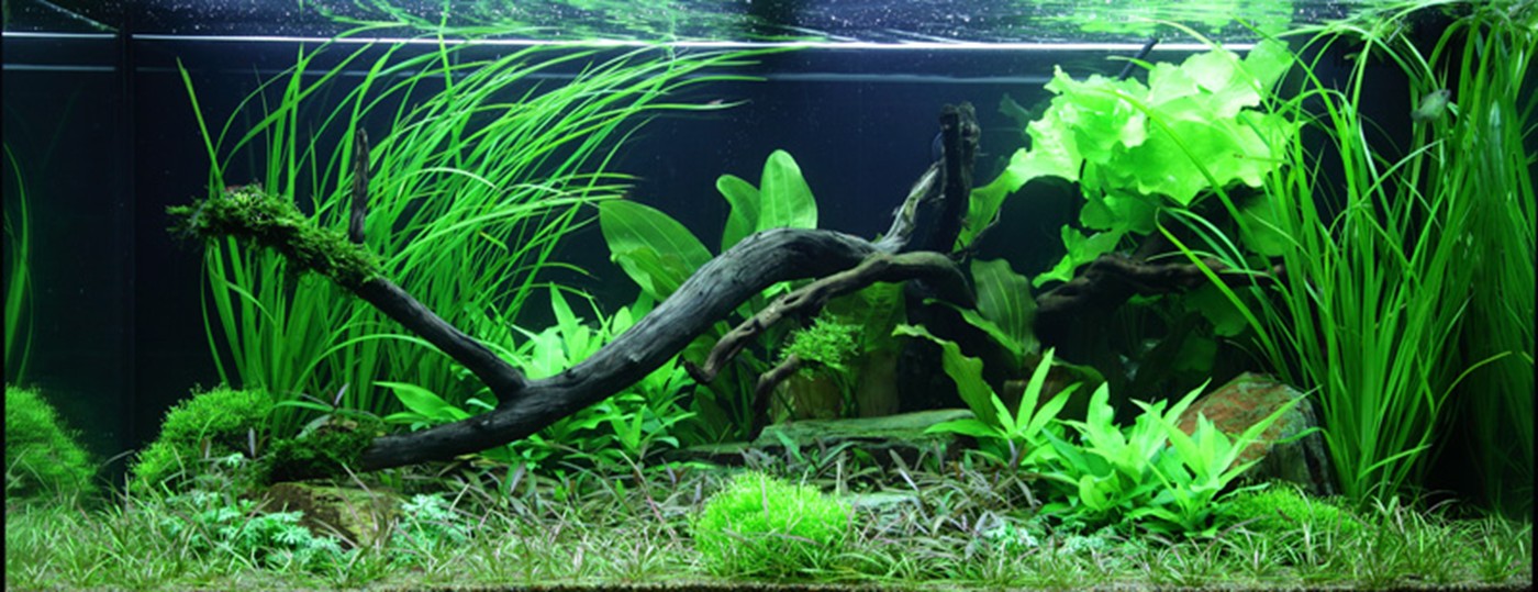 Large and coloured leaves from Echinodorus, Nymphoides and Hygrophila are encircled by slim, grass-like leaves from Cyperus and tenellus. Moss tied to the large branches provides a sense of age and perspective, while the small islands of Riccia create focus points. Araguaia must regularly be trimmed hard backwards in order for it to stay low and dense.
