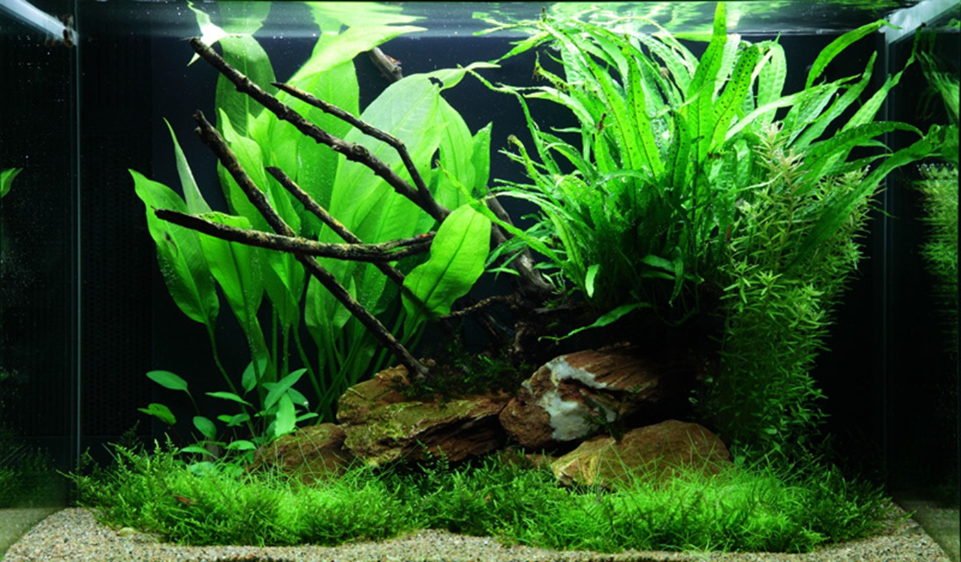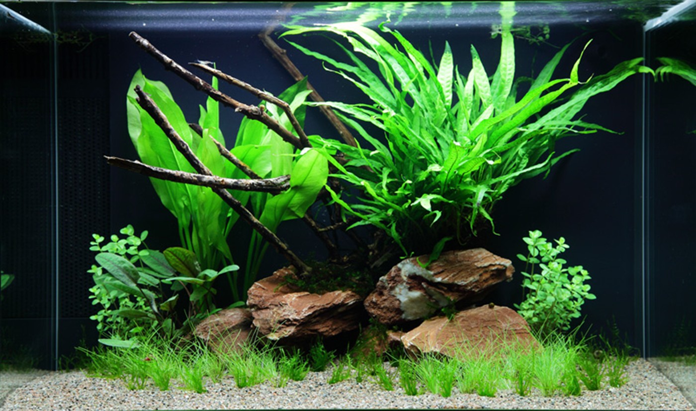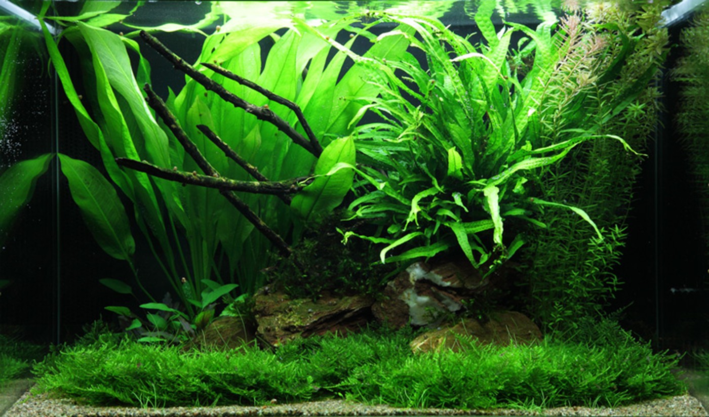 Easy and safe. All plants are able to handle relatively low lighting and no addition of CO2 - but better lighting and CO2 naturally gives a more beautiful result. Rotala will repay with reddish shoot tips and Eleocharis with a denser and more compact growth. The hardy Spiky moss has been divided into small tufts that have been tucked into the ground layer. The dark moss carpet suits the light-green Eleocharis really well.