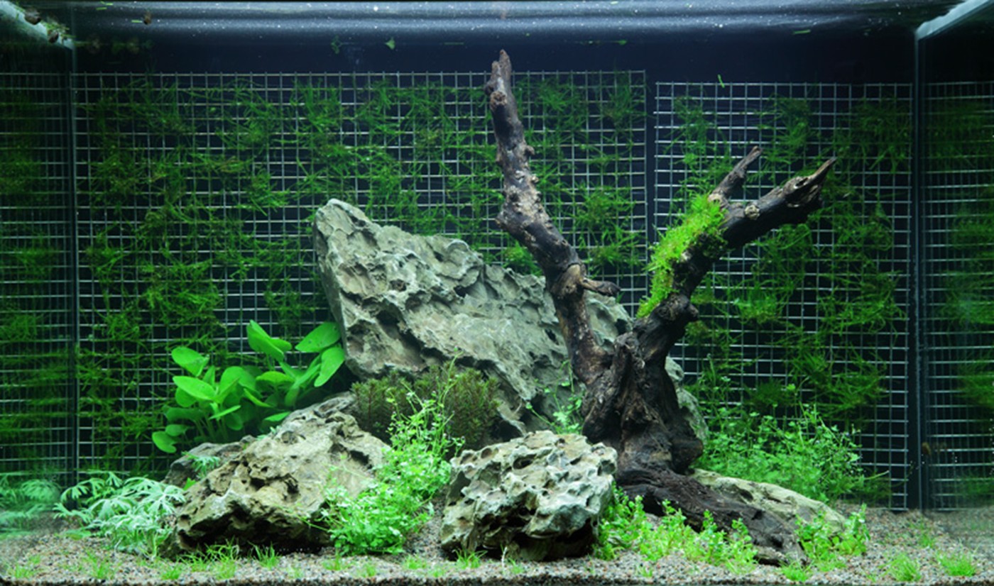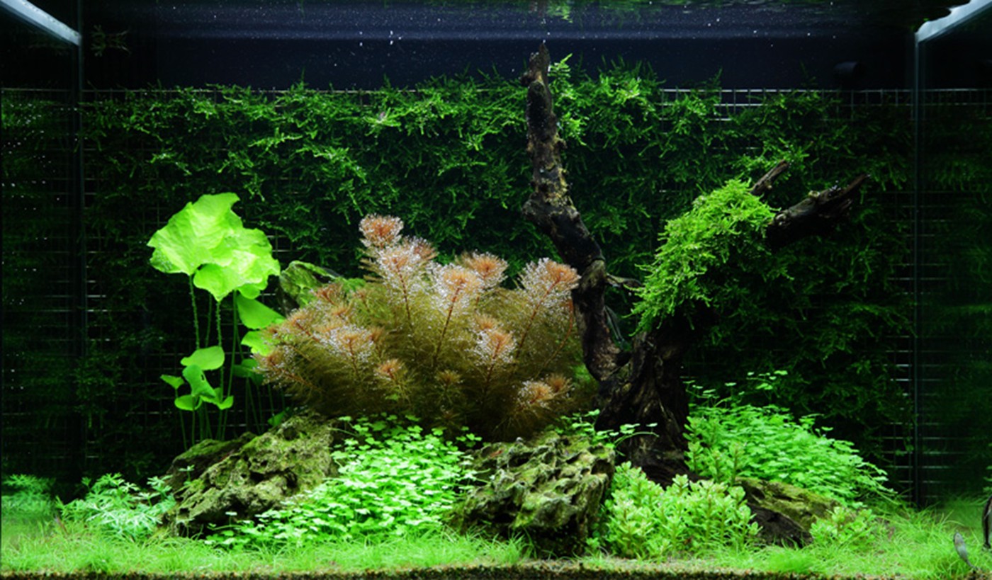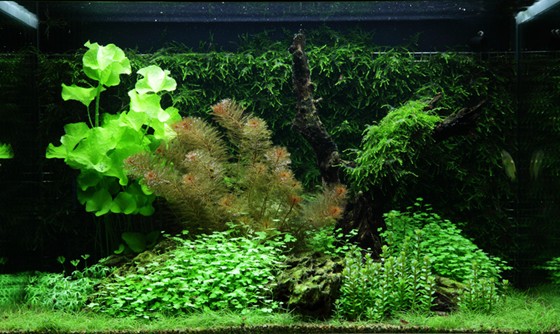 A vigorous, deep-green wall of Weeping moss accentuates the orange-red Myriophyllum and the two light-green plants, Nymphoides and Hydrocotyle. The last-mentioned plant droops in cascades towards the low, dense Eleocharis mini, which elegantly brings out the small lobated leaves of Hydrocotyles. The warm, orange-red colour from Myriophyllum is also found in the tips of the group of Rotala sp. bonsai.