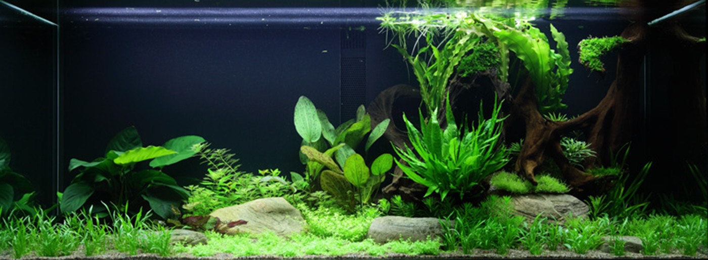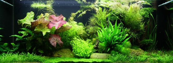 Diversity and vigour makes an aquarium exciting, but requires experience and a lot of maintenance. The shape of the leaves, colours and sizes have been thoroughly mixed in order to create life and diversity. Just as in nature, the plants are fighting for space and light. The strongest and fastest growing plants must be cut often to prevent them from suffocating the weaker plants. Obviously, ground covering plants must not be shaded, so it is important to thin out the floating plants intensively on a regular basis.