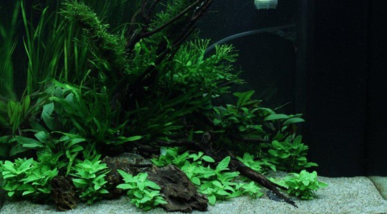 A burst of lush green spreads out from the left corner of this aquarium. Vallisneria 'Tiger' and Spiky-moss on wood creates an upright movement, caught by Microsorum 'Narrow' and 'Windeløv', passing it on to Staurogyne repens amongst the horizontal rocks and wood. Cryptocoryne 'Brown' and 'Petchii' add a little difference in color to the green shades.