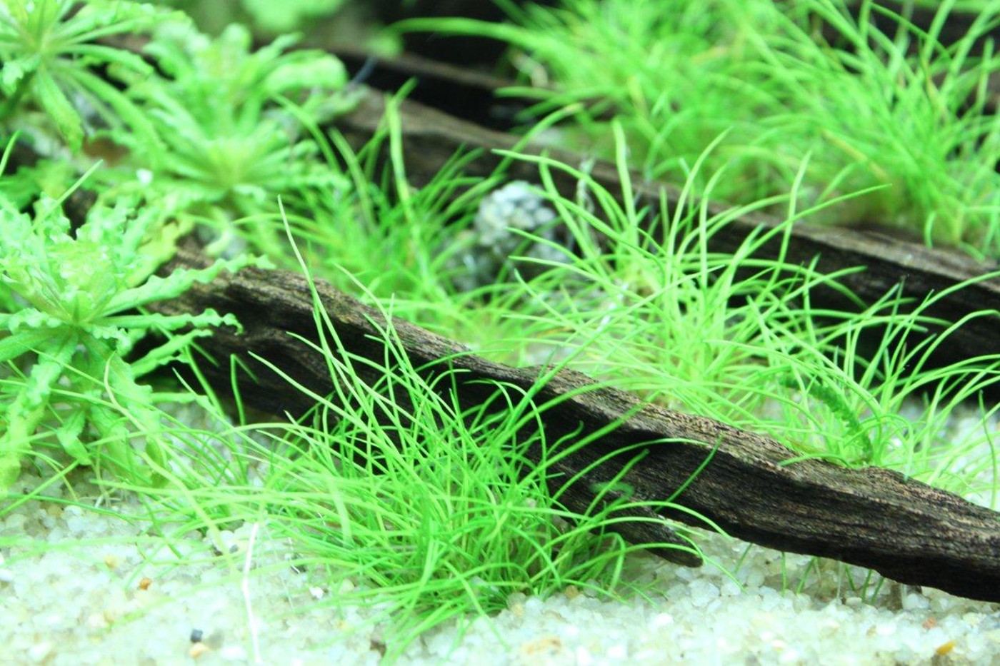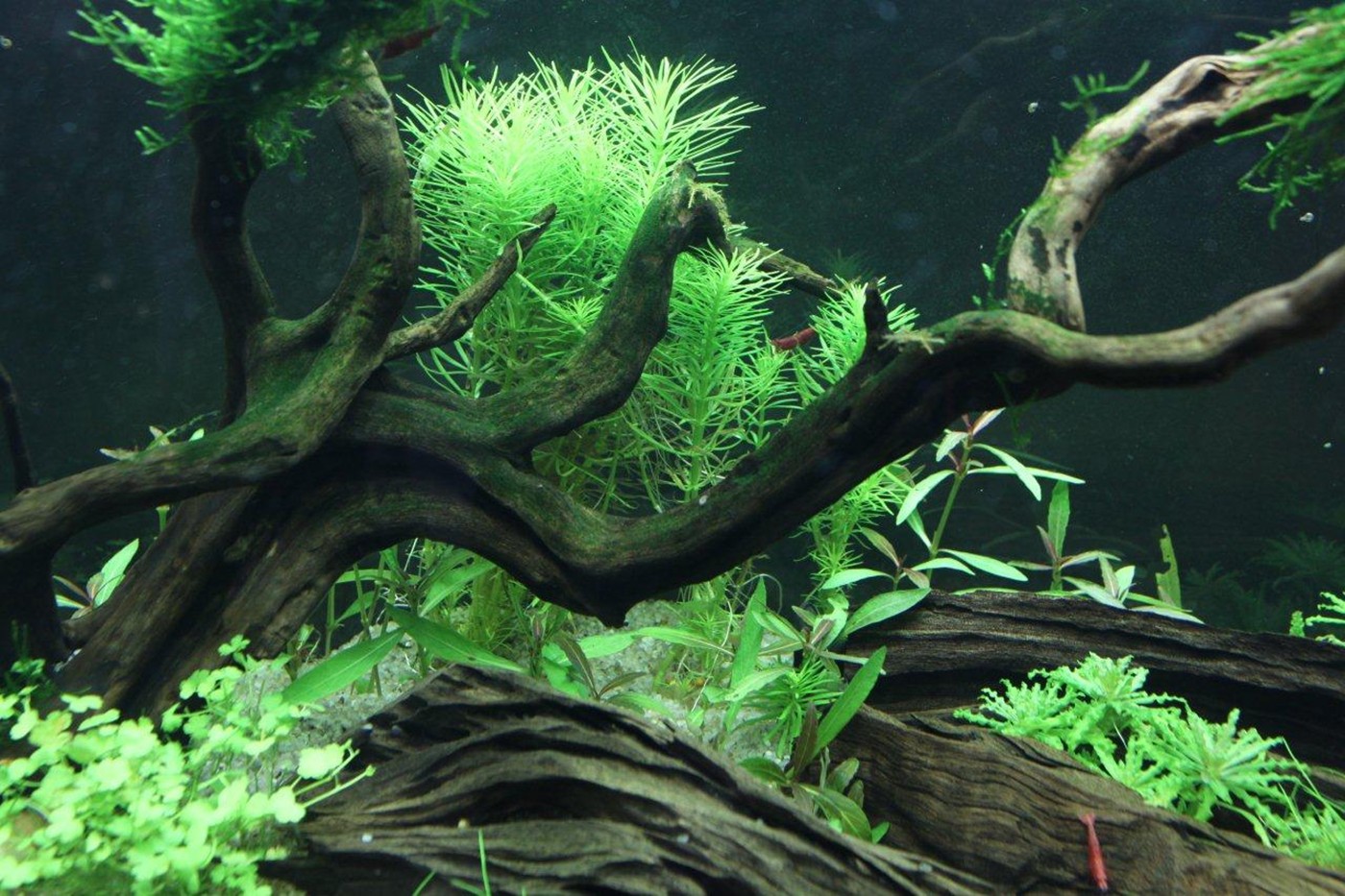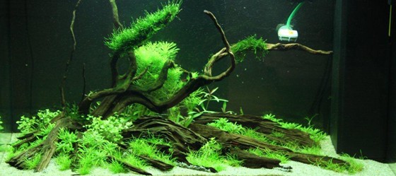 Ancient techniques of Bonzai are clearly the inspiration here. The lines and direction of wood in the hardscape are perfect. Choosing only plants with a soft and tiny appearance enhance the expression wanted. Only Myriophyllum mattogrossense and Hydrocotyle tripartite are really fast growing, so the amount of work, to maintain the expression is quite low.