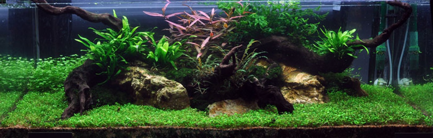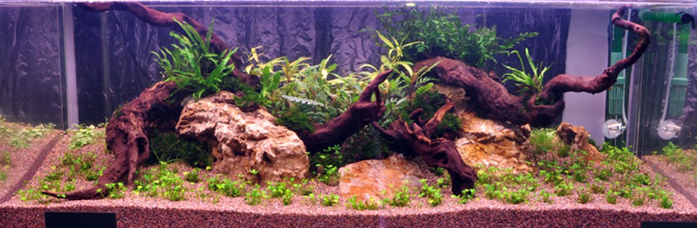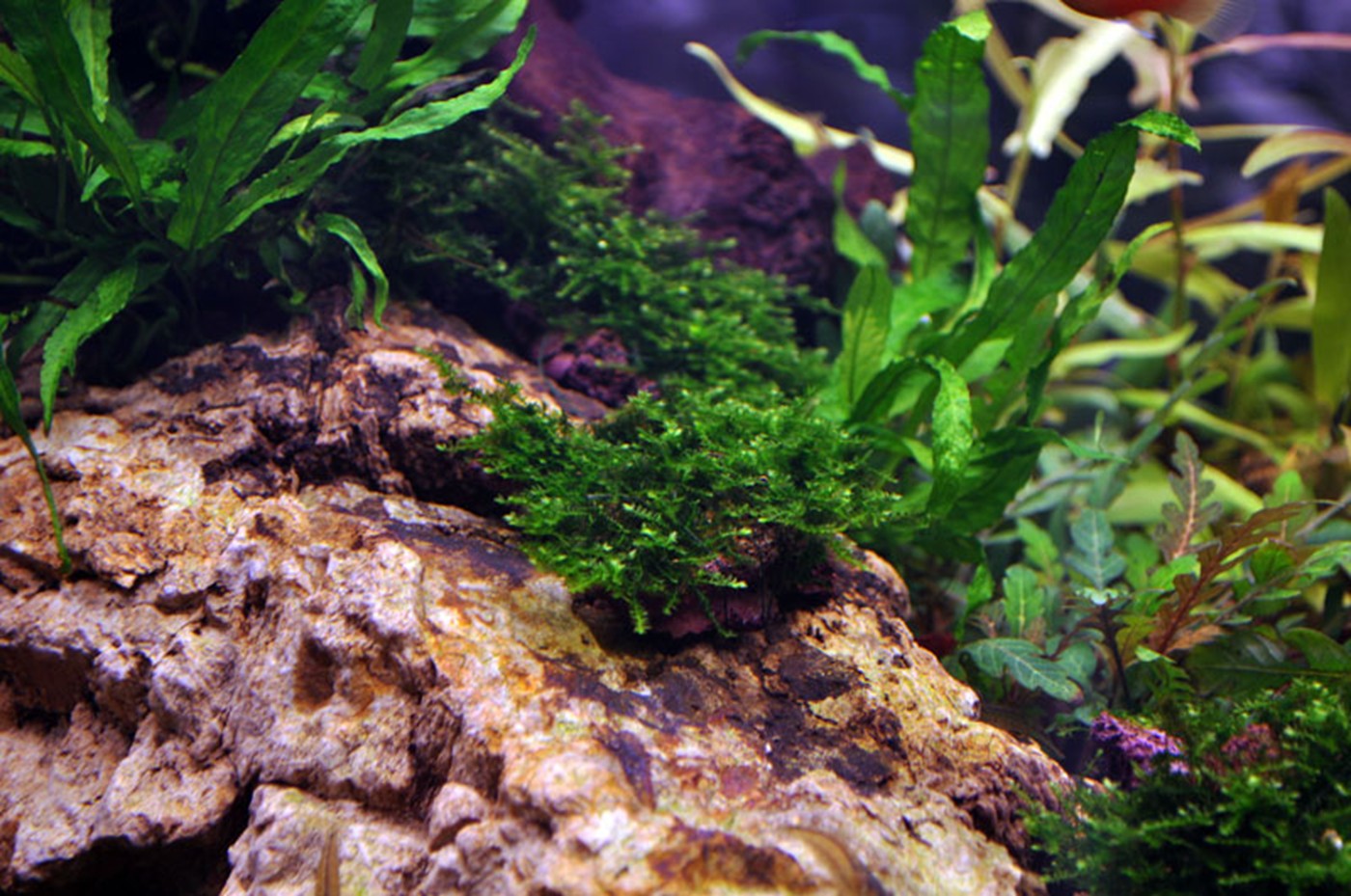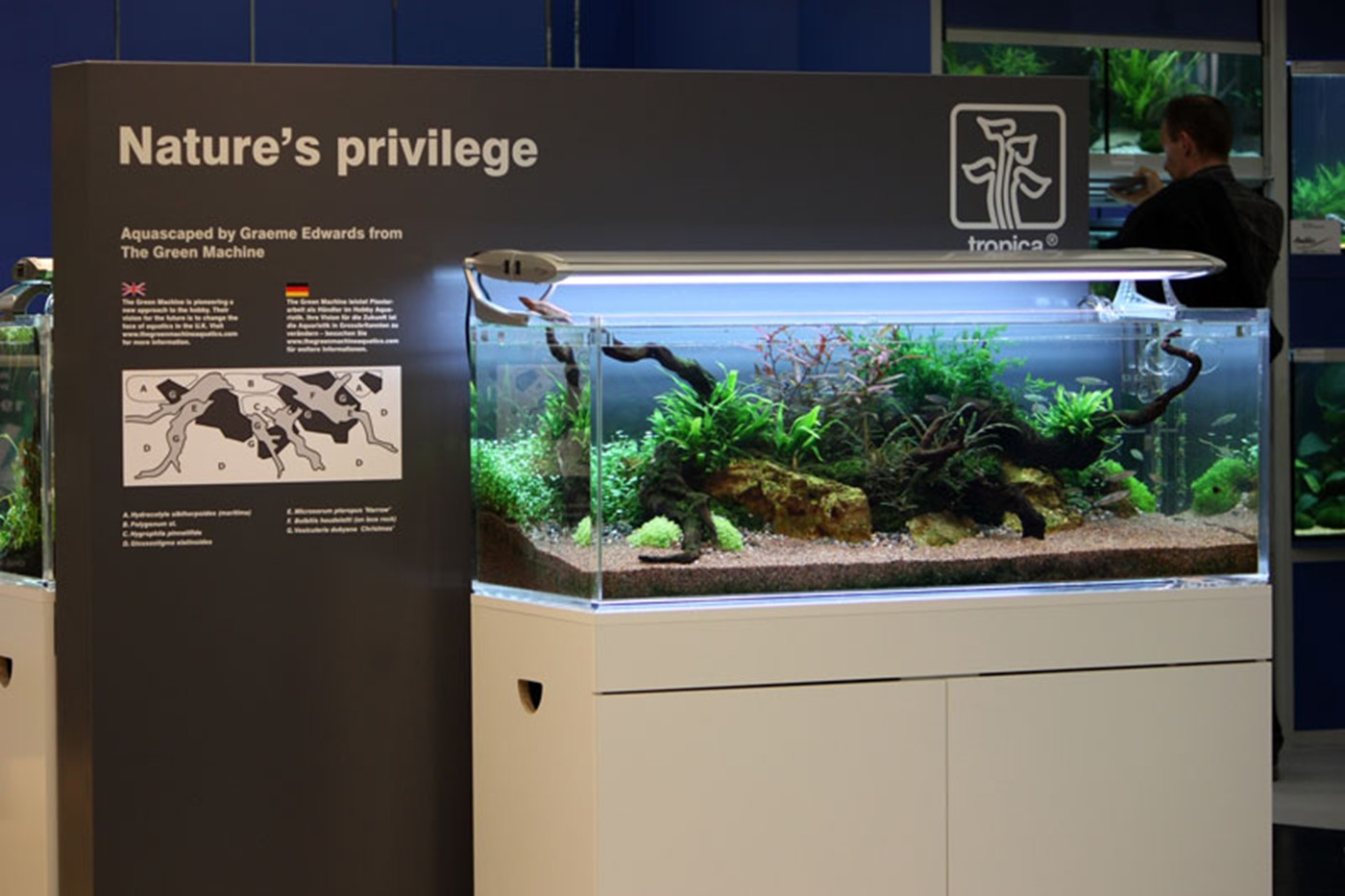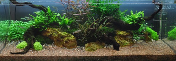 "Nature's Privilege" is aquascaped by Graeme Edwards from the UK Aquatic Plant Society (UKAPS) and is inspired by impressions from nature in the north-western part of England. It is the vigorous green carpet of Marsilea in the foreground and with a central rock formation where roots run from cracks in the rocks. Between the rock and the carpet smaller rock pieces are covered with Christmas moss. Centrally in the rock formation, groups with Polygonum and Hygrophila pinnatifida are placed, and Micorosorum and Bolbitis are attached to the roots. Small portions of Eleocharis simulate grass from nature. Hydrocotyle runs over the ground on the rear sides of the rock formation.