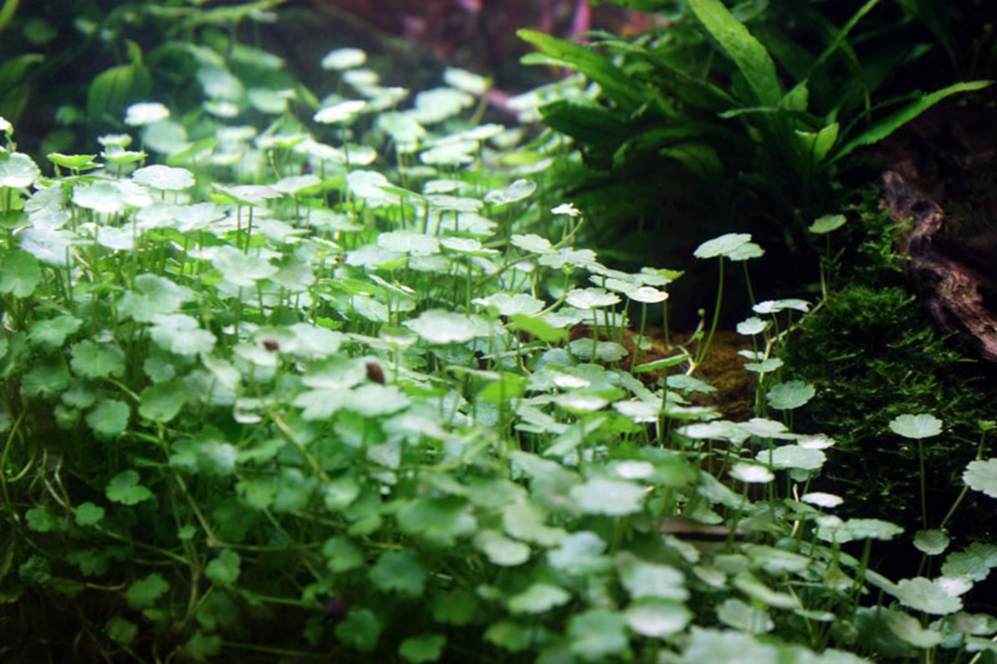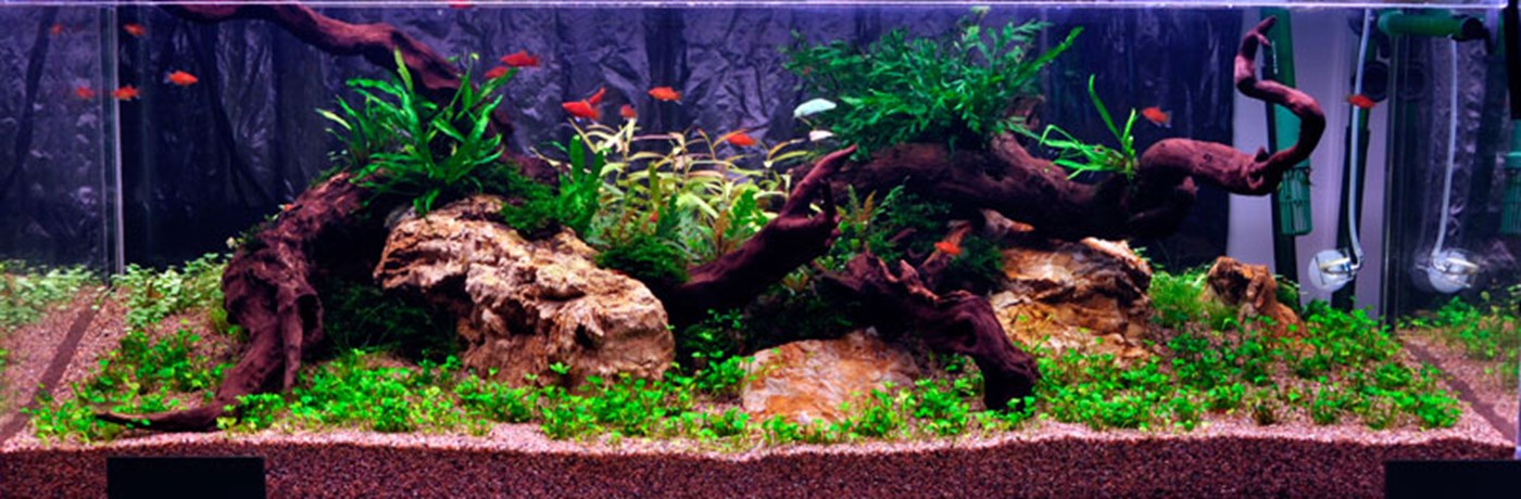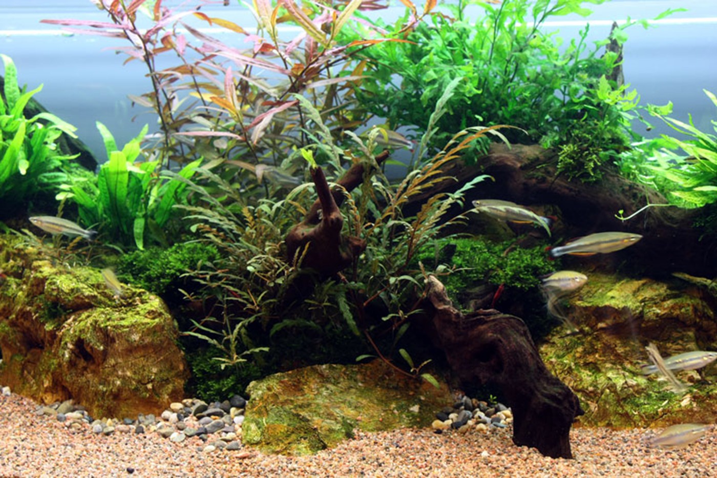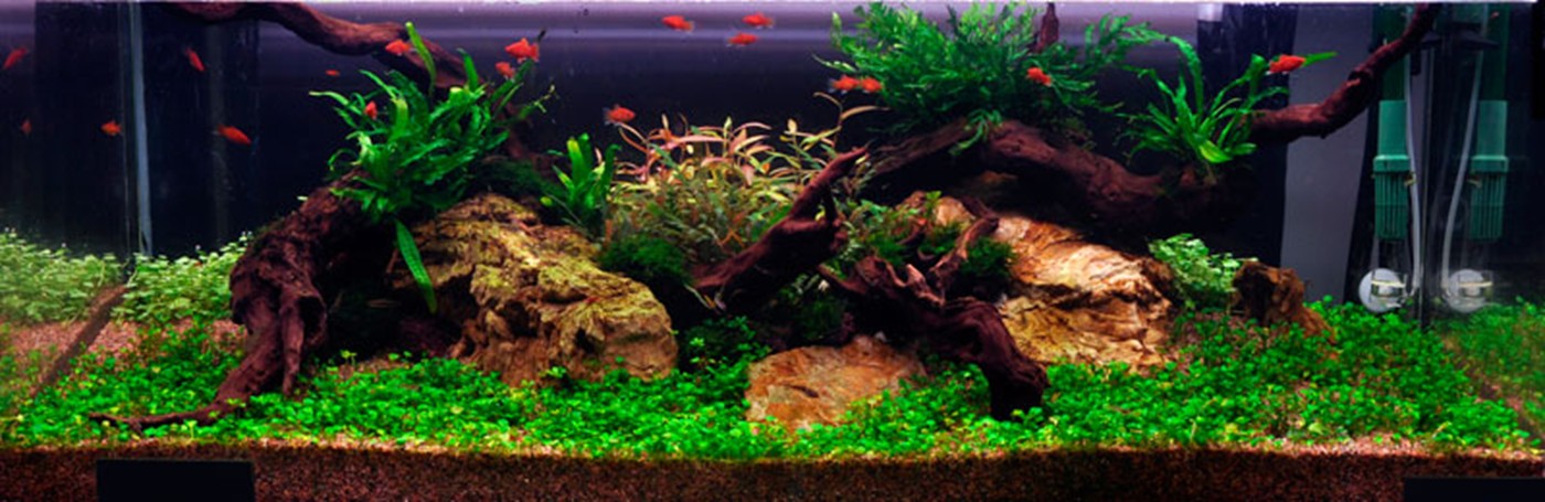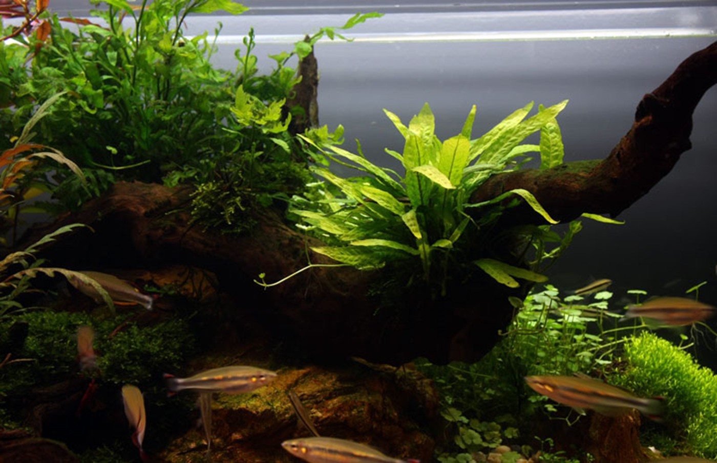 "Nature's Privilege" is aquascaped by Graeme Edwards from the UK Aquatic Plant Society (UKAPS) and is inspired by impressions from nature in the north-western part of England. It is the vigorous green carpet of Marsilea in the foreground and with a central rock formation where roots run from cracks in the rocks. Between the rock and the carpet smaller rock pieces are covered with Christmas moss. Centrally in the rock formation, groups with Polygonum and Hygrophila pinnatifida are placed, and Micorosorum and Bolbitis are attached to the roots. Small portions of Eleocharis simulate grass from nature. Hydrocotyle runs over the ground on the rear sides of the rock formation.