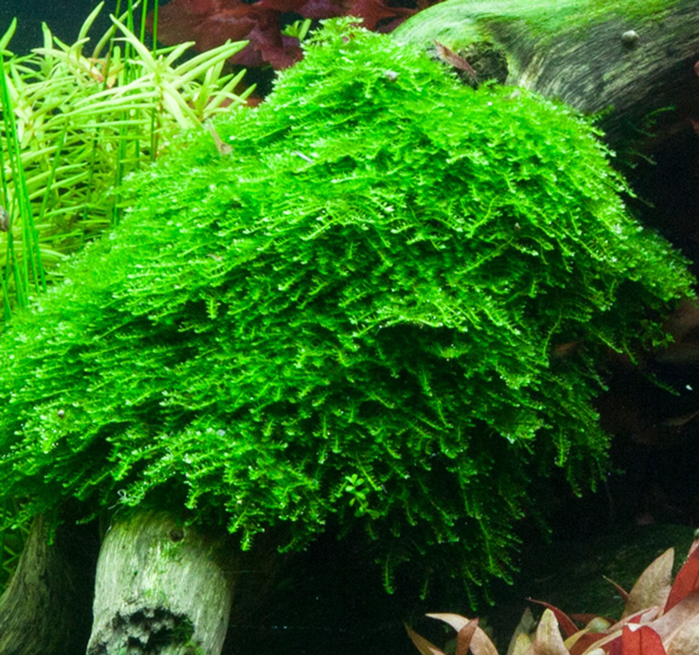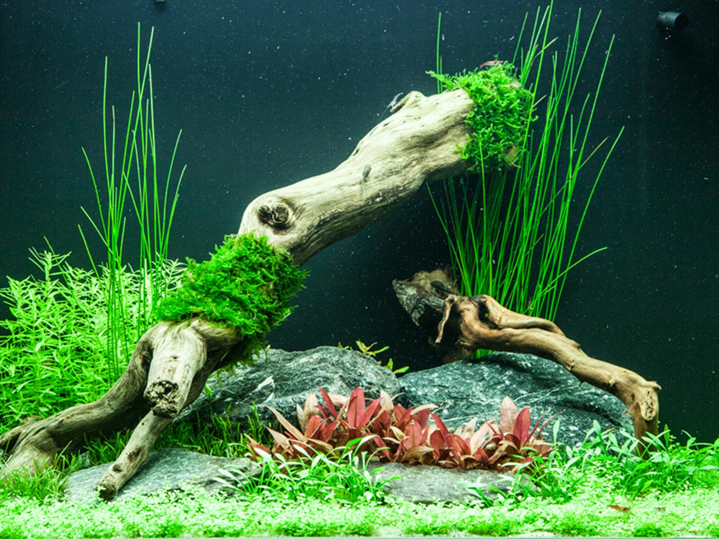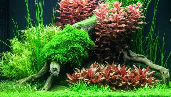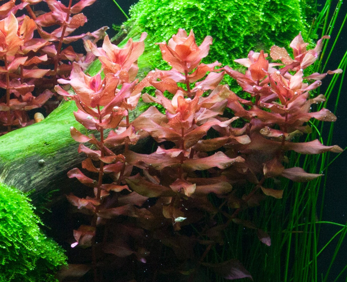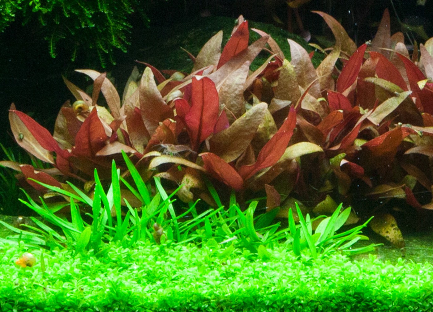 Red groups of Rotala macrandra and Alternanthera 'Mini' create focus plants in various shades of green - see video for a close up on the macrandra. The central tree root with mounted Christmas moss makes the aquarium look older, while the fresh green carpet of Cuba Hemianthus gives a light and friendly impression. Here, we used both Lilaeopsis and Cryptocoryne parva to break the passage between the central island and the front carpet. The darker green leaves of the Lilaeopsis and parva work well with the light green Hemianthus.