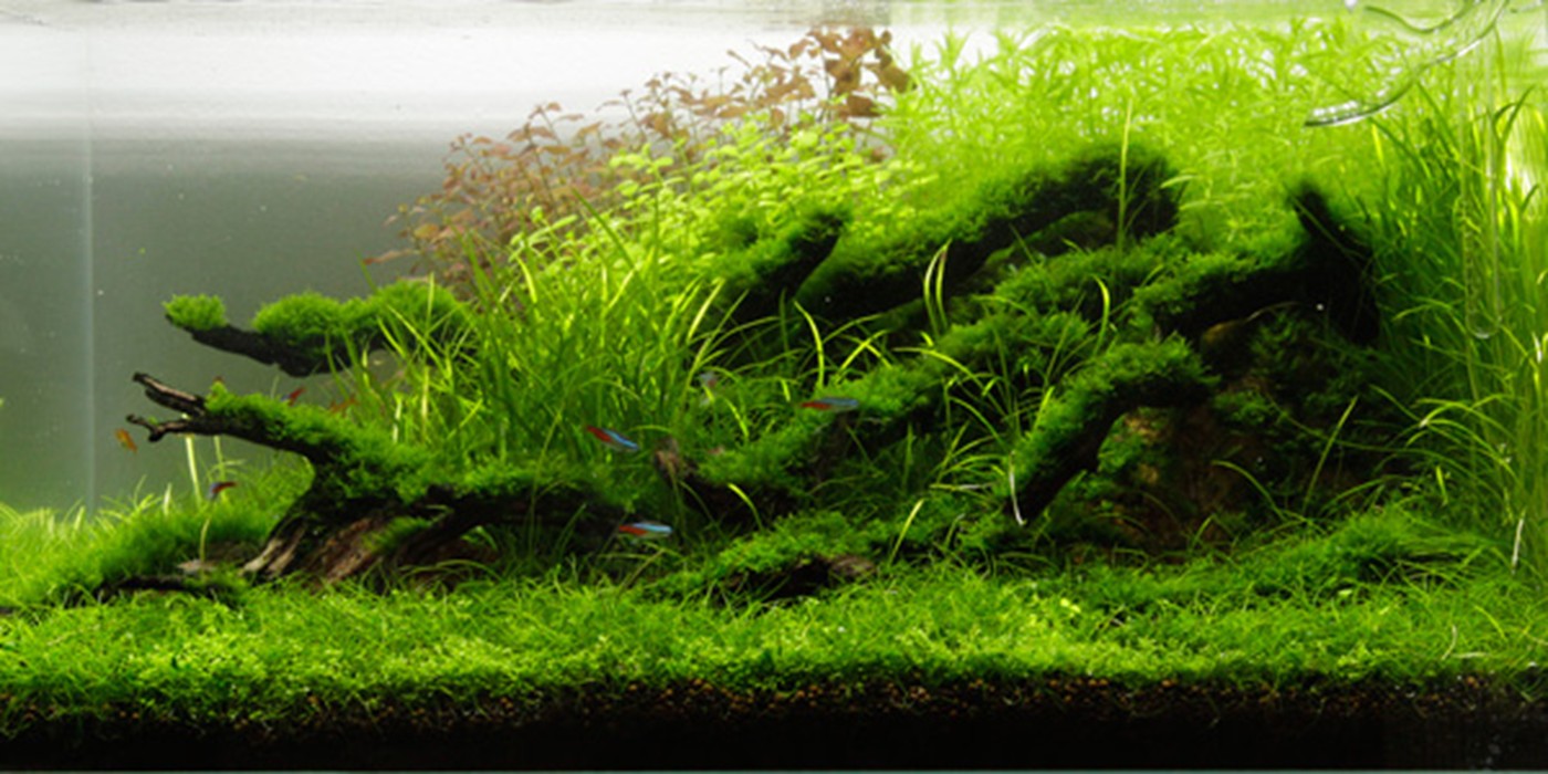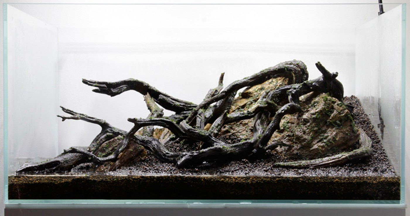 I originally was going to go for a rock-based design (Iwagumi) but eventually decided to use Manzanita Wood and Petrified Wood. I really wanted to try out a technique that I had recently heard about with moss. The moss is chopped up into very fine pieces then attached to the décor and grown out of water but in a humid environment.