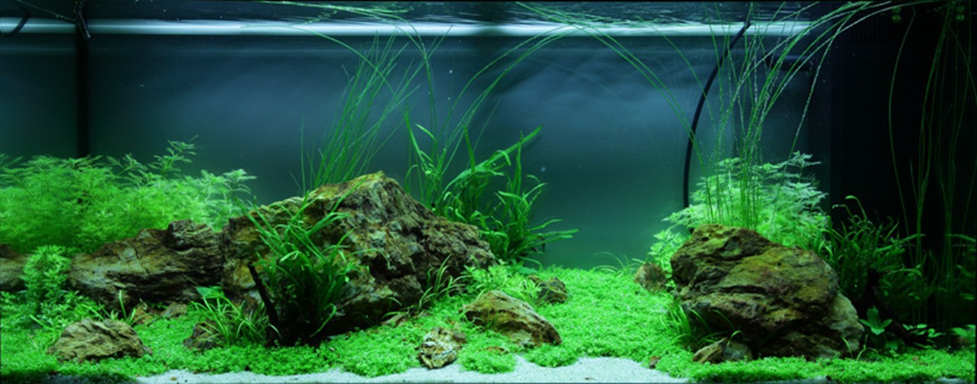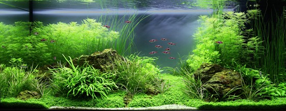 Close vegetation of Myriophyllum Mattogrossense and the high Eleocharis sp., make the background look elegant. Massive cliffs, surrounded by Hottonia, Staurogyne and Microsorum. A wide valley of Cuba-Hemianthus, mixed with Echinodorus Tenellus lead through smaller cliffs to the fine, light sandy shore. Please, go for a swim!