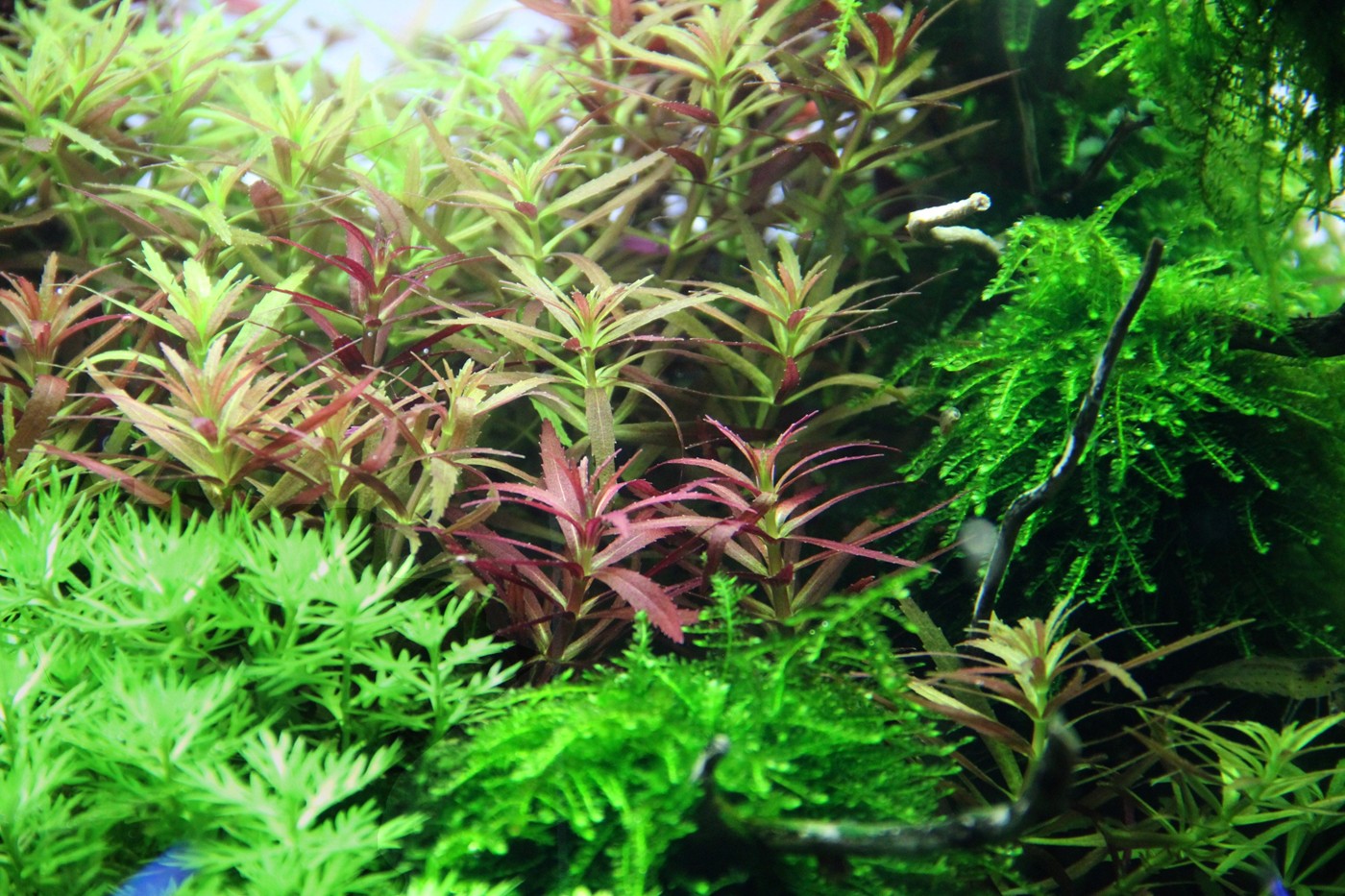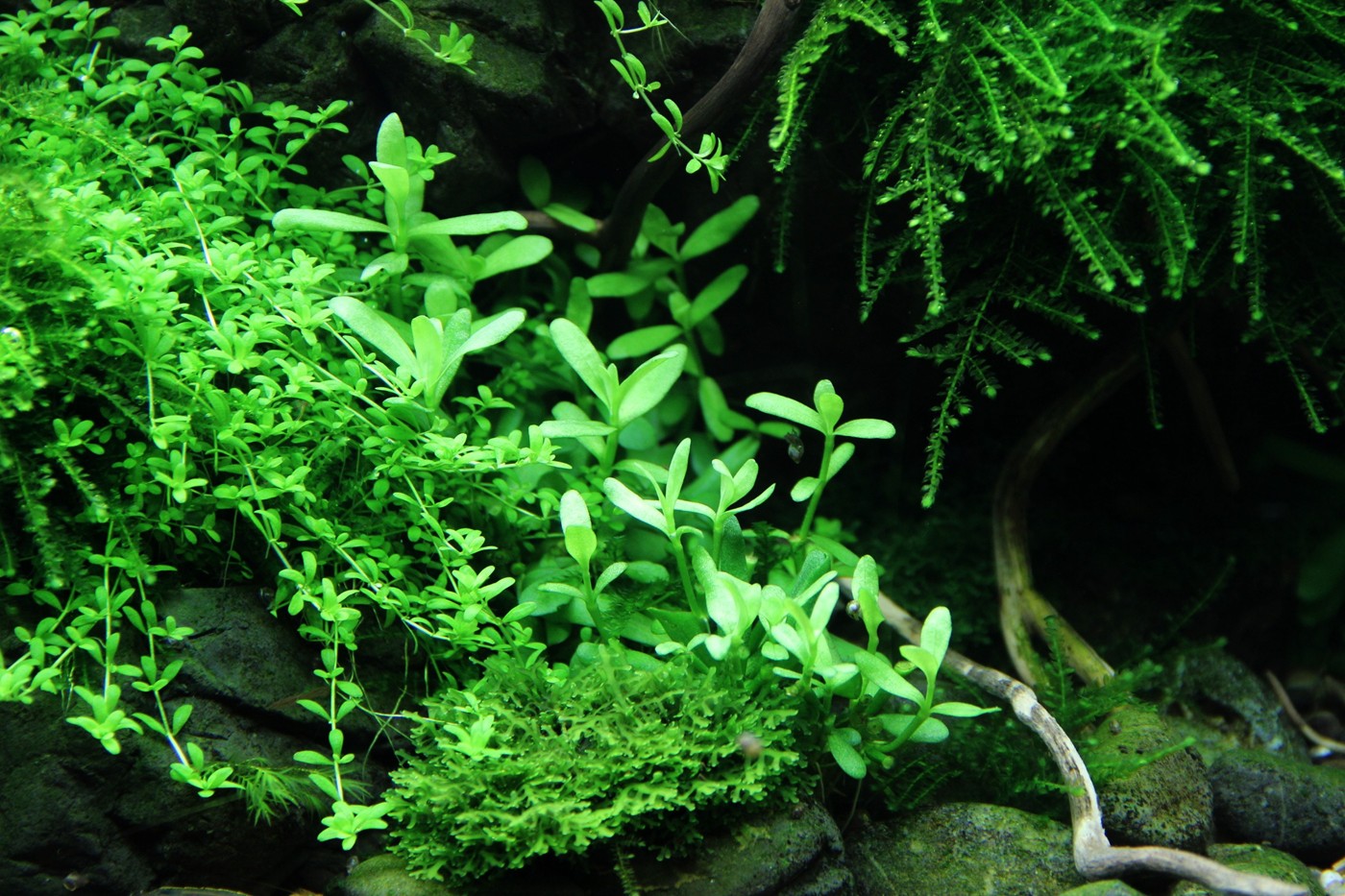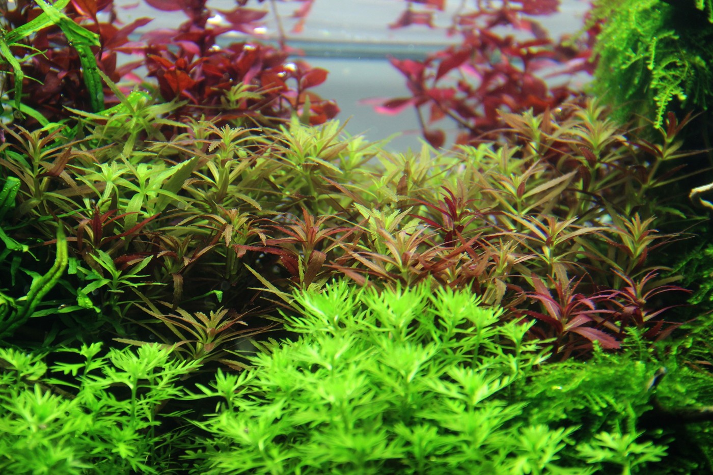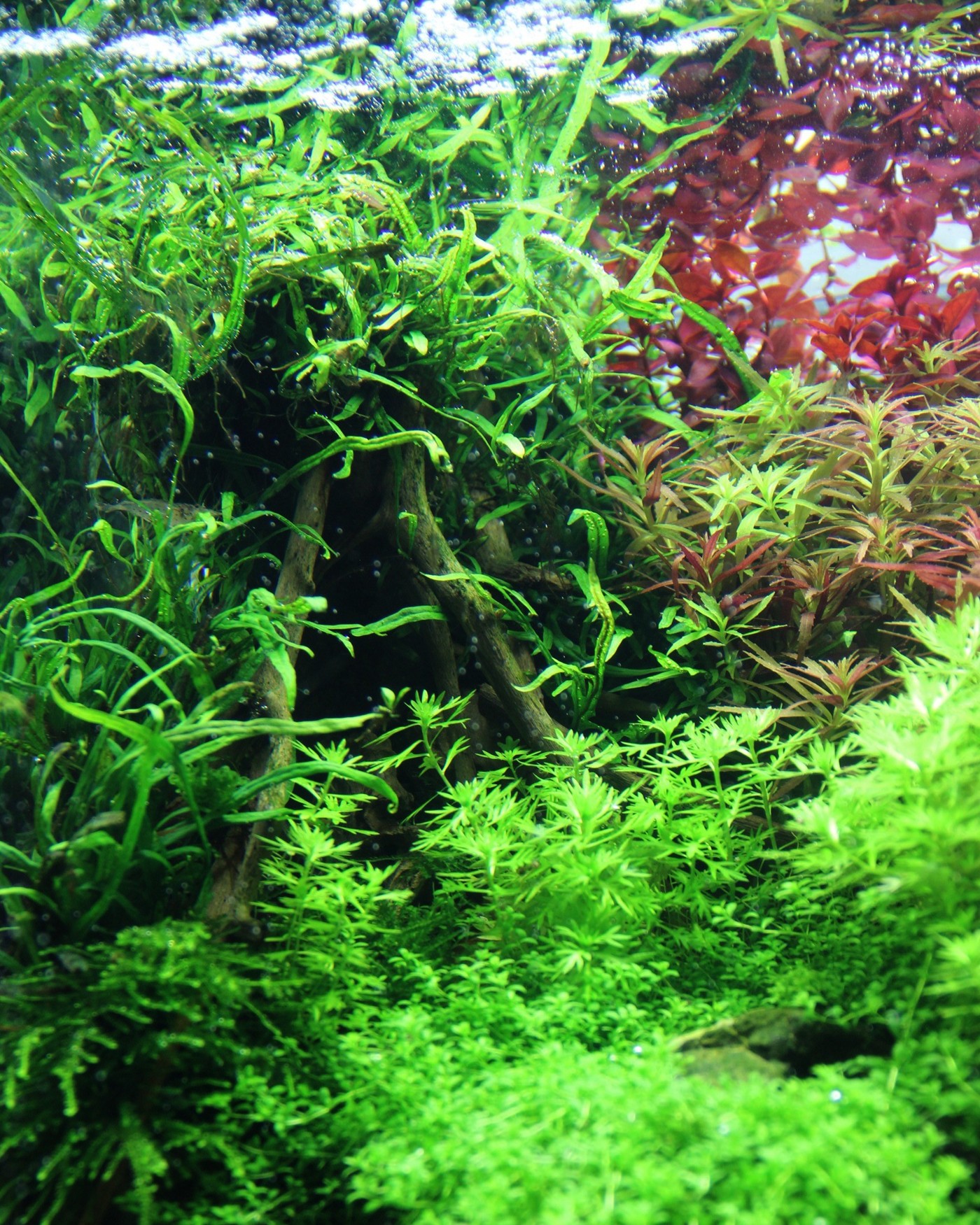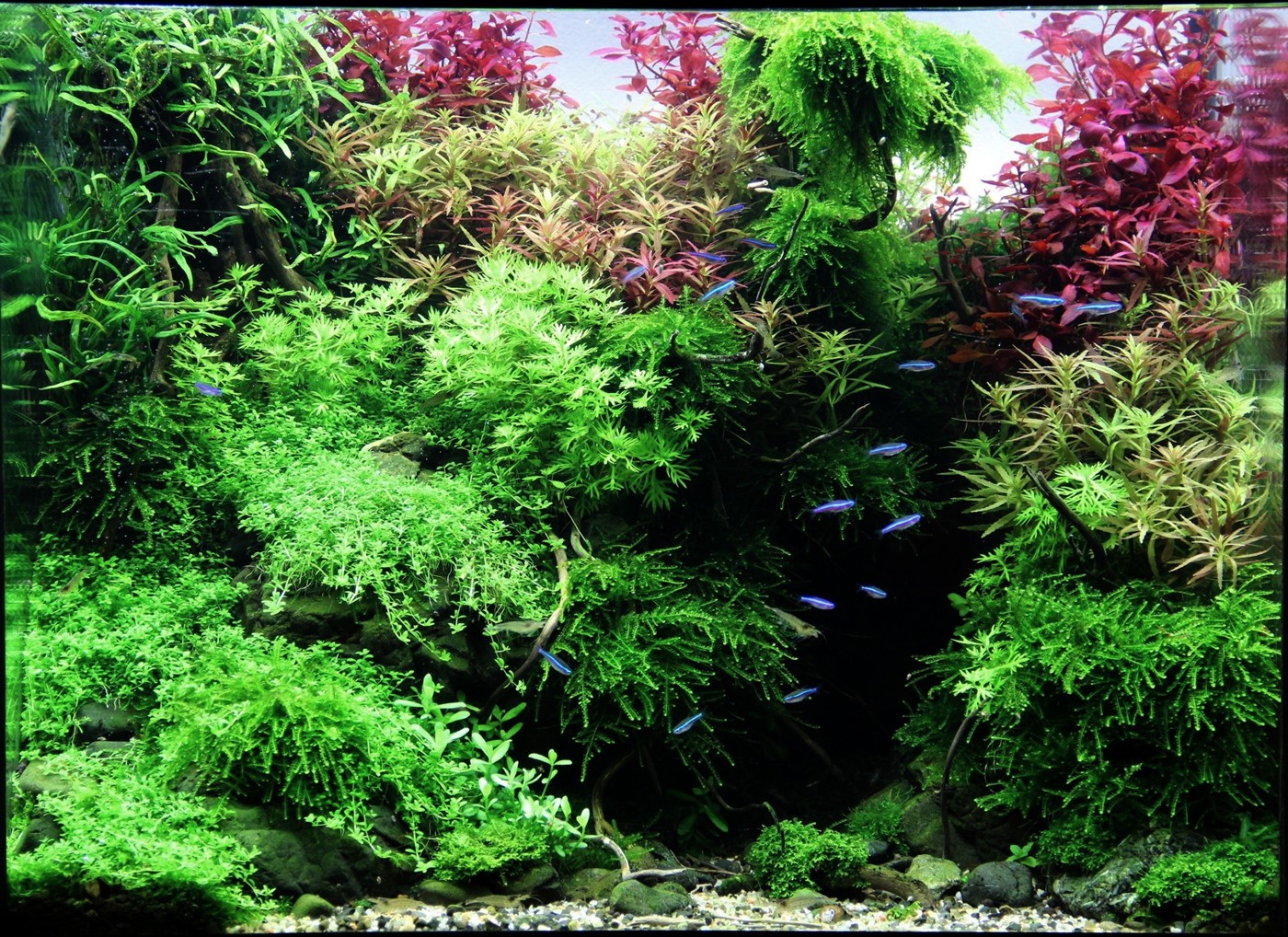 This is a tank I basically started to "test" some plants. The starting point was a triangular hardscape, which evolved a lot throughout the tank's life. In the beginning it had a hill dominated by a tree and below this a dead tree hanging over a river. Gradually it transformed into a coloured jungle with a dark entry letting the imagination wander…