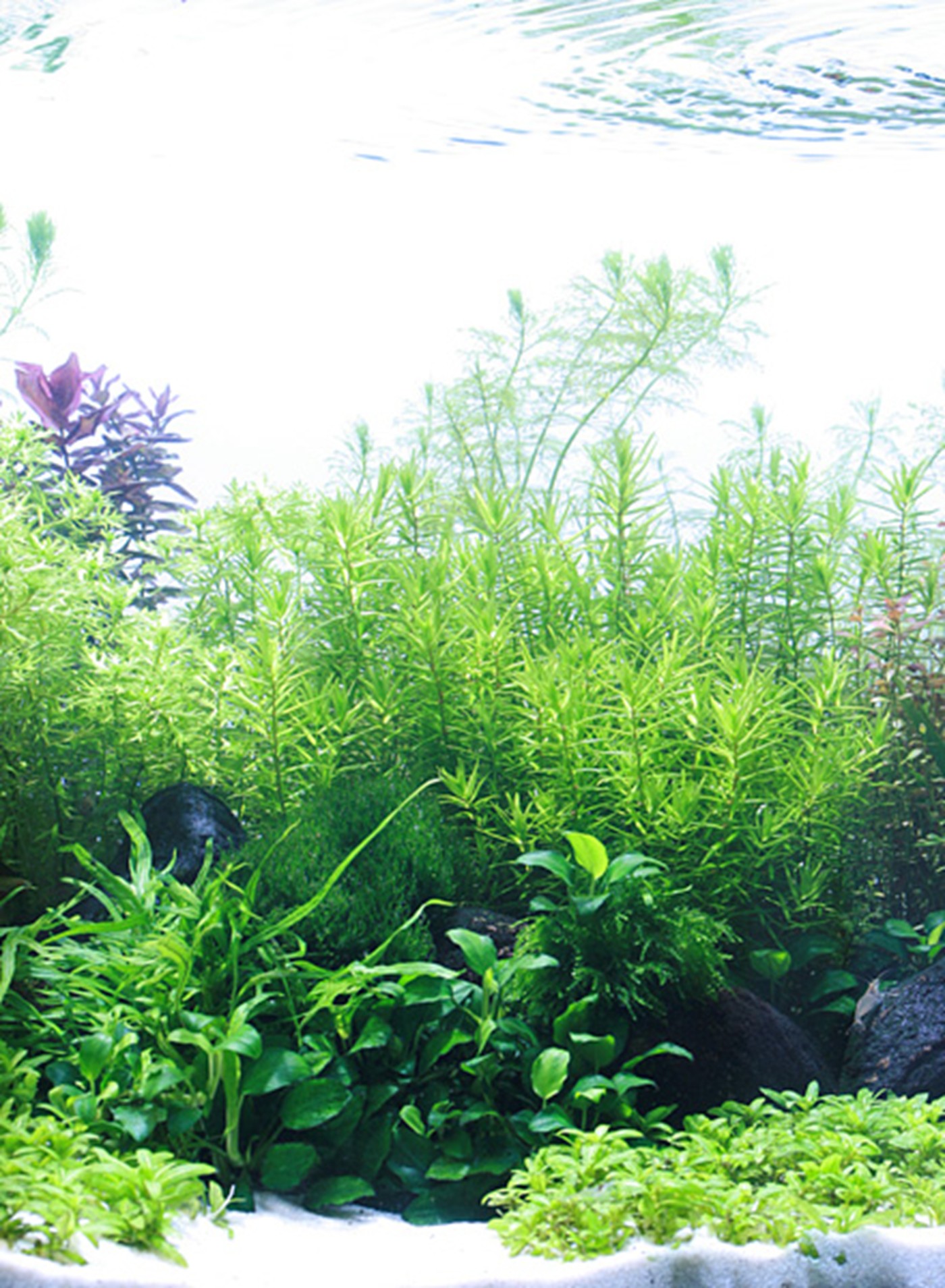 Between the big rocks, Vesicularia ferriei 'Weeping' comes rolling like small waterfalls, tumbling to the sea from inside the dark jungle.
