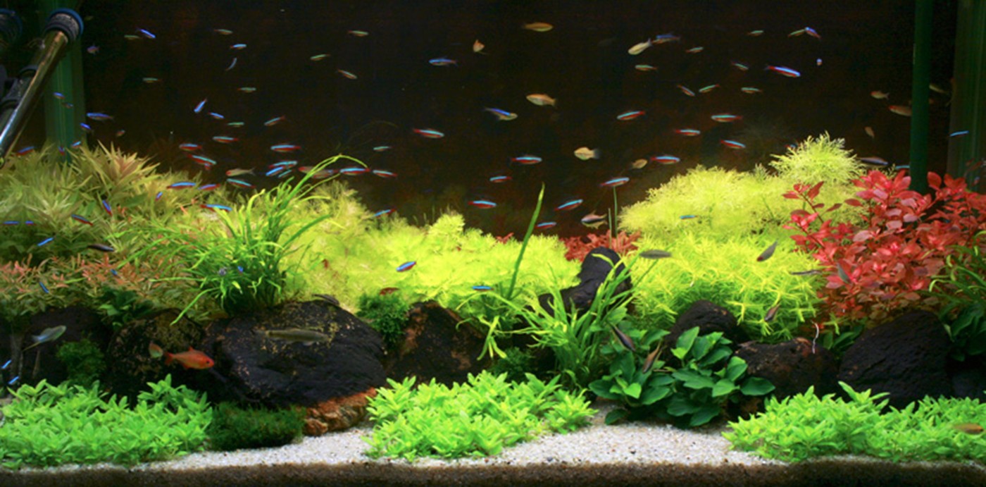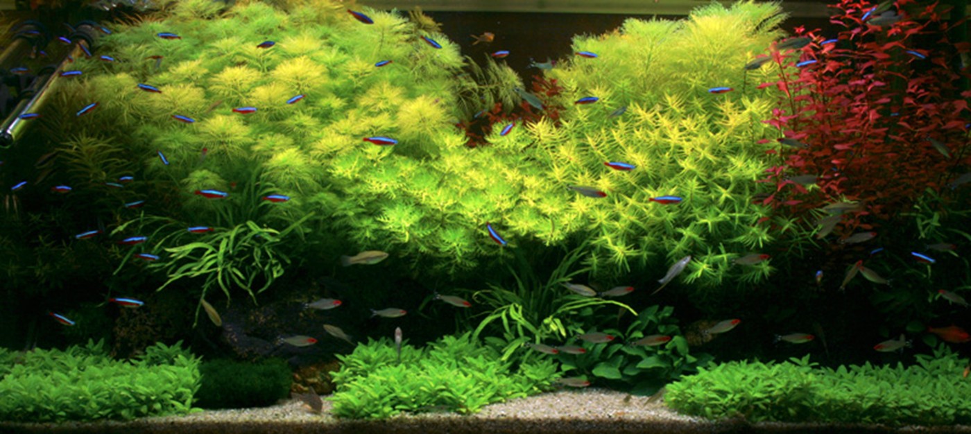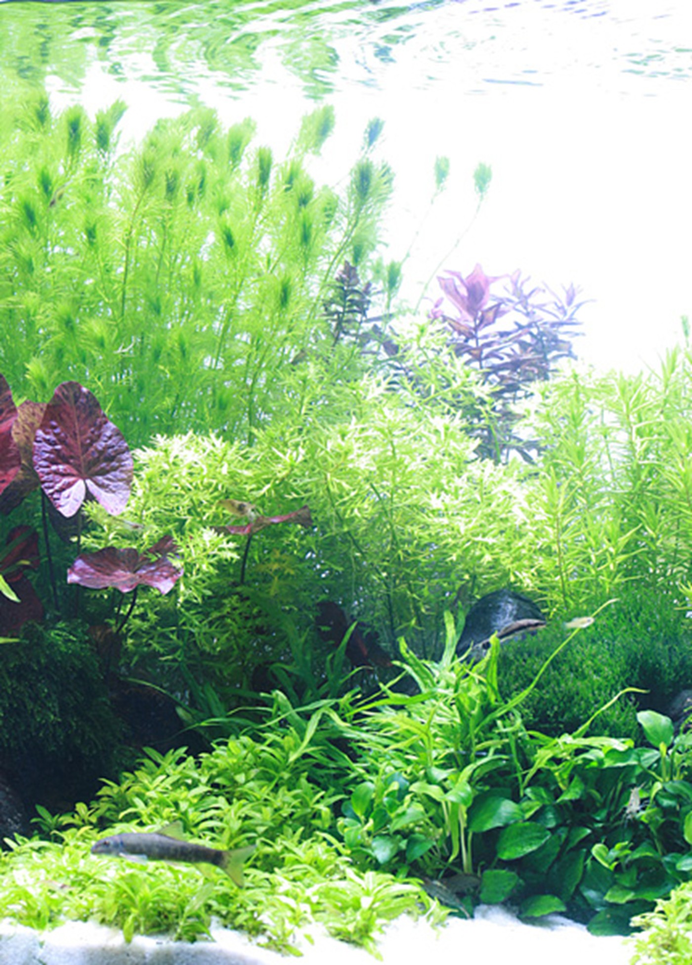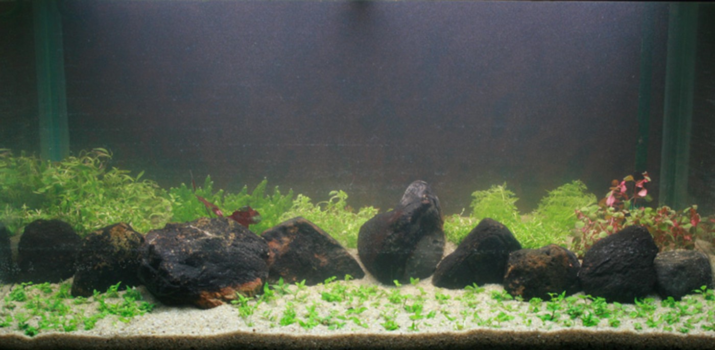 The plants in front are sloping a bit from left to right, in order to offer the viewer, who naturally sees this aquarium from the right side of the room, a great perspective.