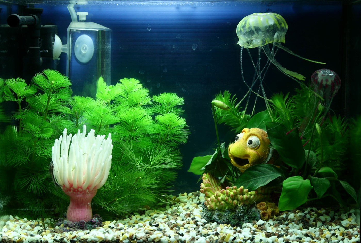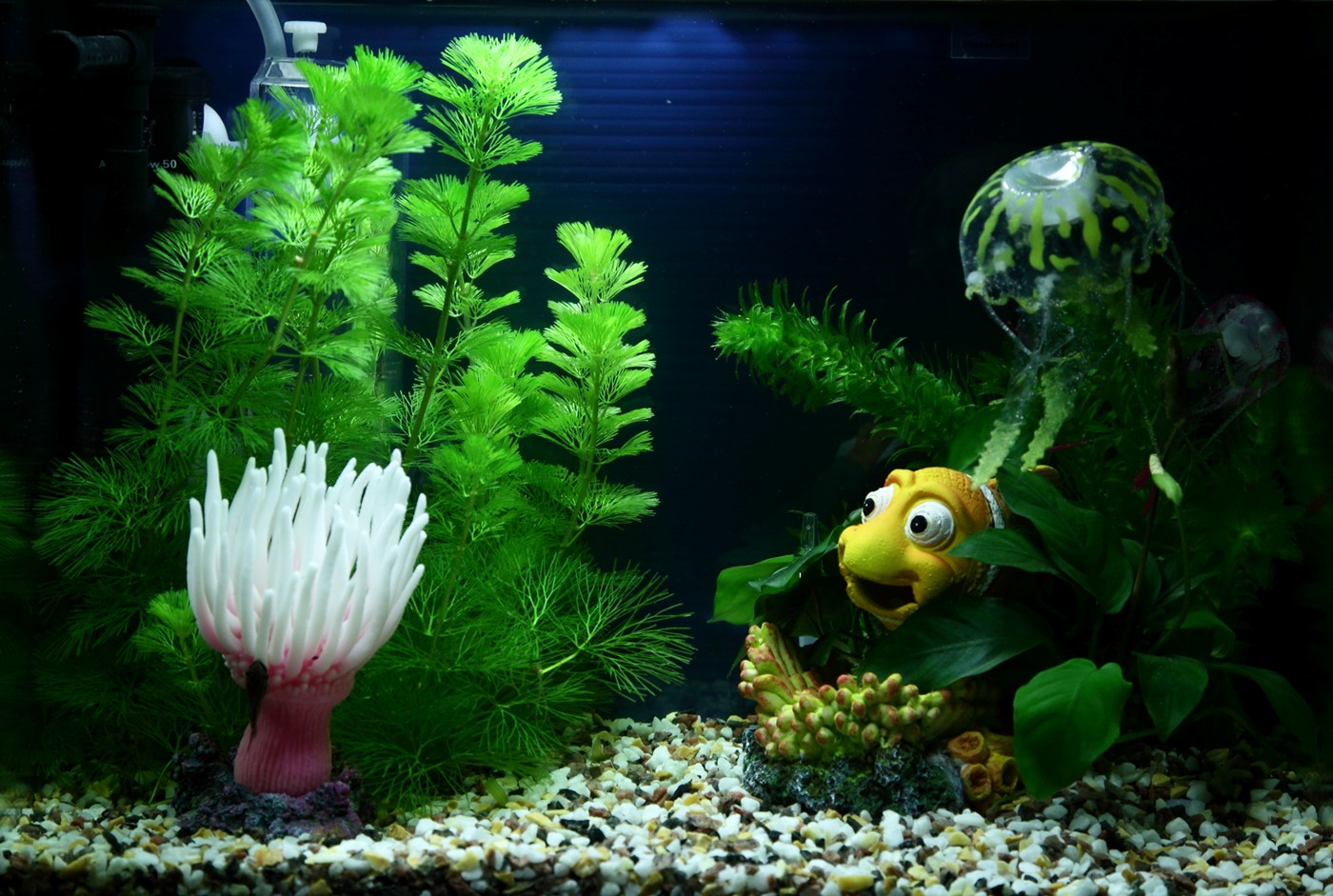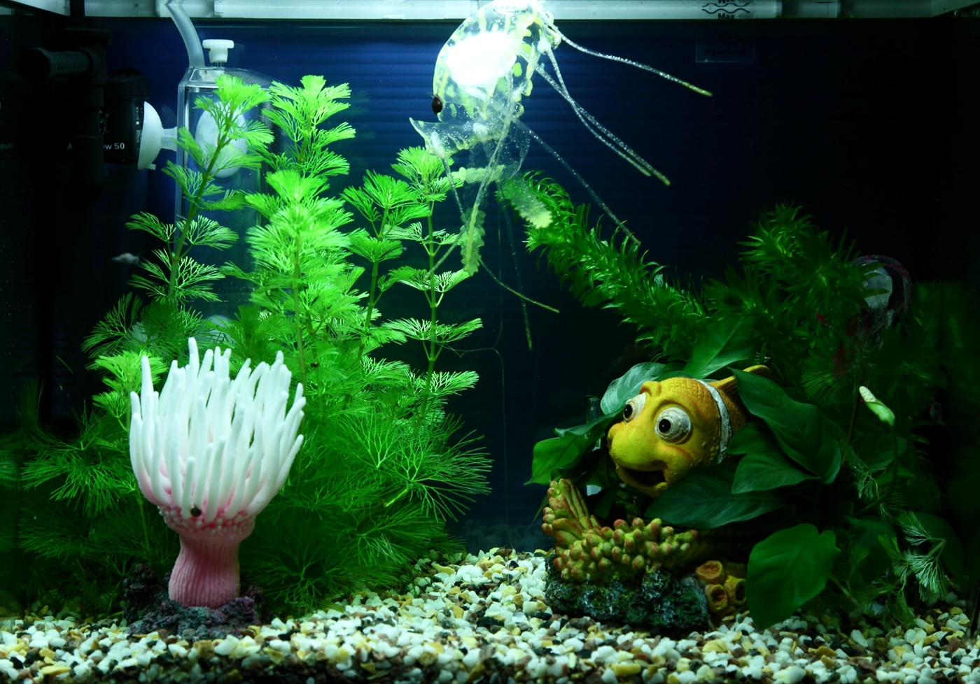 Nemo hides in two Anubias nana that are carefully attached on both sides of the figure. Cabomba caroliniana and Egeria densa are the easiest stem plants for the aquarium. Split the bundle into separate stems and plant them on the bottom layer. The stem grows steadily and is cut off 5-10cm over the bottom, when touching the surface. The cut off stem can be planted on the bottom layer to repeat the process.