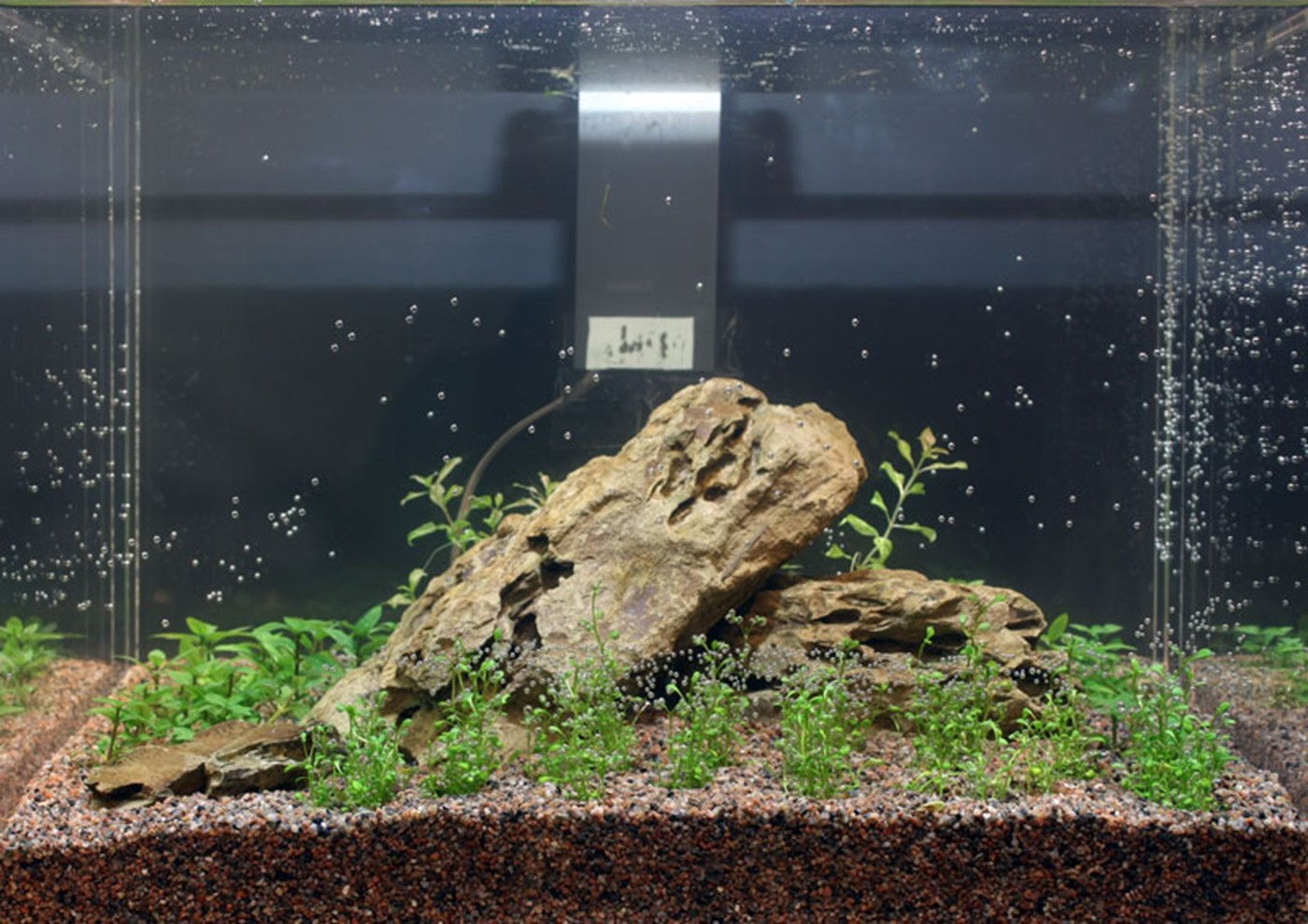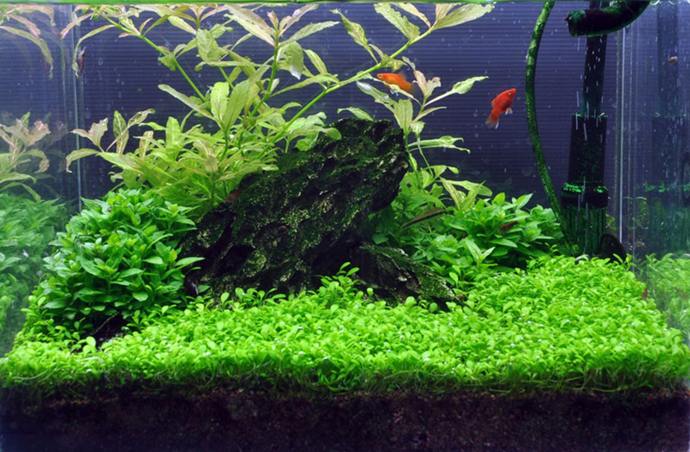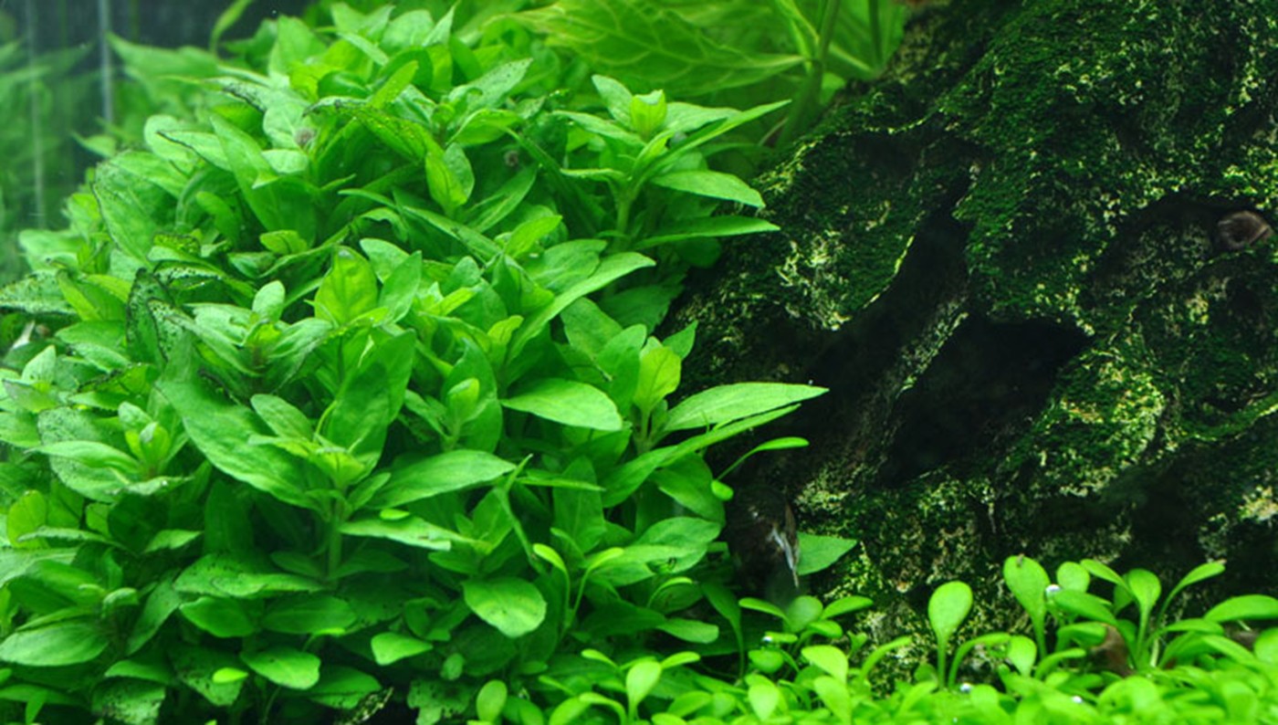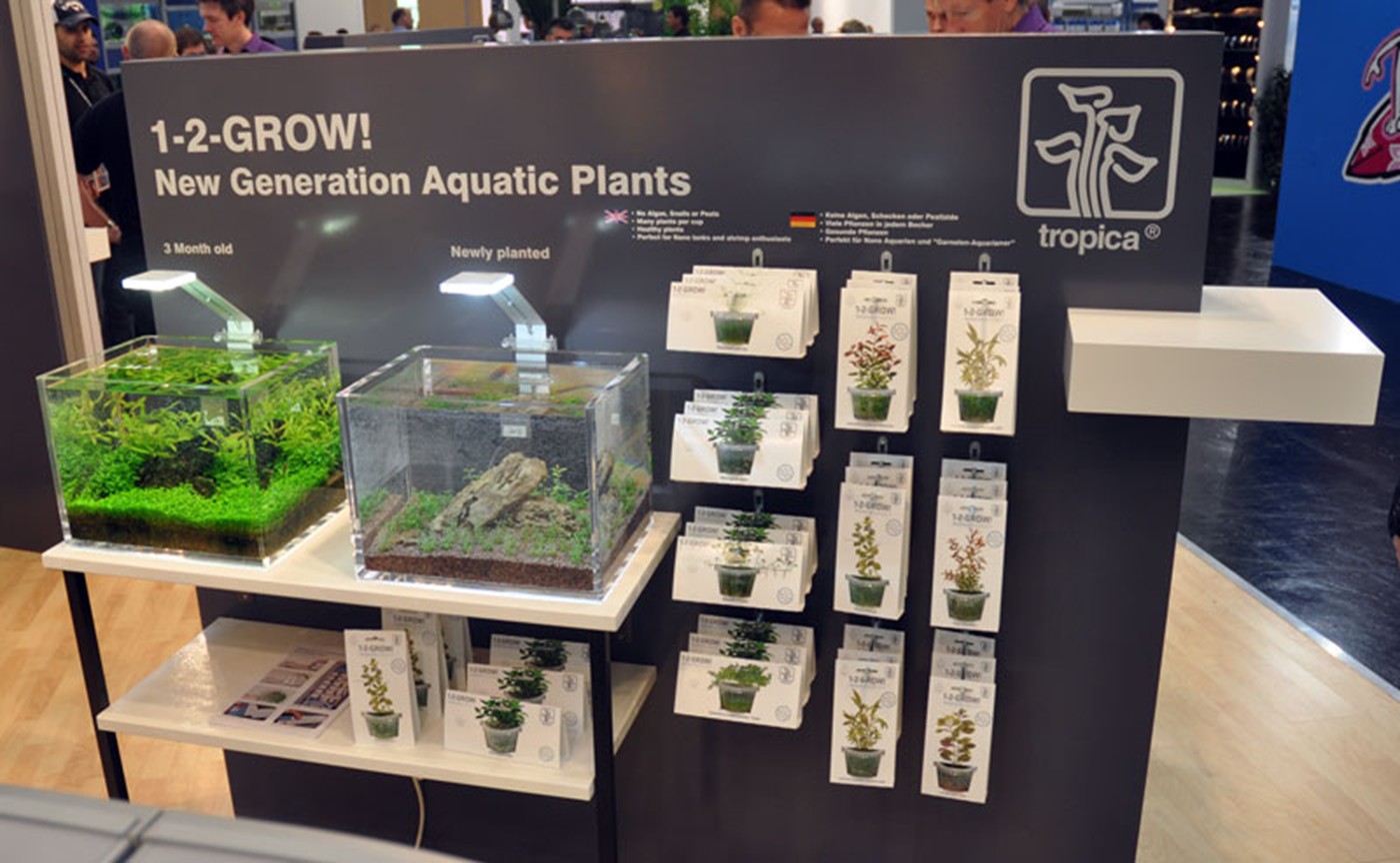 The 1-2-GROW! aquarium is a 30L aquarium with plants taken directly from our laboratory. When its vegetation was 3 months old, the aquarium was presented at Interzoo 2010 where we also exhibited the aquarium with newly-planted vegetation for a comparison of plant growth over time. The decoration of the aquarium is made up of three pieces of rock and Hygrophila 'Rosanervig' which is planted behind the rocks and creates a wonderful play of colours. Staurogyne grows on both sides of the rocks in dense, compact formations and a carpet of Glossostigma is cultivated in front. The 1-2-GROW! products are extremely well-suited also to smaller aquariums as their growth is more compact. Even if there are no algae present among the plants on planting, we still recommend that you use shrimps and algae-eating fish in order to continuously keep the aquarium free of algae.