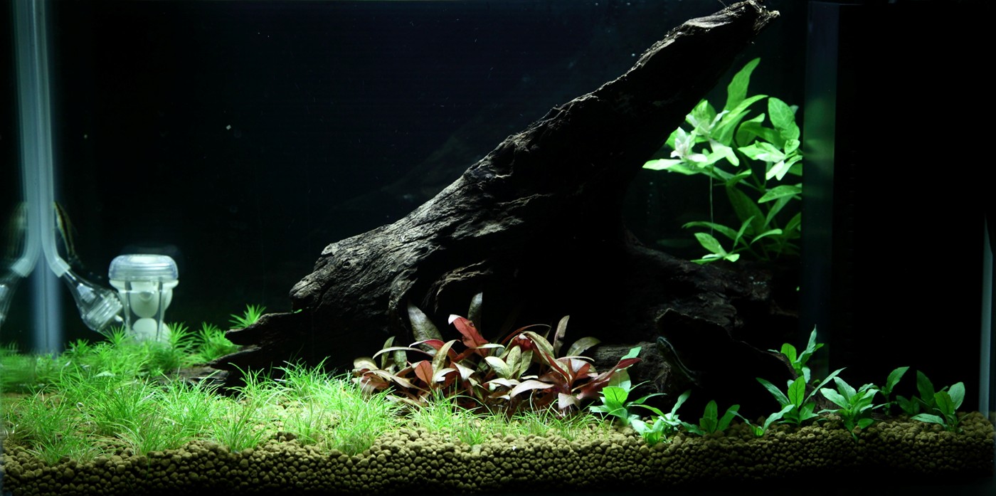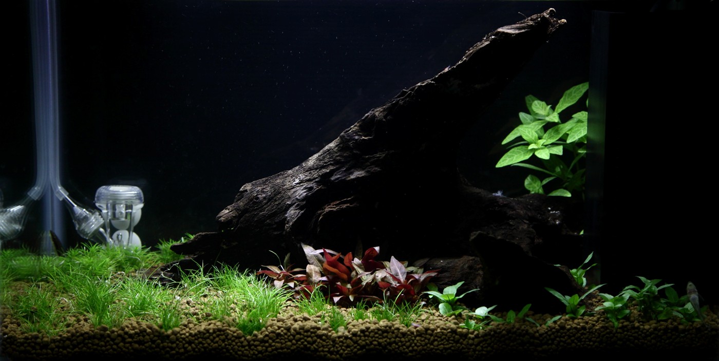 Light green Pogostemon erectus and Hygrophila 'Rosanervig' with pink streaks grow behind the mangrove root. In front, Eleocharis 'Mini' and Staurogyne create tight, low areas of vegetation.